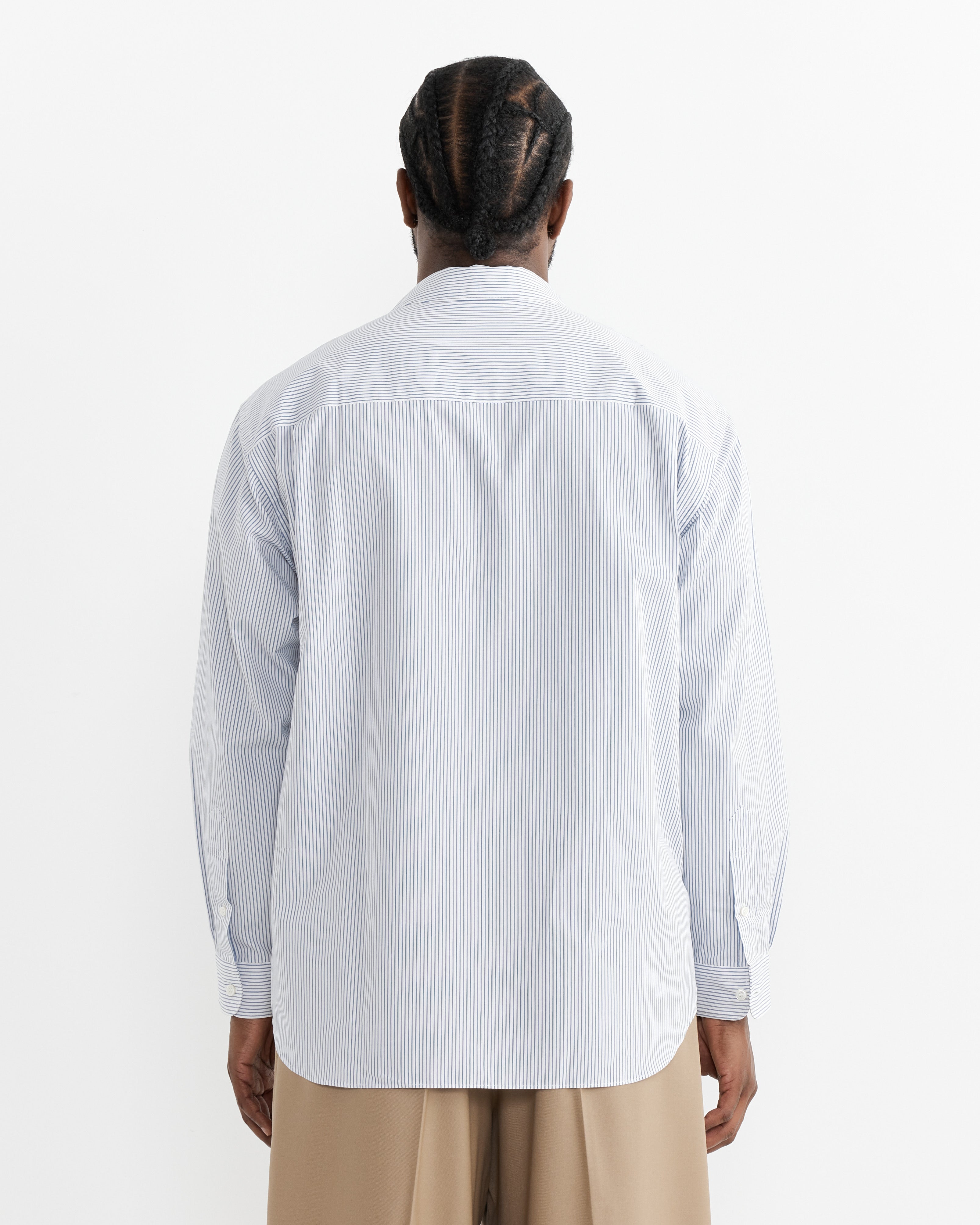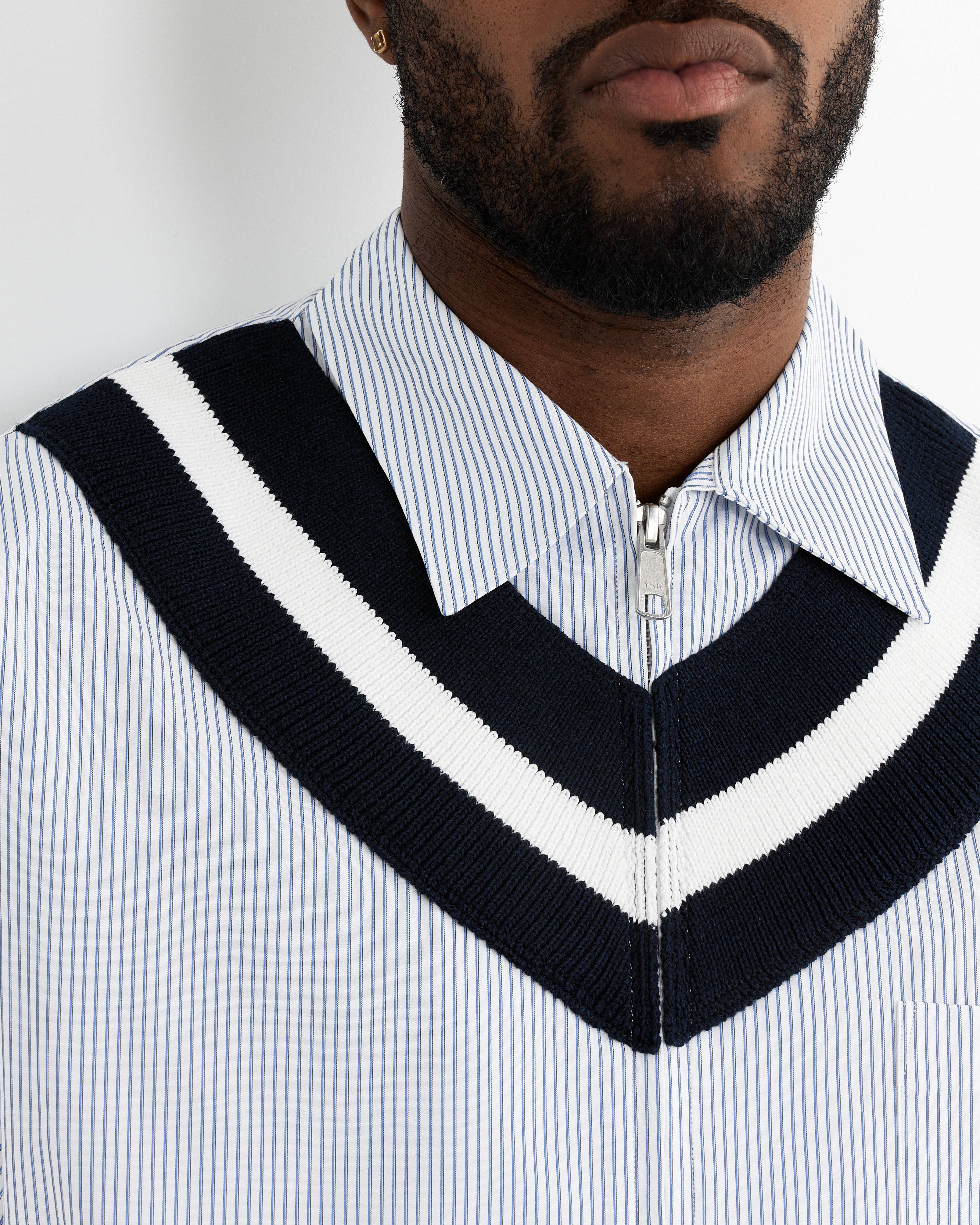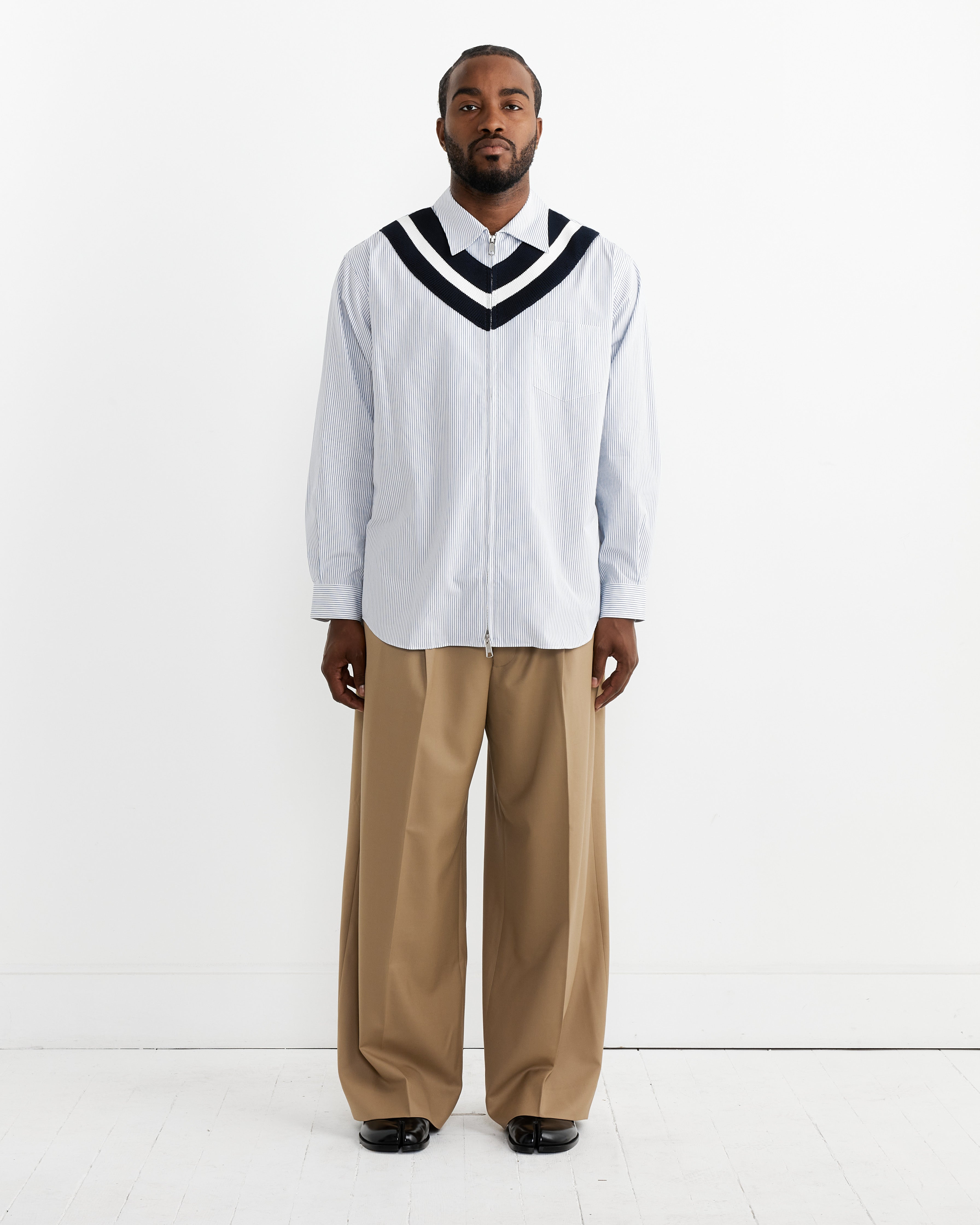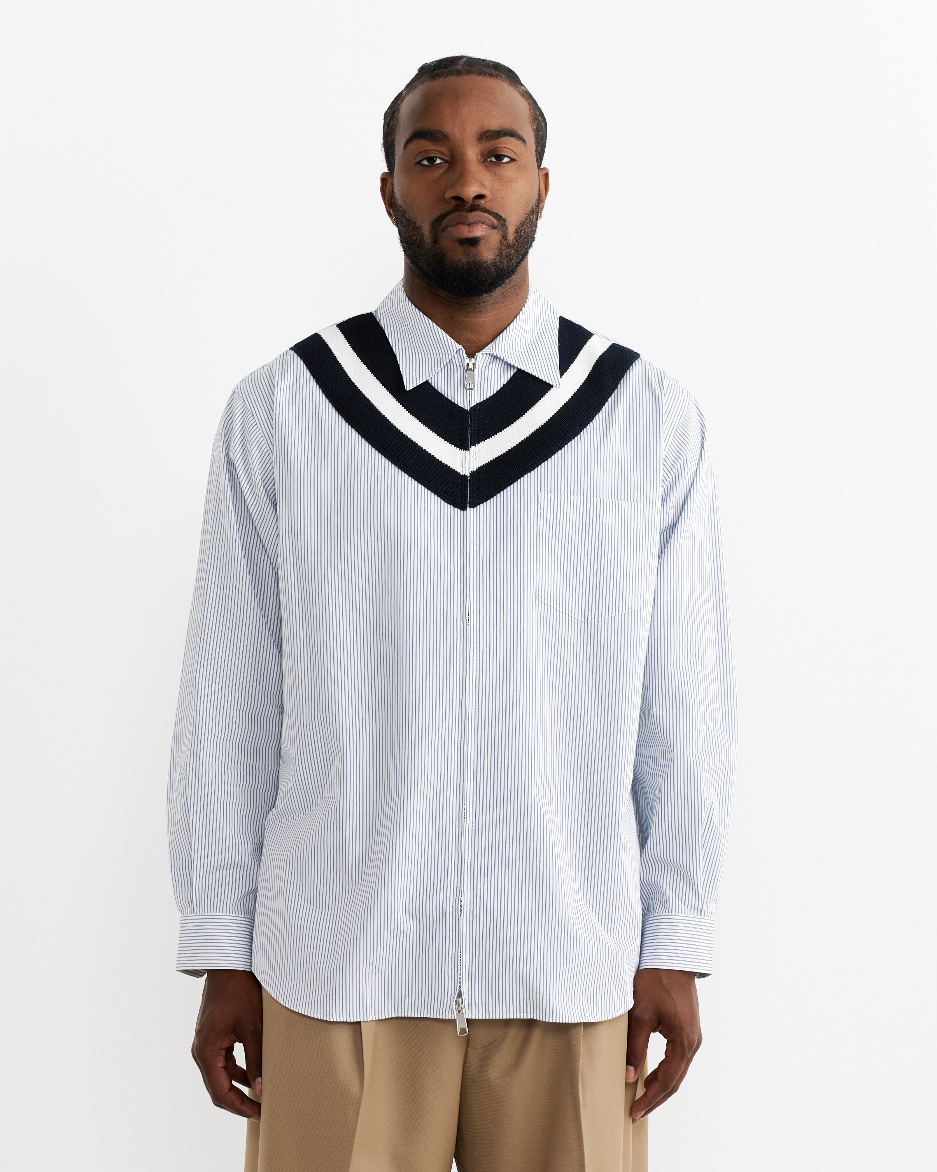Comme Des Garçons's Cotton Zip Shirt in White/Blue Stripe features a striped rib-knit chevron detail under its spread collar, a zip-front closure, and is cut in a straight silhouette with twin pleats at the back yoke and a shirttail hemline.