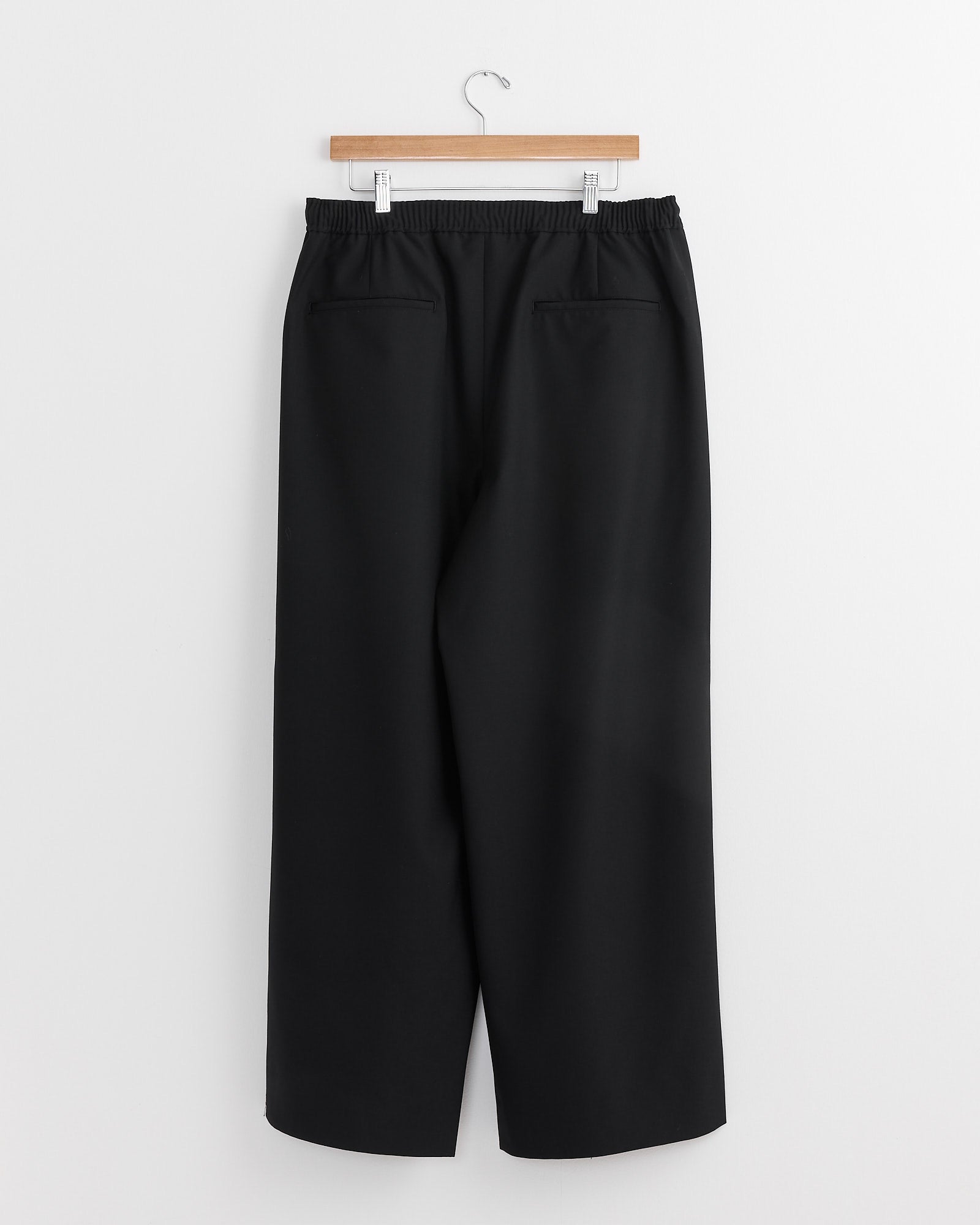 The Comme des Garçons Homme Pant in Black are tailored from wool gabardine for a structured yet comfortable fit. Designed with a concealed drawstring at the elasticized waistband, they offer an adjustable fit while maintaining a clean silhouette. Front pleats add subtle volume, and four-pocket styling enhances functionality. A versatile wardrobe staple with refined detailing.