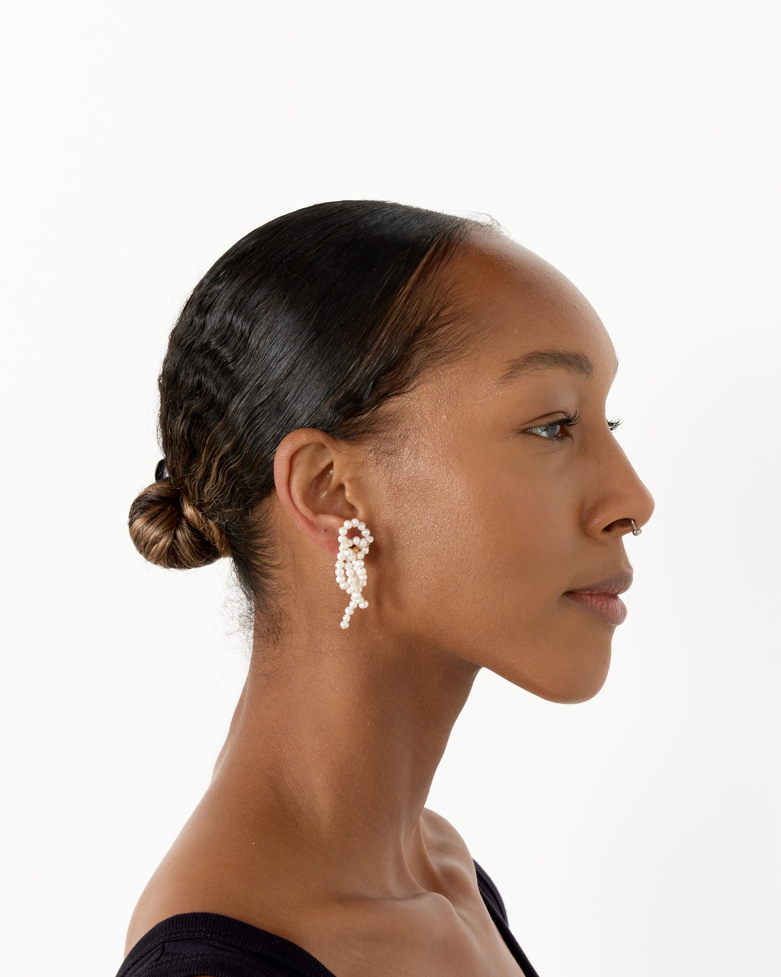 Completedworks' Freshwater Pearls Earrings feature 18k gold vermeil with mismatched strands of pearls and post-back fastening.