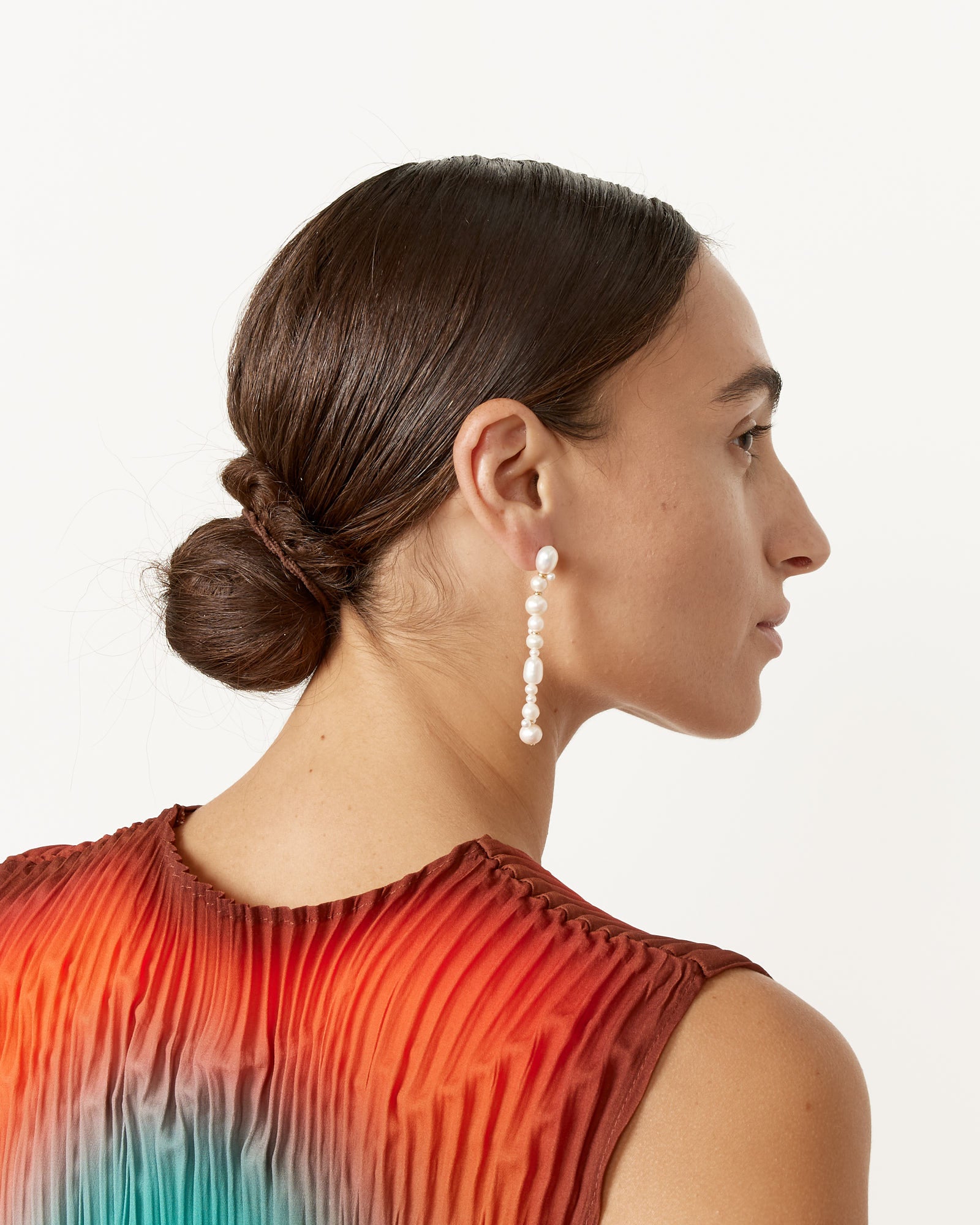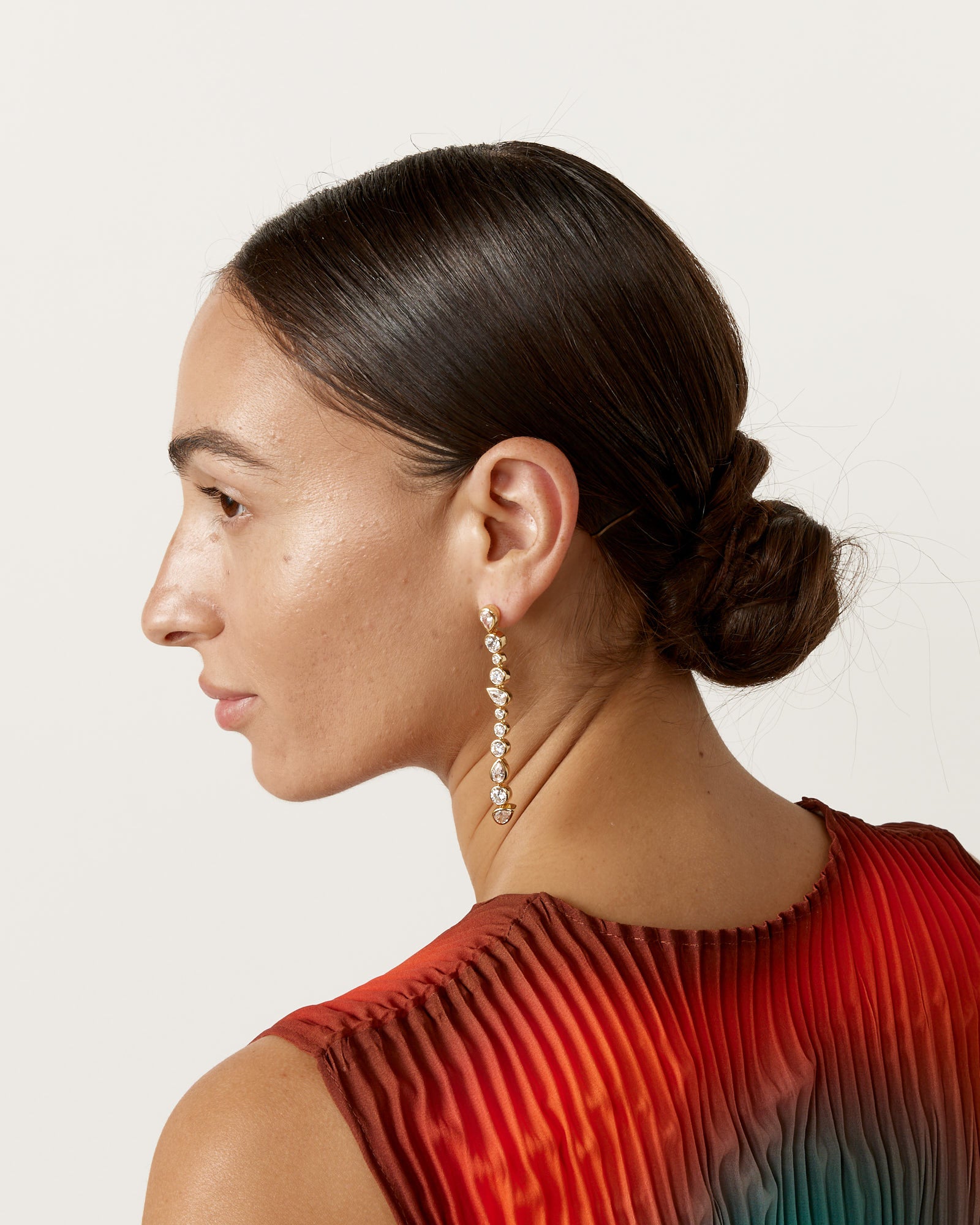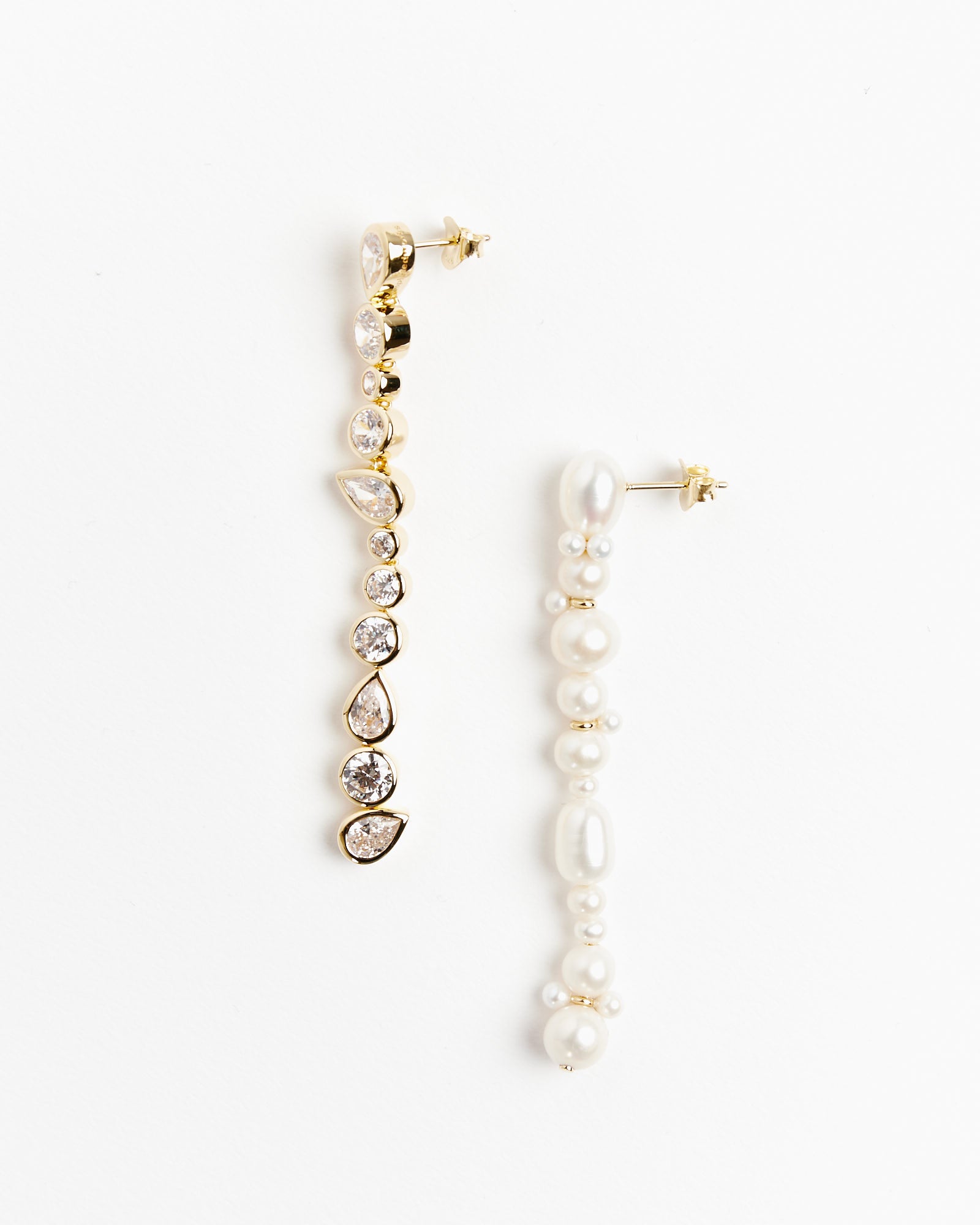 Completedworks' elegant Glitch Earrings are a handcrafted, mismatched pair featuring cubic zirconia gemstones set in gold vermeil at one ear, and a strand of white freshwater pearls at the other, both secured by posts with butterfly backs.