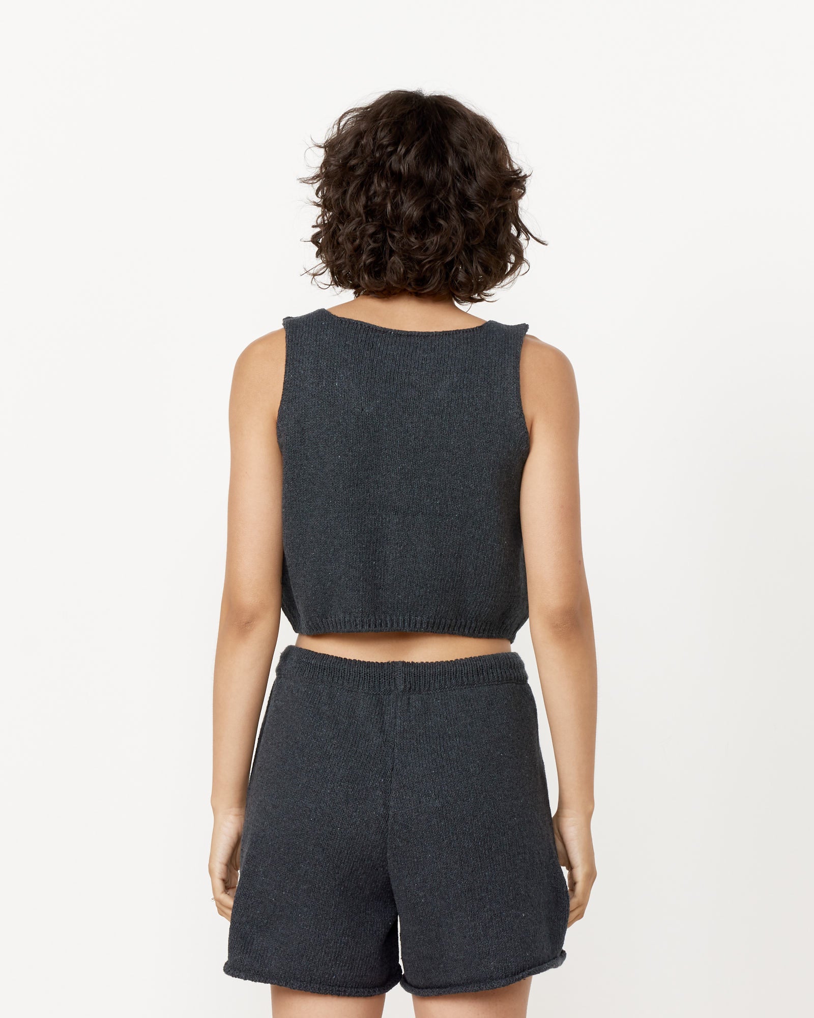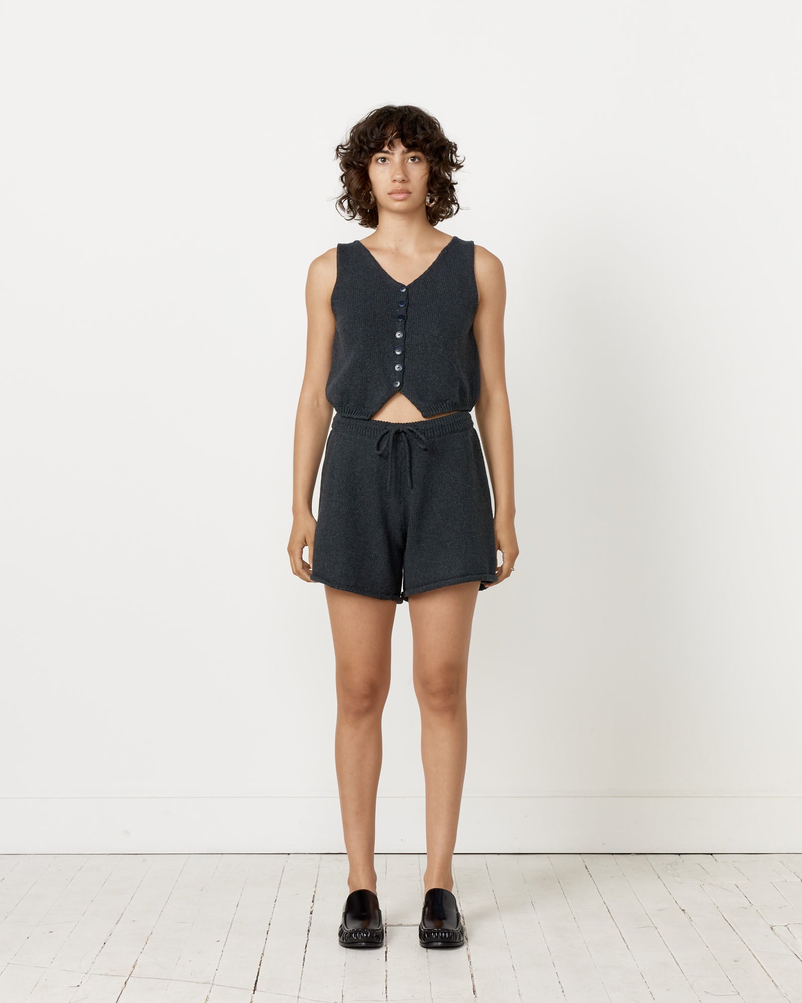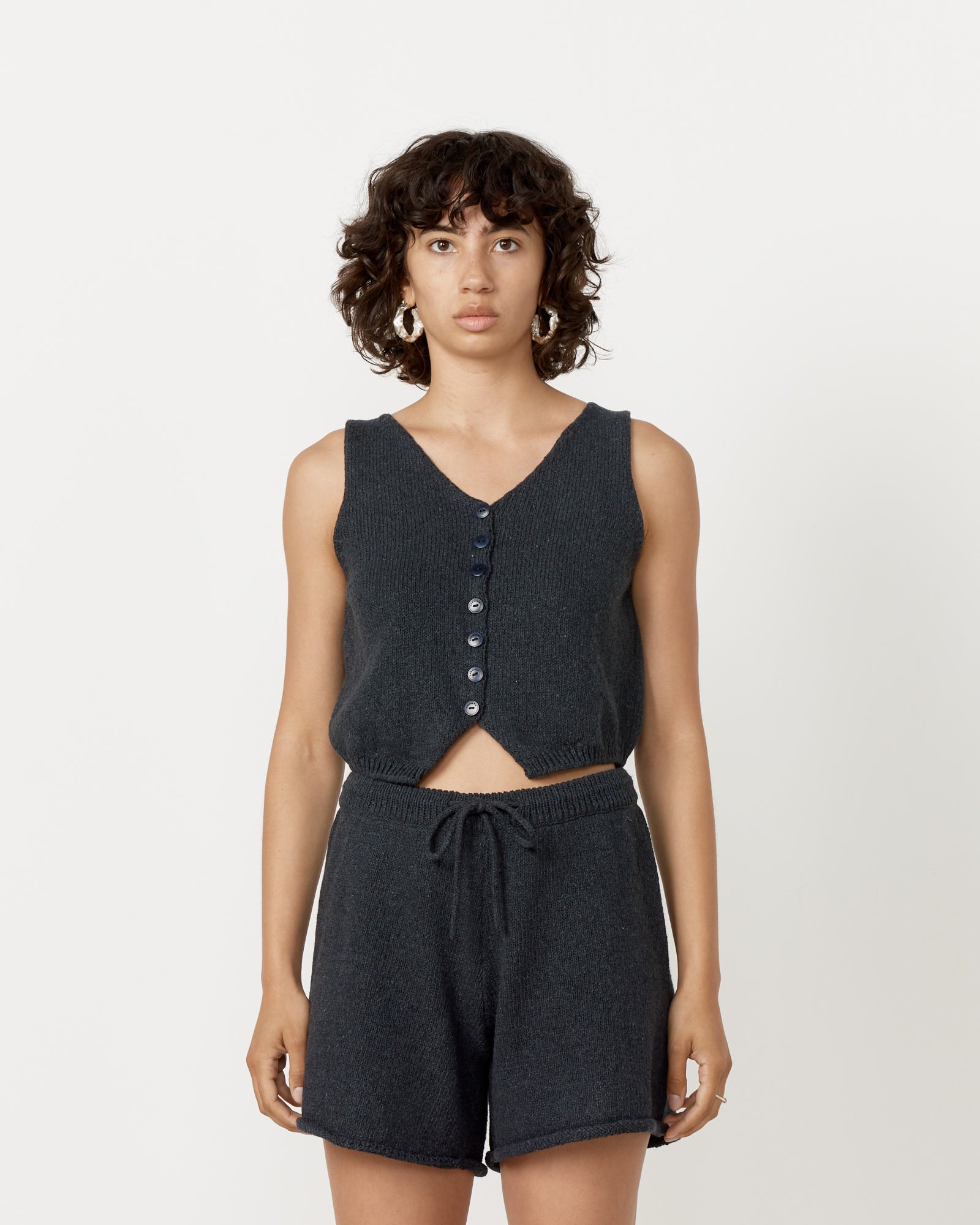 A one-size style designed to fit loose and boxy on the body, Cordera's Heather Cotton Waistcoat is done in a soft recycled cotton fabric with a beautiful melange throughout and features a v-neckline, tonal buttons, and a ribbed hemline.
