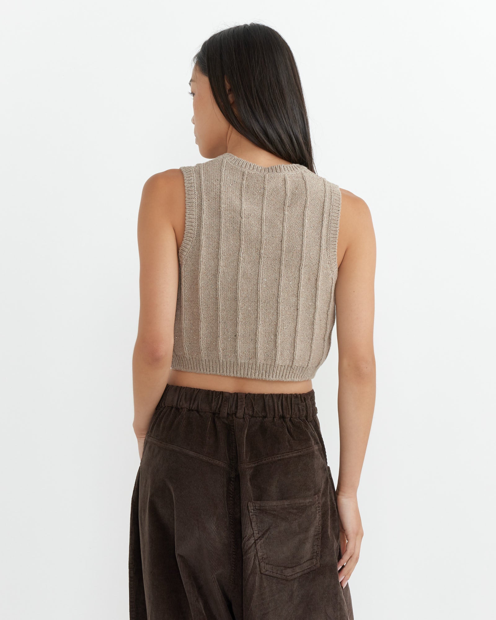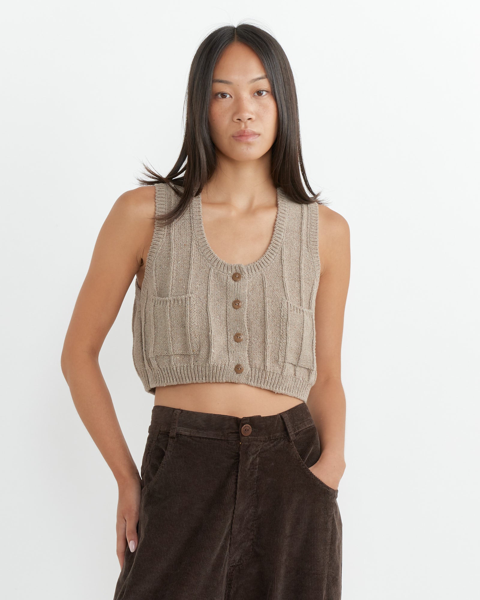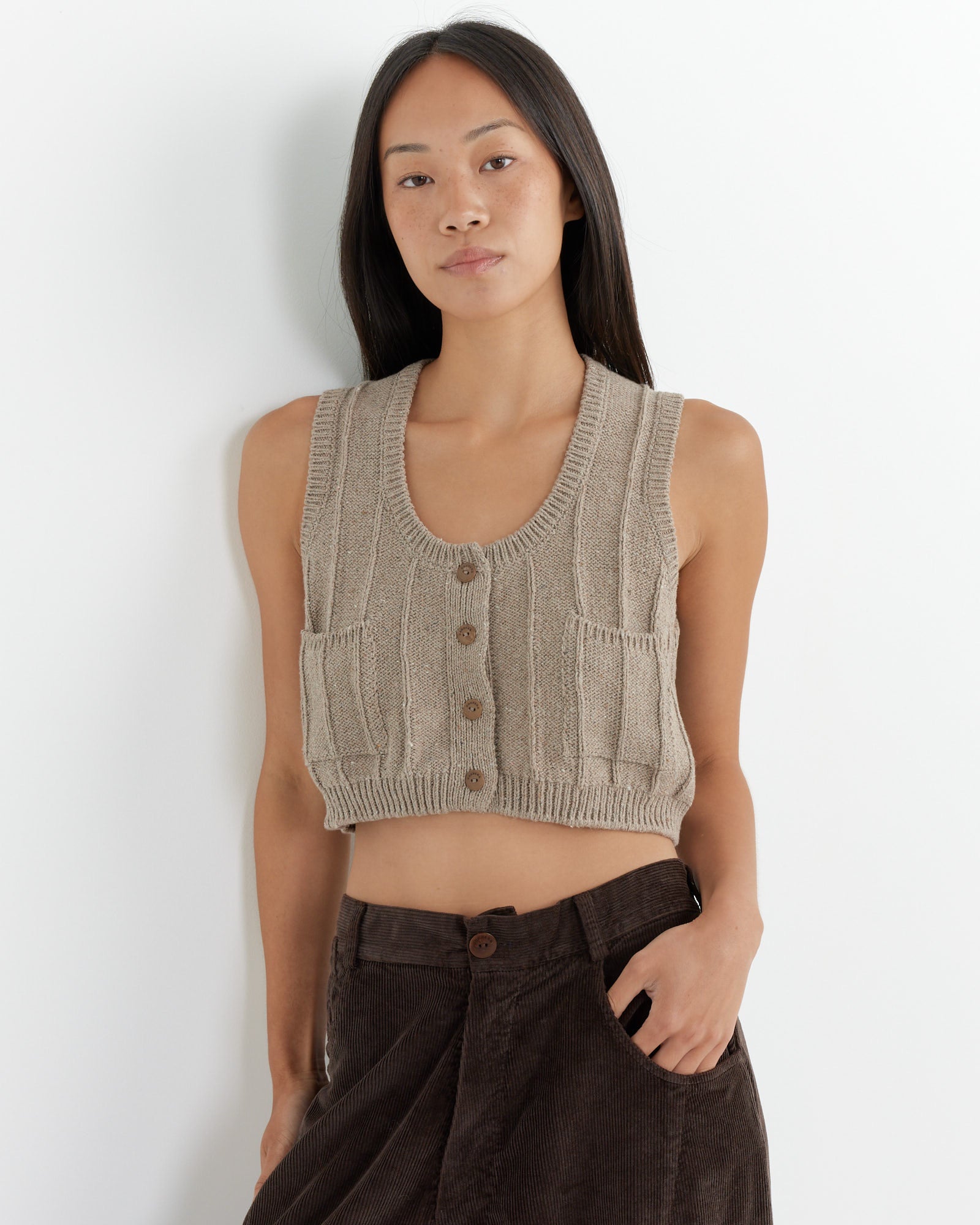 A one-size style designed to fit loose and boxy on the body, Cordera's Heather Cotton Waistcoat is done in a textured recycled cotton fabric and is detailed with two frontal pockets and a pronounced round neckline.
