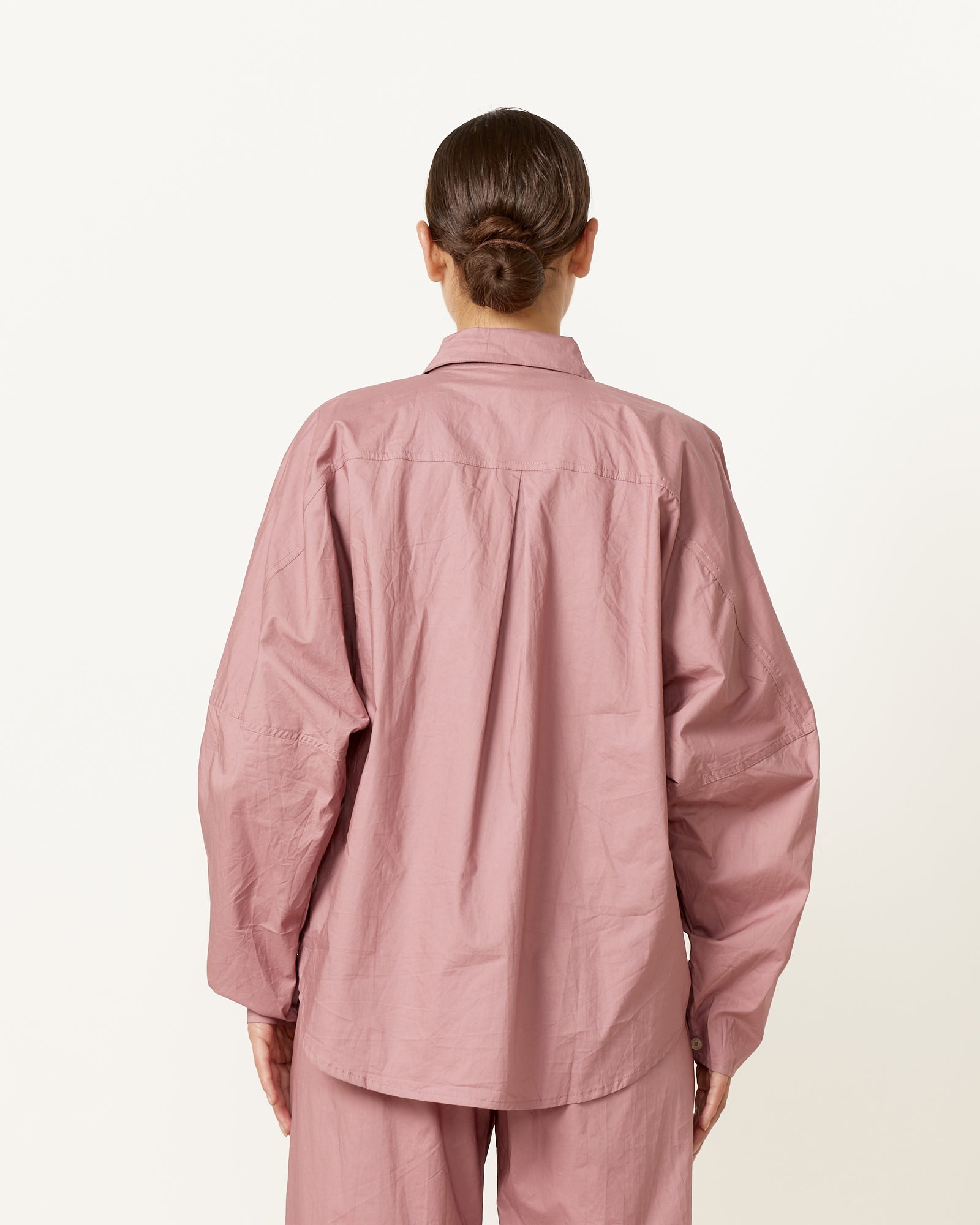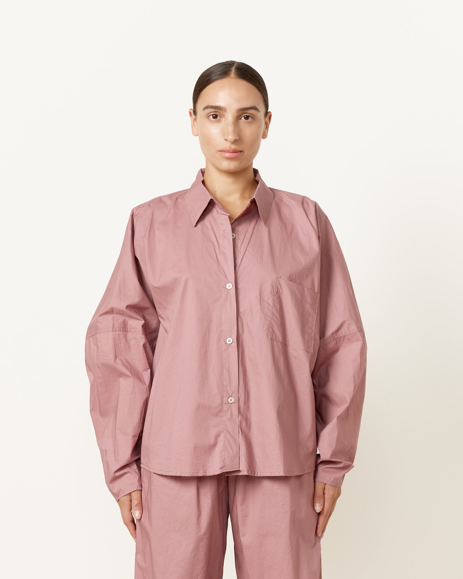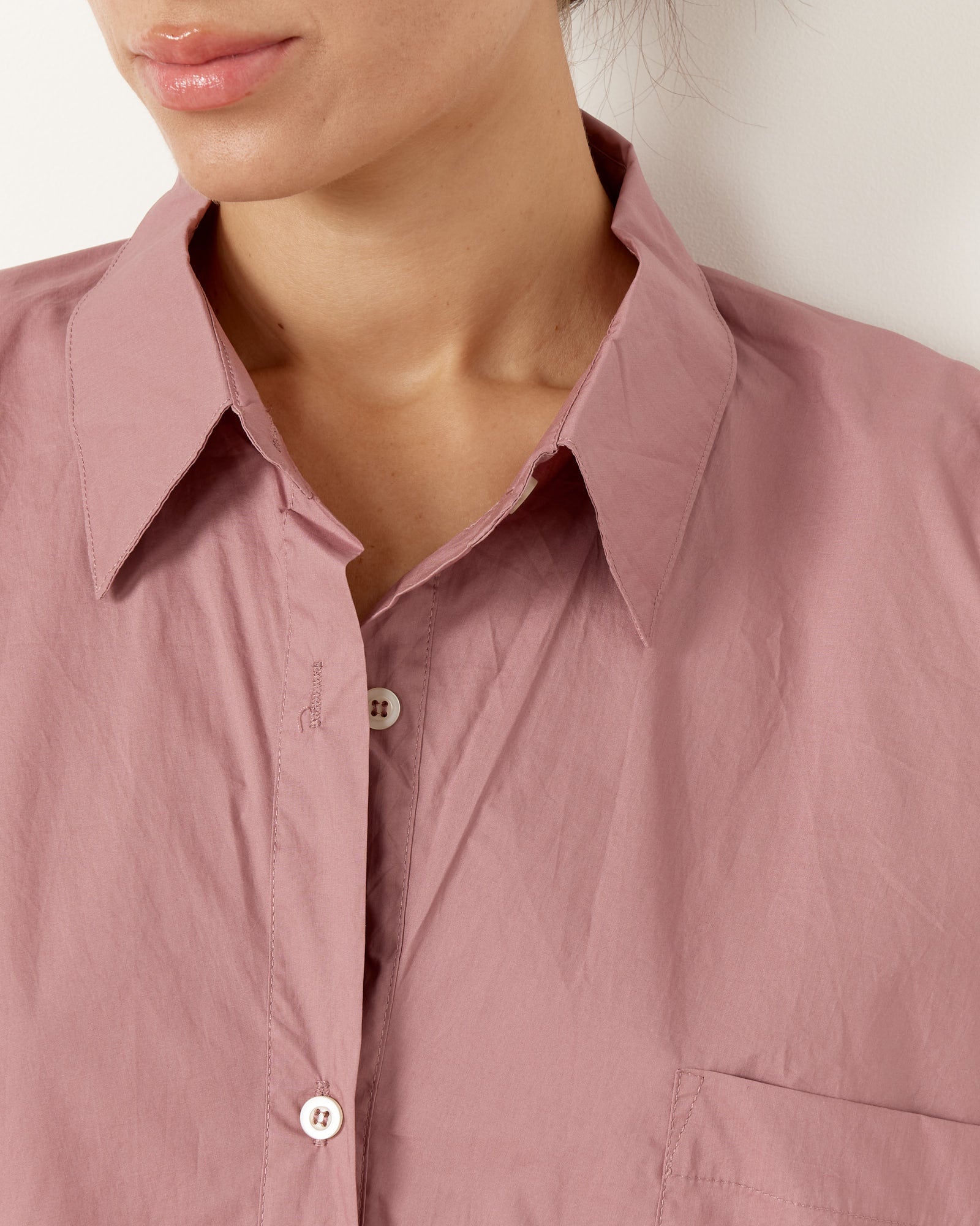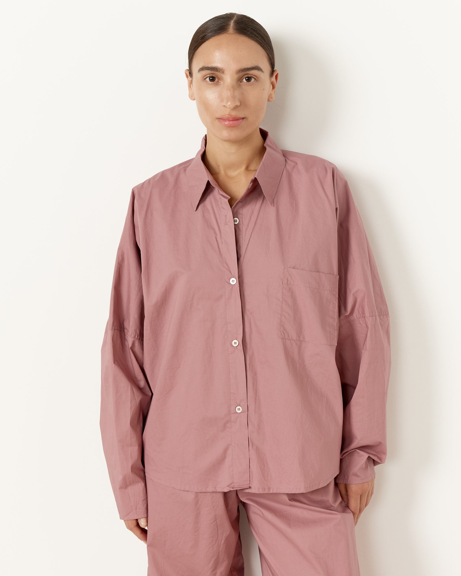 Deiji Studios' effortless Curved Shirt features dropped sleeves with a curved shape, a dropped back yoke with a center back pleat for ease of movement, twin needle stitching for durability, and a curved hemline. Can be worn at home, in bed, or out and about.