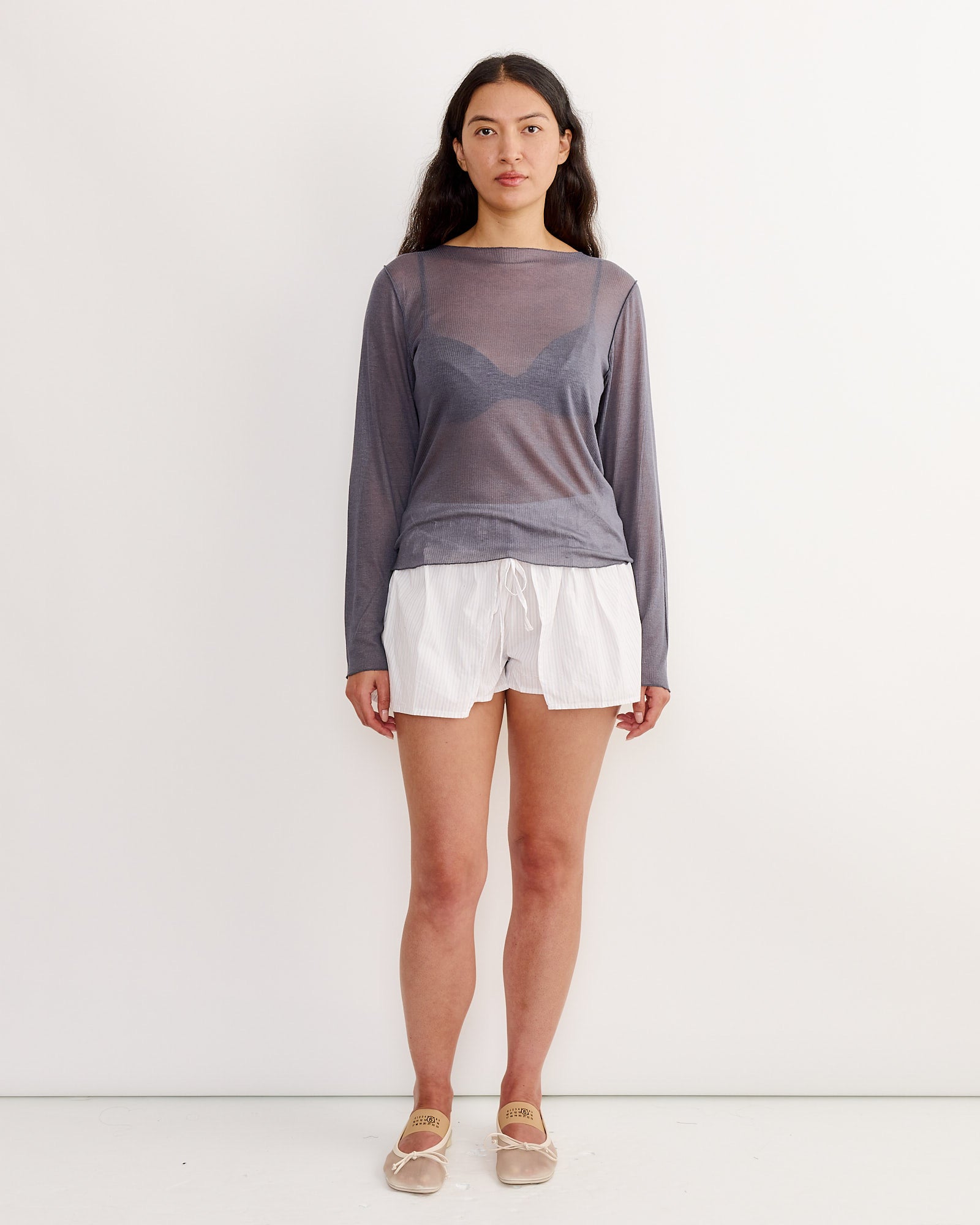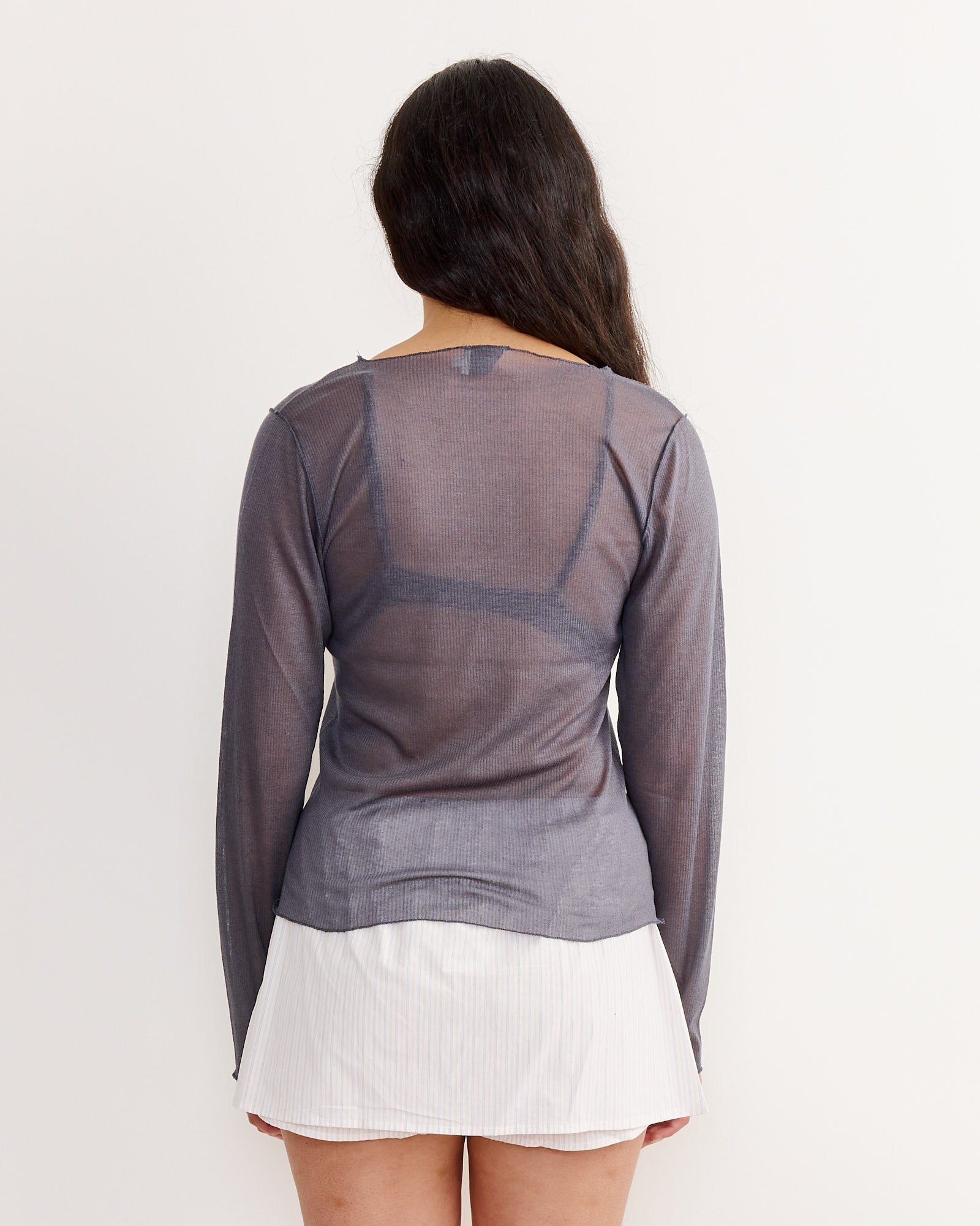 The Deiji Studios Knit L/S Top in Steel is a sheer, lightweight knit with exposed seam detailing and a visible tag accent. Designed with baby-locked edges and a relaxed fit, this long-sleeved top layers easily while maintaining a distinct, minimal look. Made from a soft, responsible blend with certified low-impact materials.
