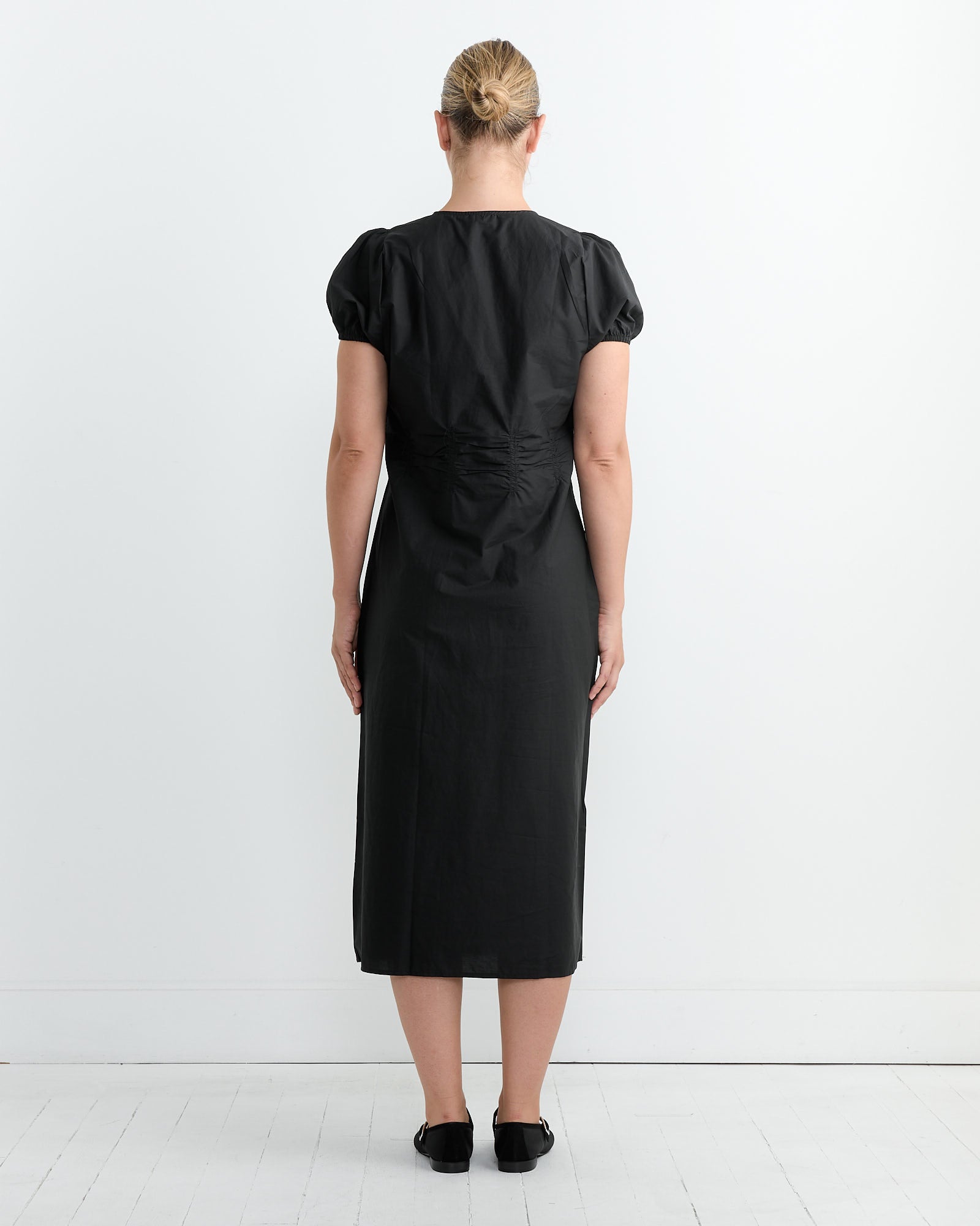 The Deiji Studios Pinched Dress in Black is a mid-length, everyday dress featuring a flattering V-neckline, fixed ruched channels at the waist, and soft elastic blouson sleeves. Crafted from 100% organic cotton poplin, it offers both comfort and style.