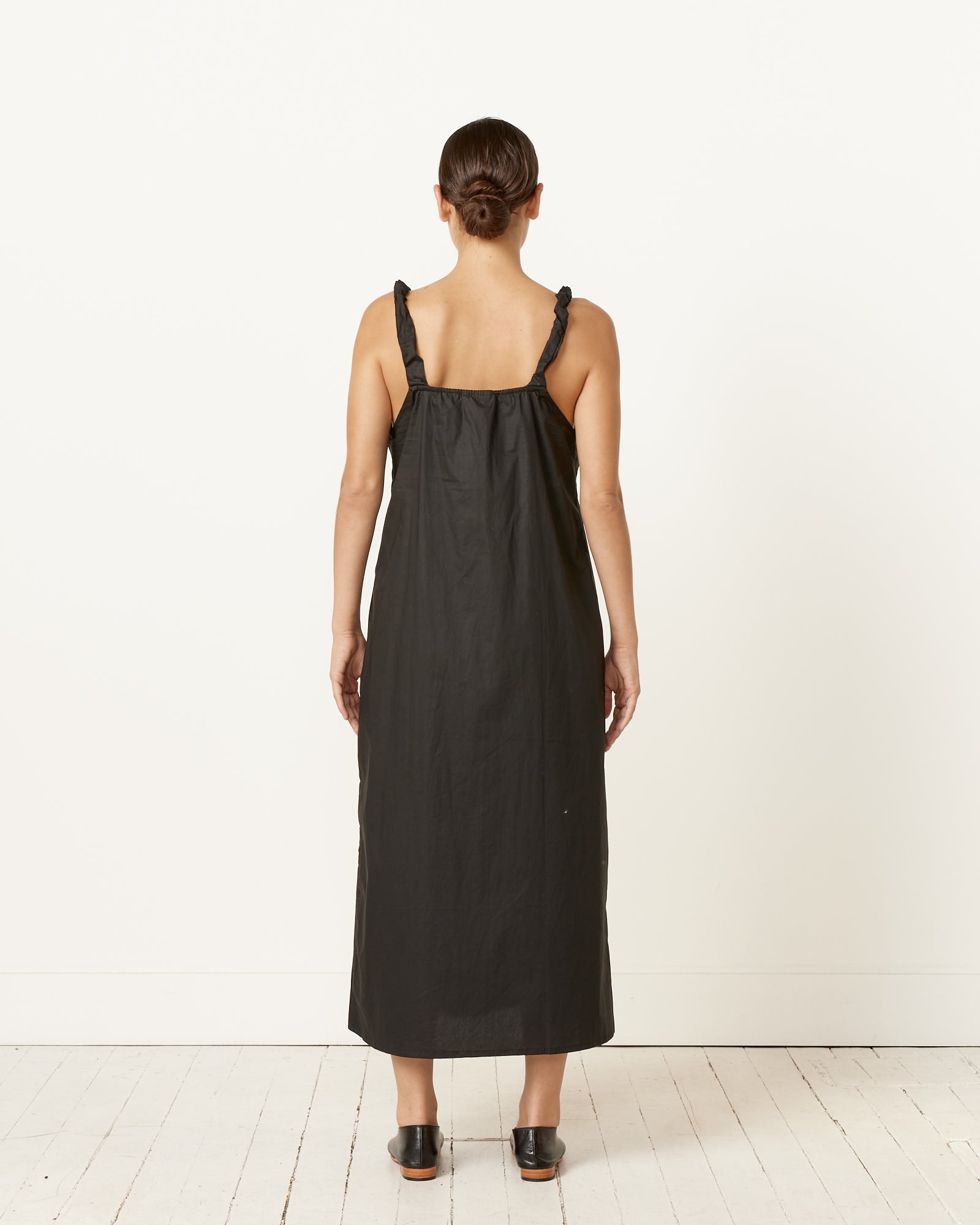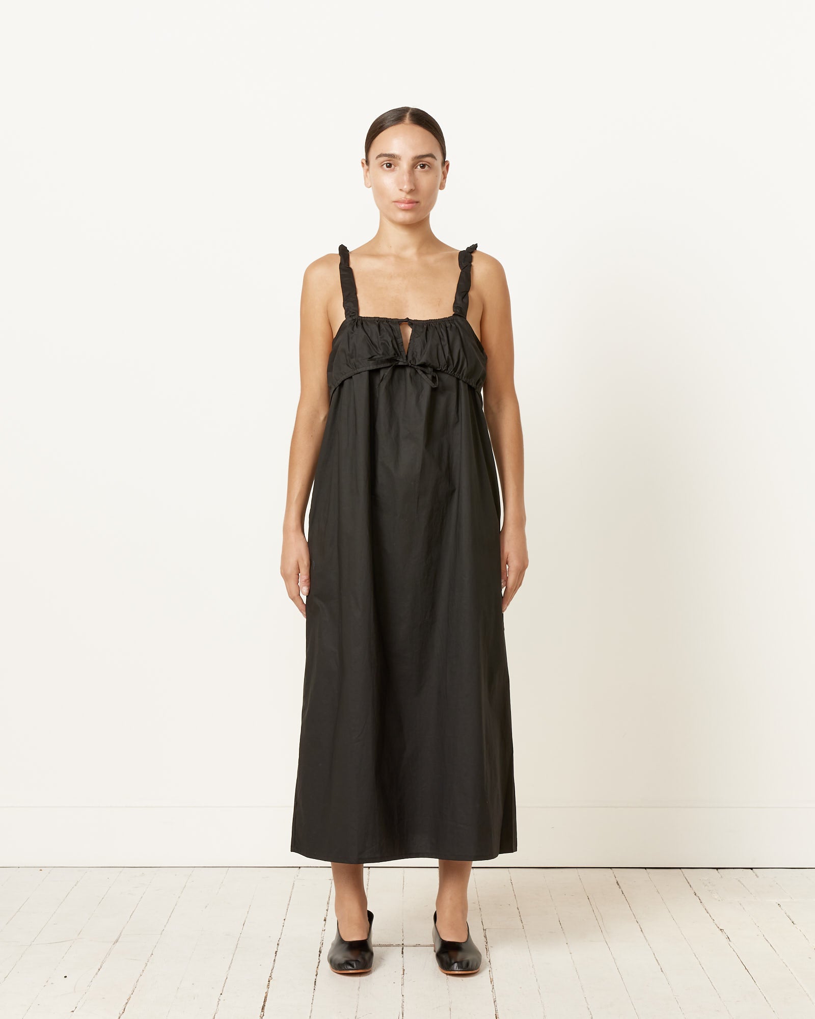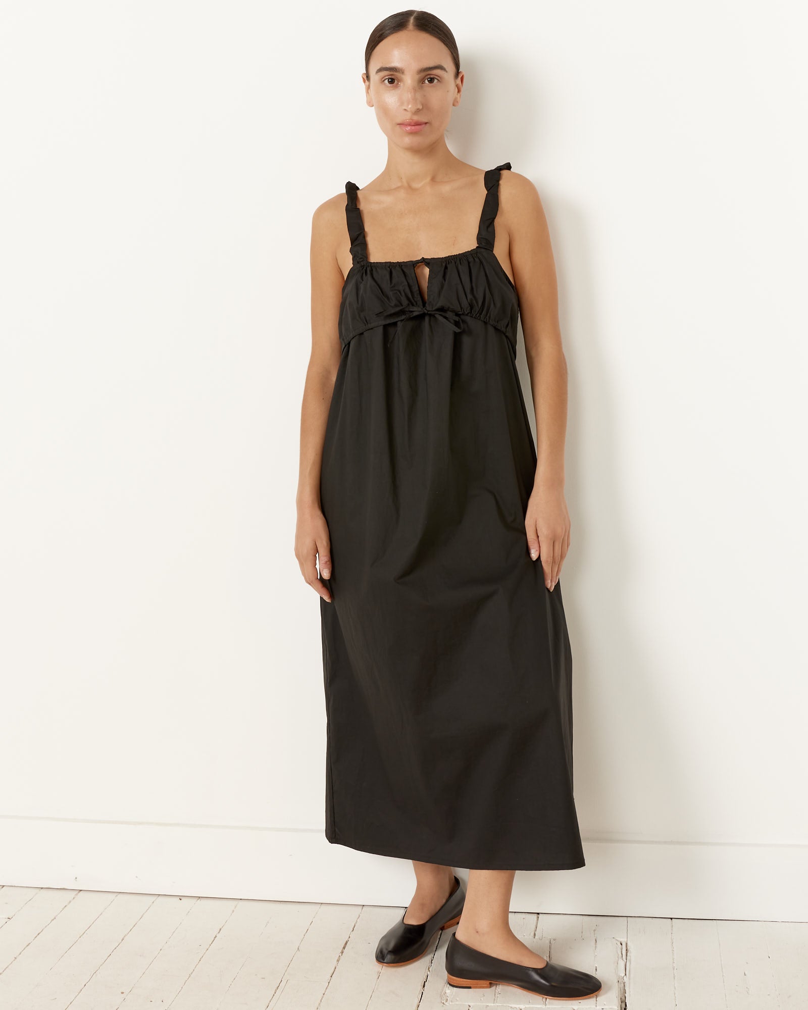Deiji Studios Ruched Tie Dress is a lightweight maxi dress cut from crisp poplin that features a ruched bust overlay with adjustable ties, a keyhole center, and side seam pockets.