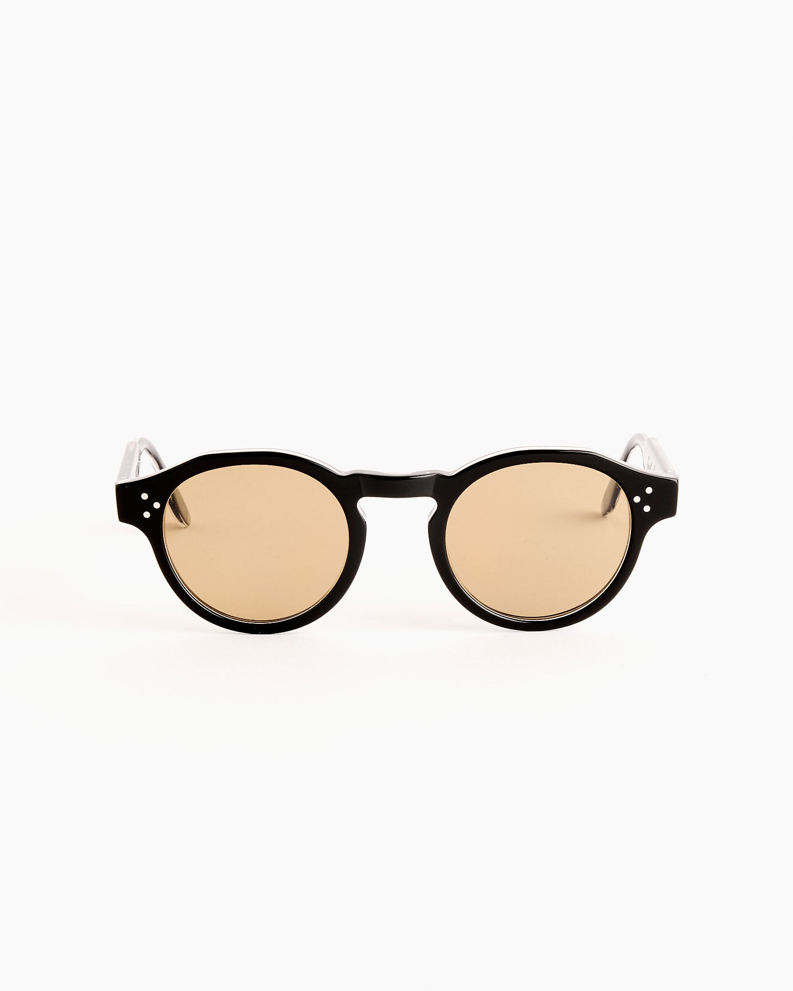 The Dom Vetro Walt Polarized Mineral Glass Sunglasses in Black Ice feature round, black Italian acetate frames and light brown lenses, shown facing forward on a plain white background.