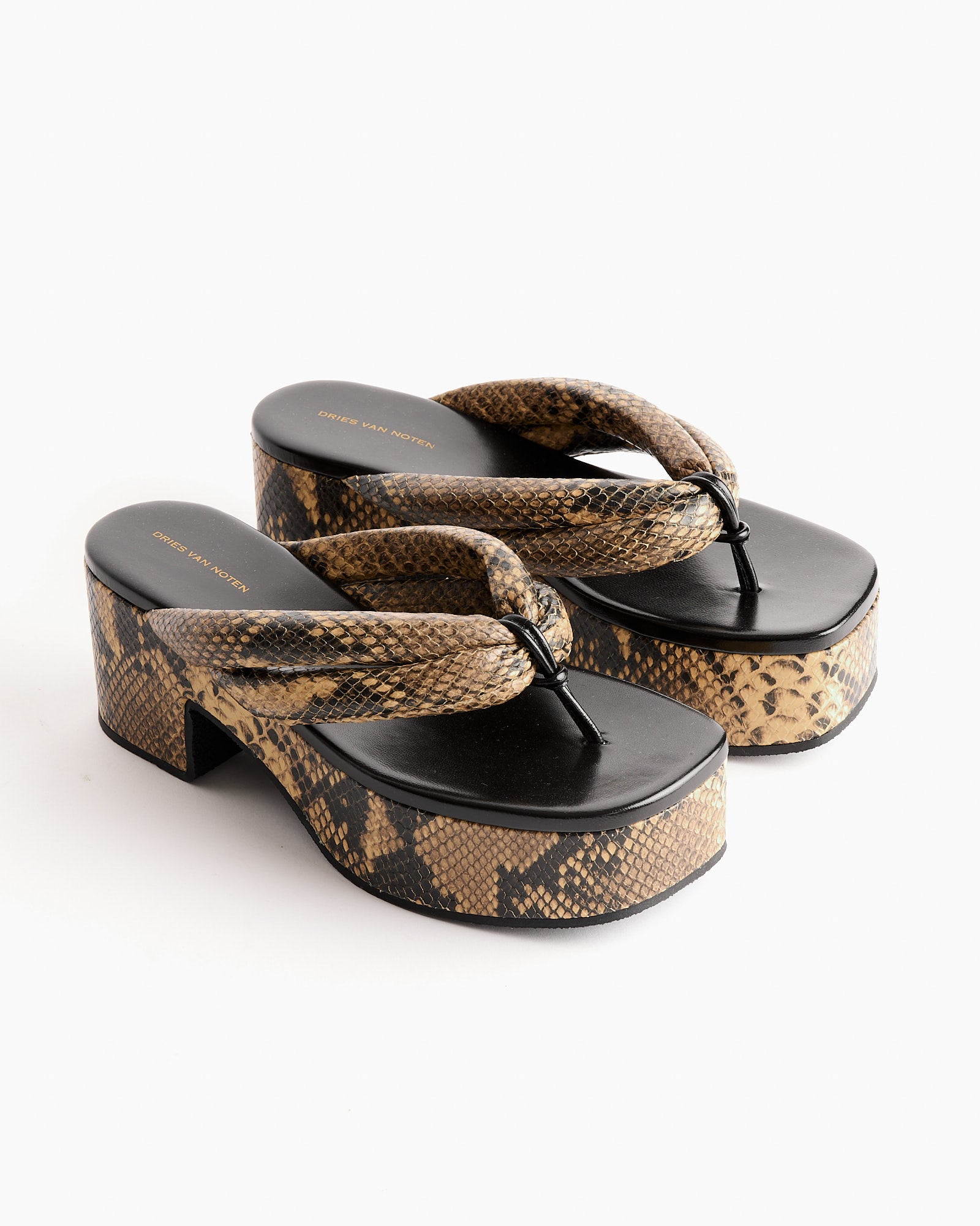 The Platform Sandals by Dries Van Noten are crafted in snakeskin-printed sheepskin leather with a slip-on silhouette and bold platform heel. Set on a sturdy rubber sole, the design balances statement texture with ease of wear.