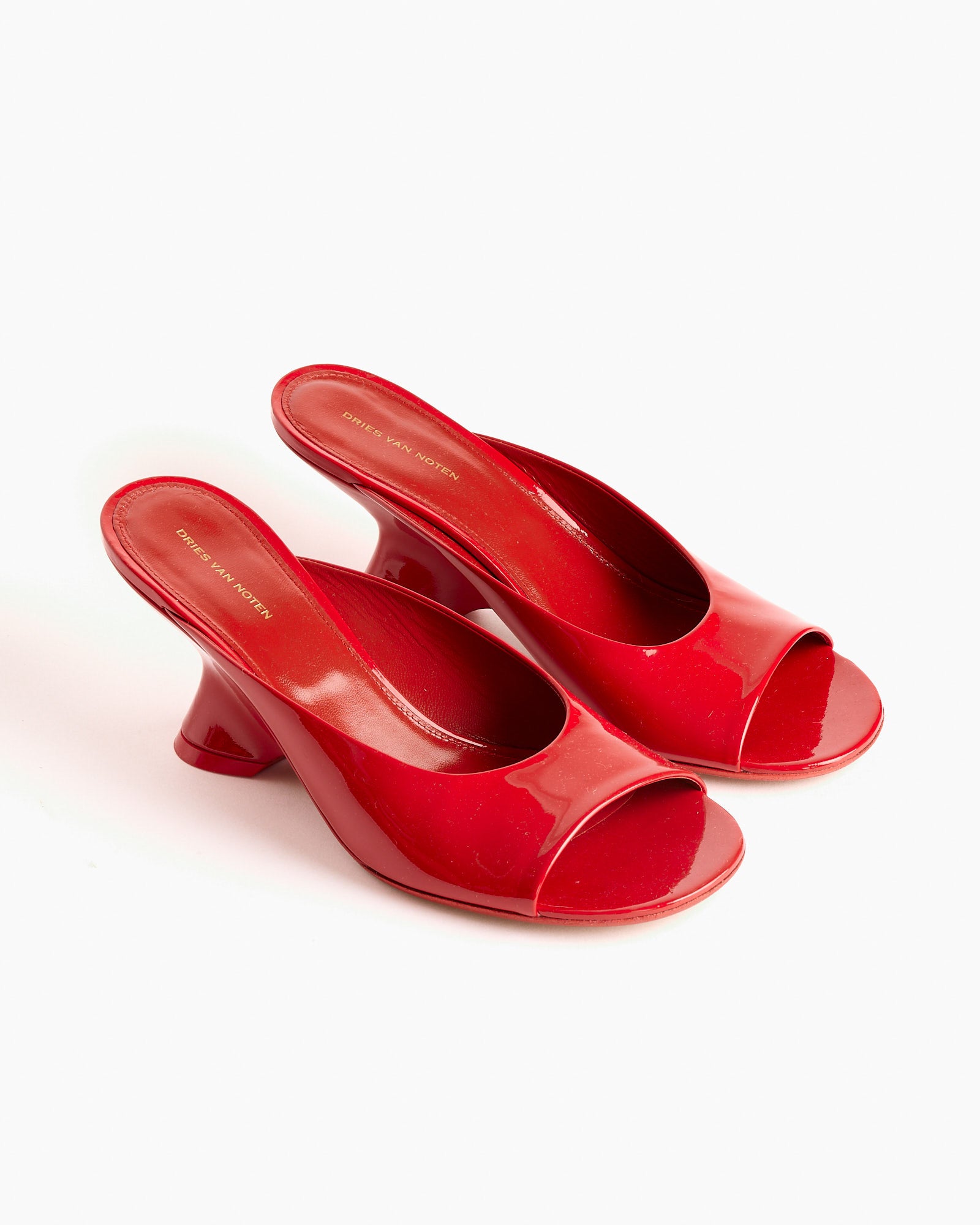 The Open-Toe Leather Mules by Dries Van Noten are crafted from glossy patent calf leather with a sculptural curved wedge heel. This slip-on style features an open toe and clean lines, offering a modern update to a classic mule silhouette.