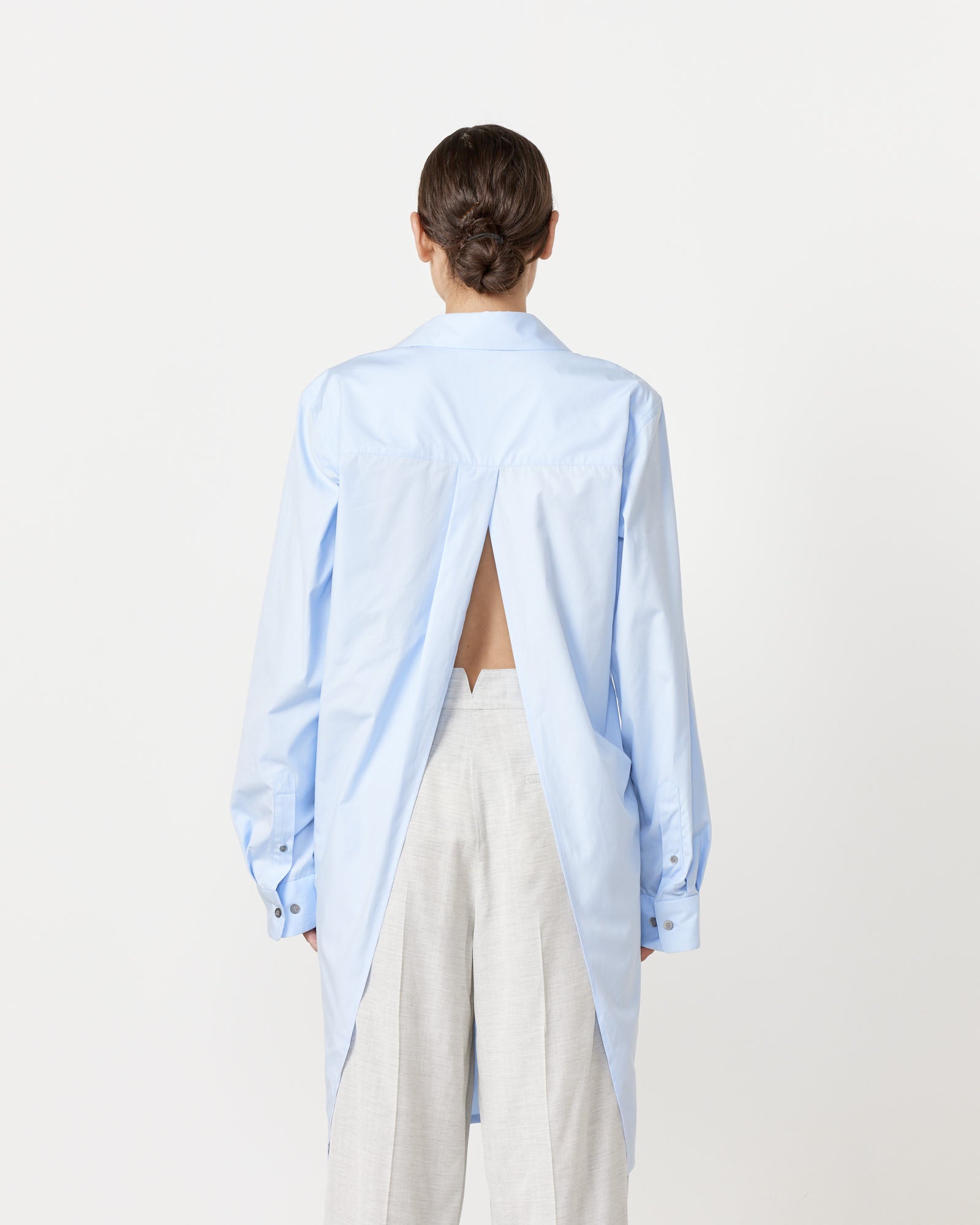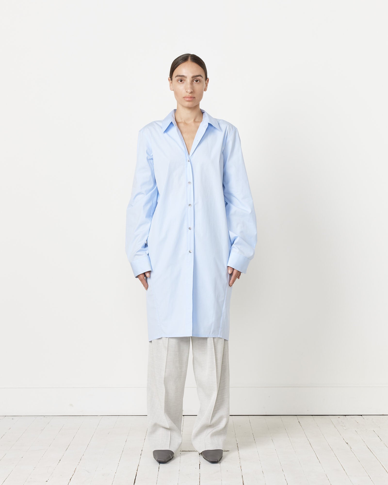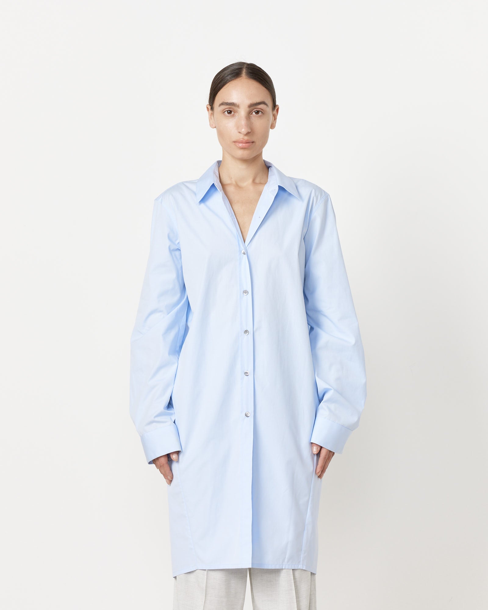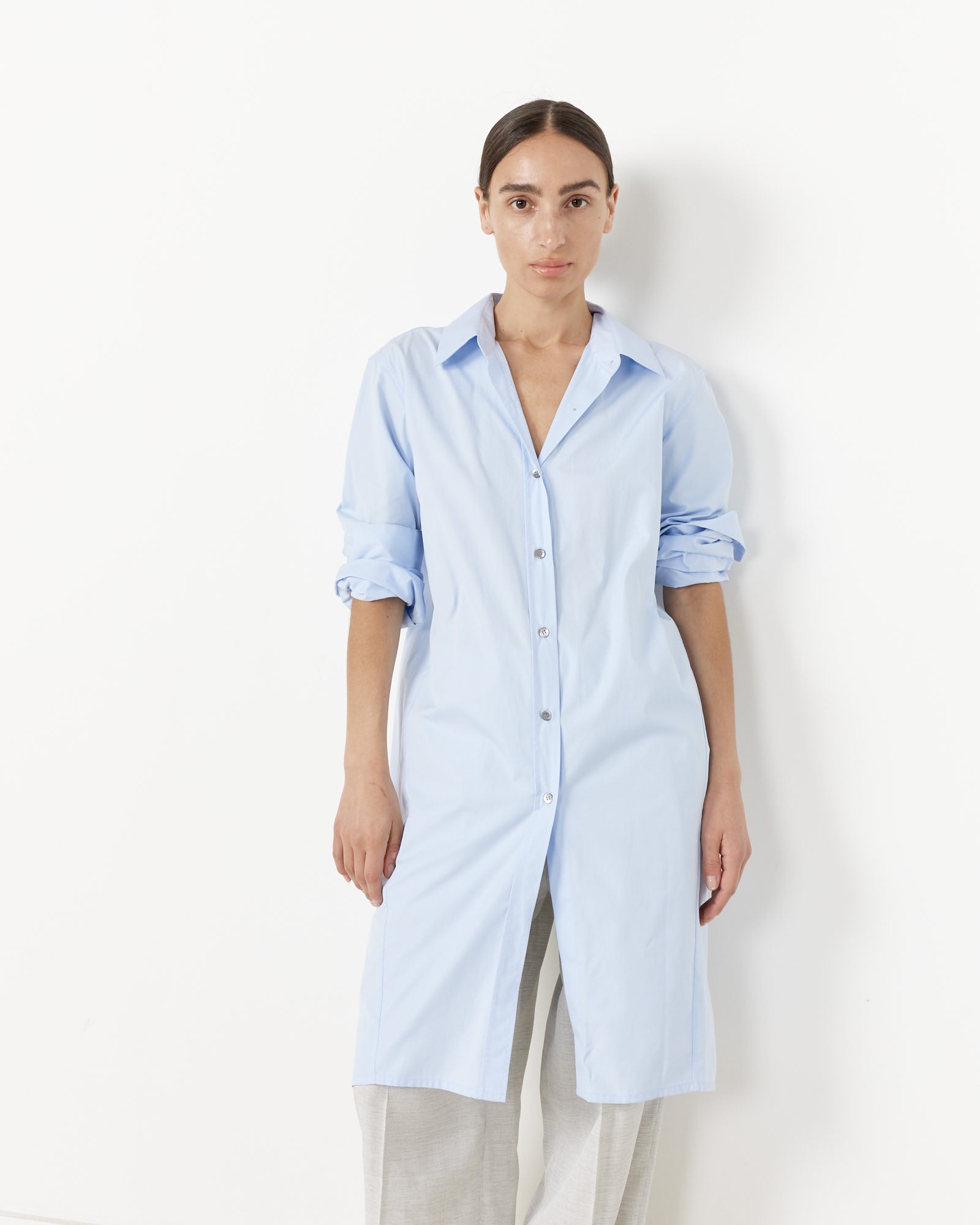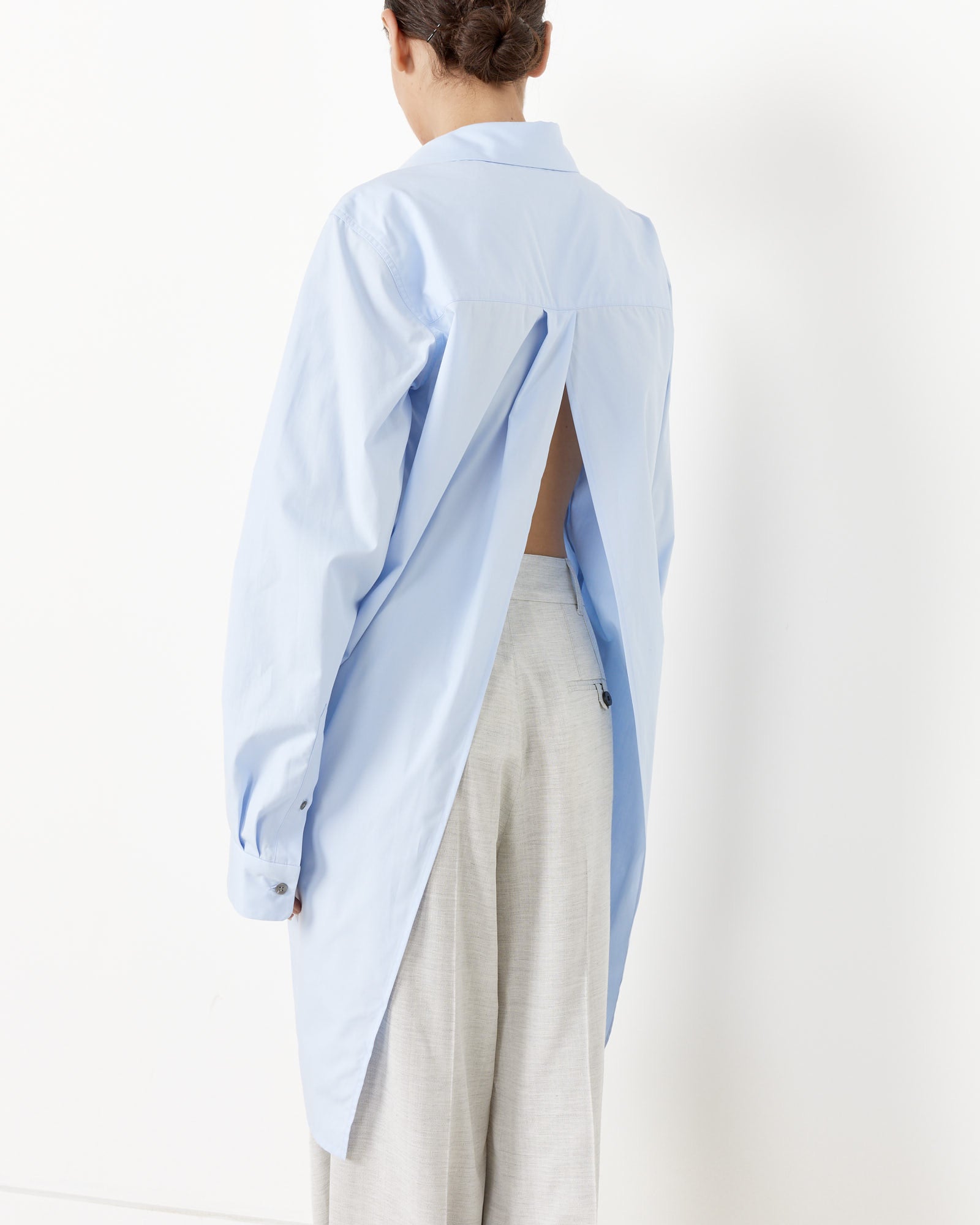Dries Van Noten's Calbero Shirt in Light Blue captivates with an elongated length and a deep slit at the back, enabling the piece to be worn open or knotted at the front.