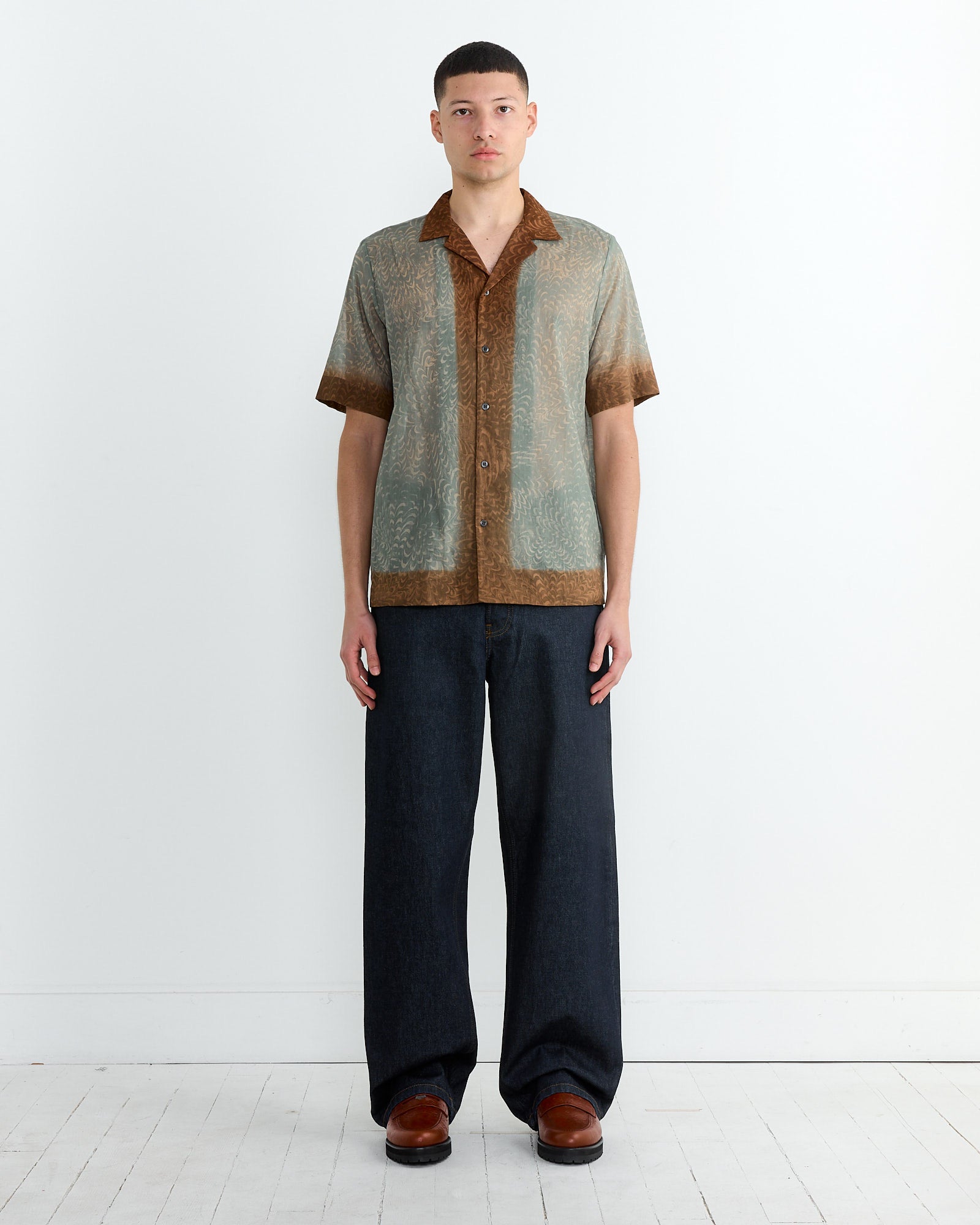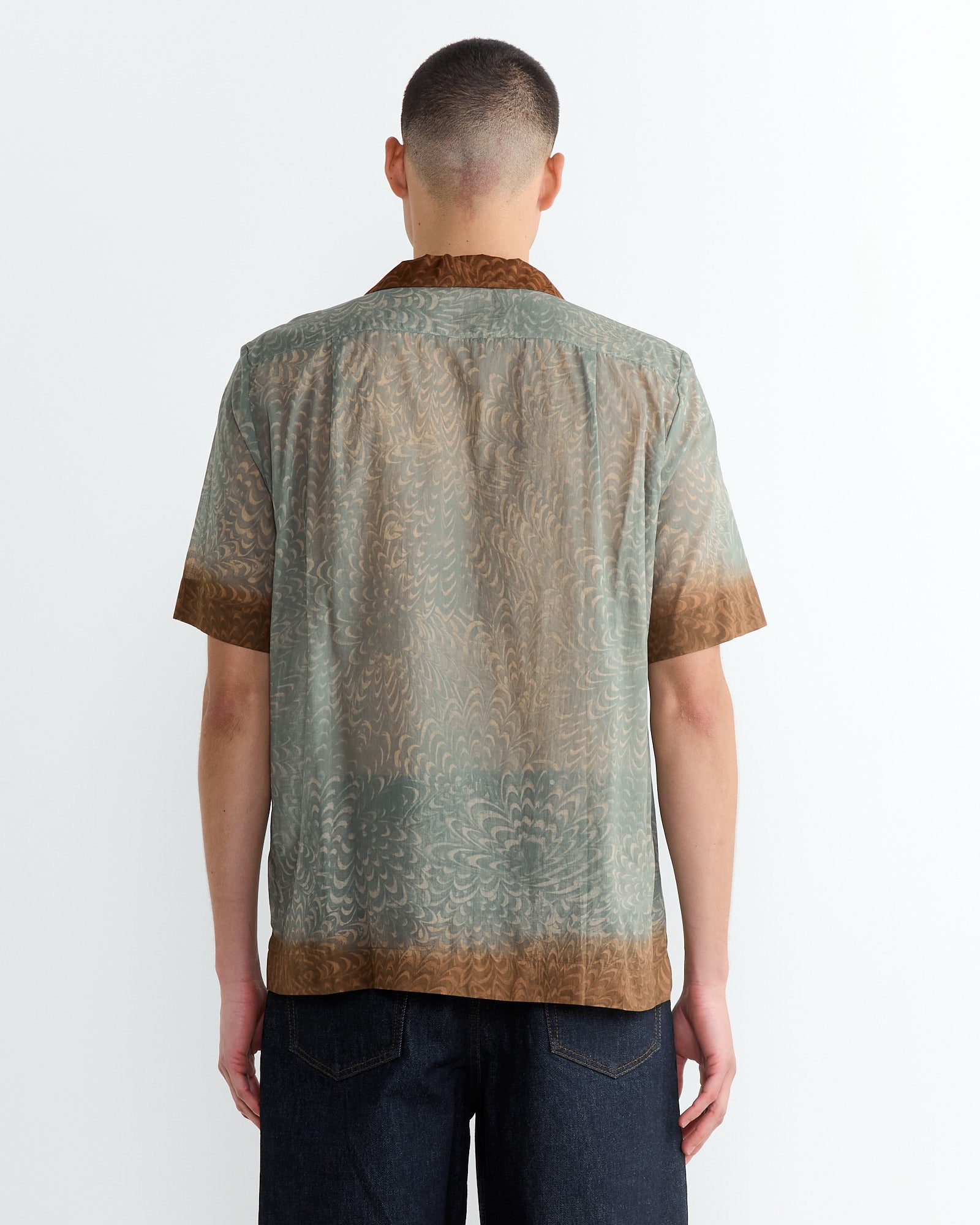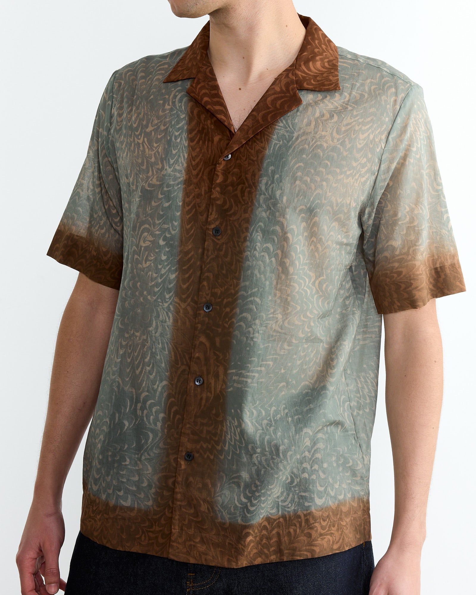 The Dries Van Noten Printed Shirt in Mint is a short-sleeved, camp-collar shirt with a rich marbled print in earthy tones. Designed for a relaxed fit, it features a button-front closure and a soft, flowing fabric that exudes effortless sophistication.