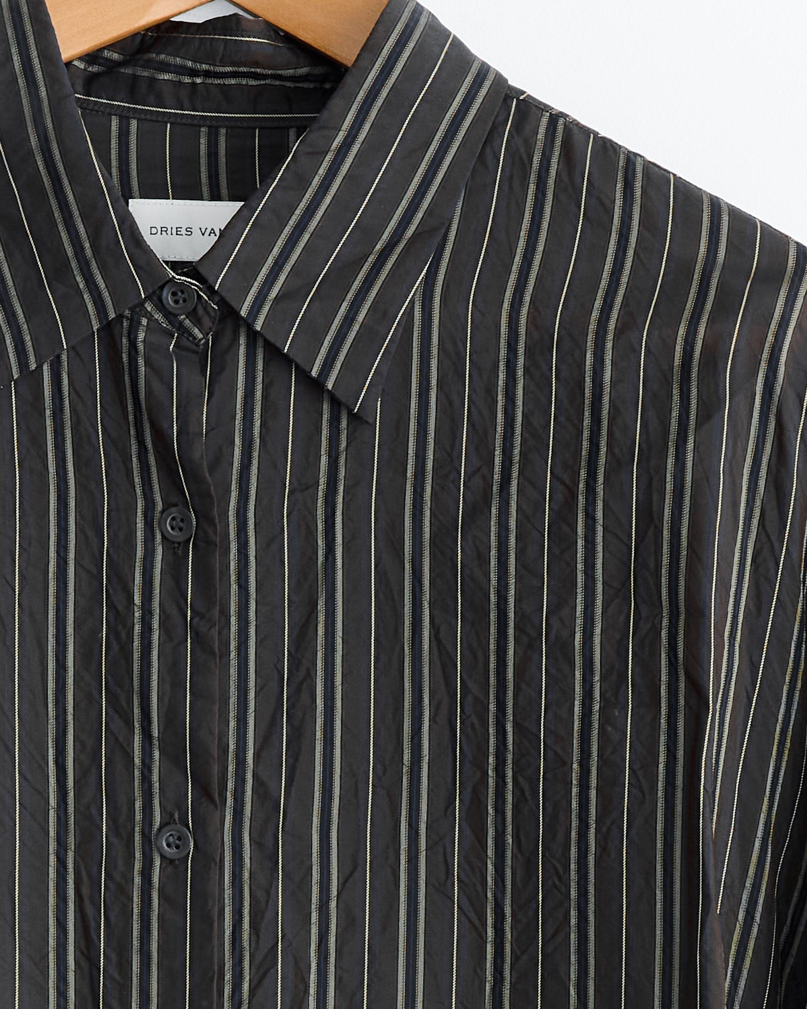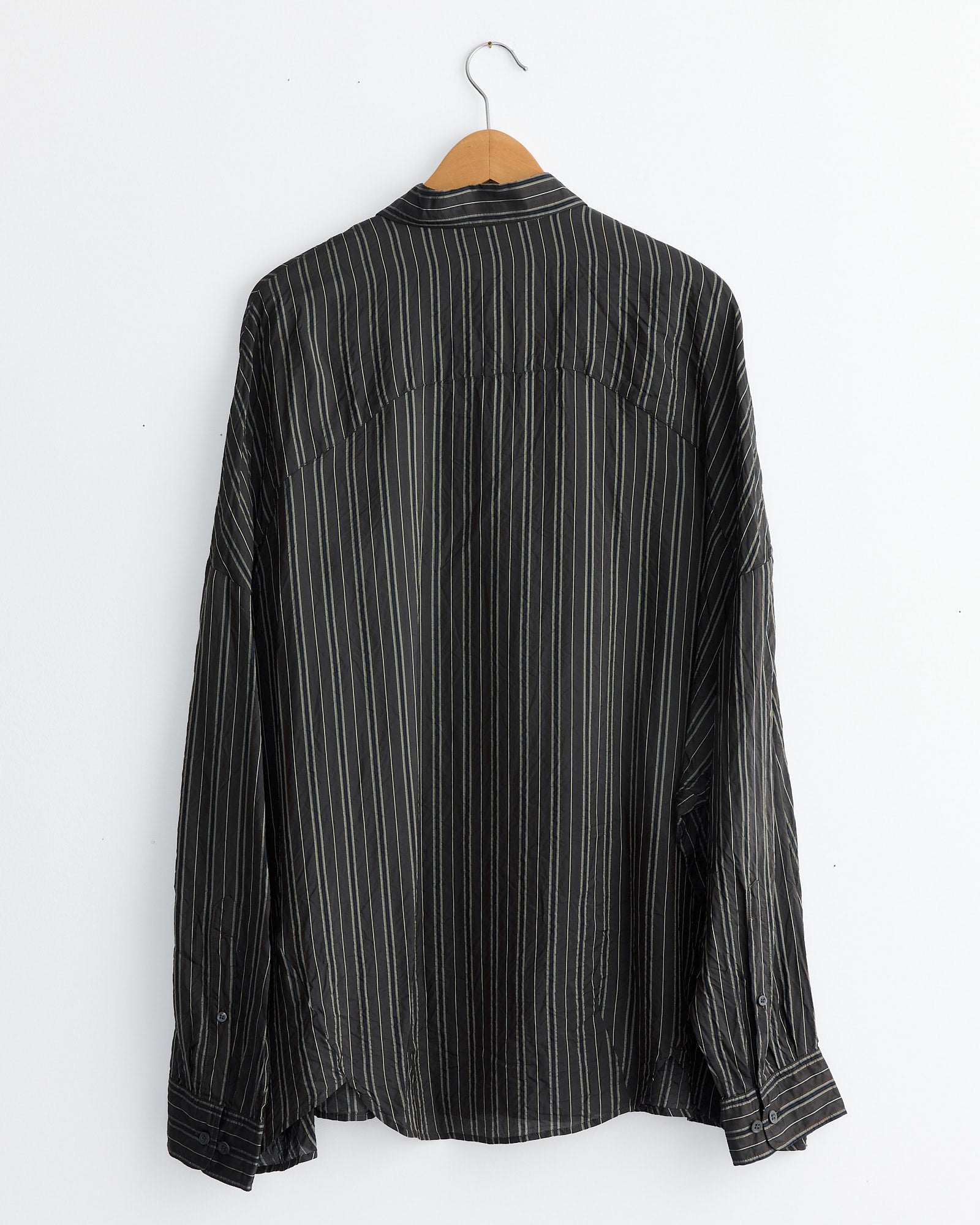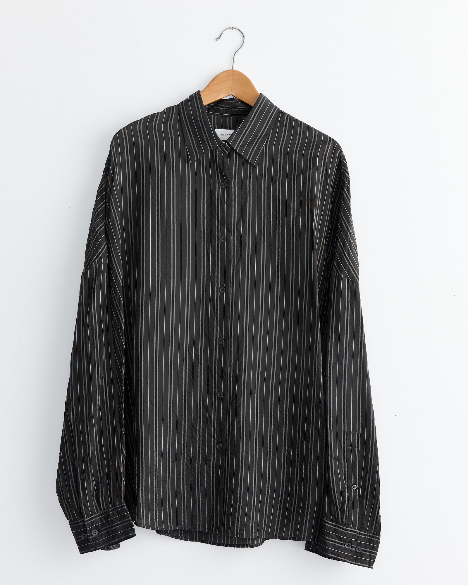 This reimagined button-up is meant to be a bit oversized and features pronounced dropped shoulders and a laid-back silhouette. This shirt is made of lightweight, striped cupro fabric.