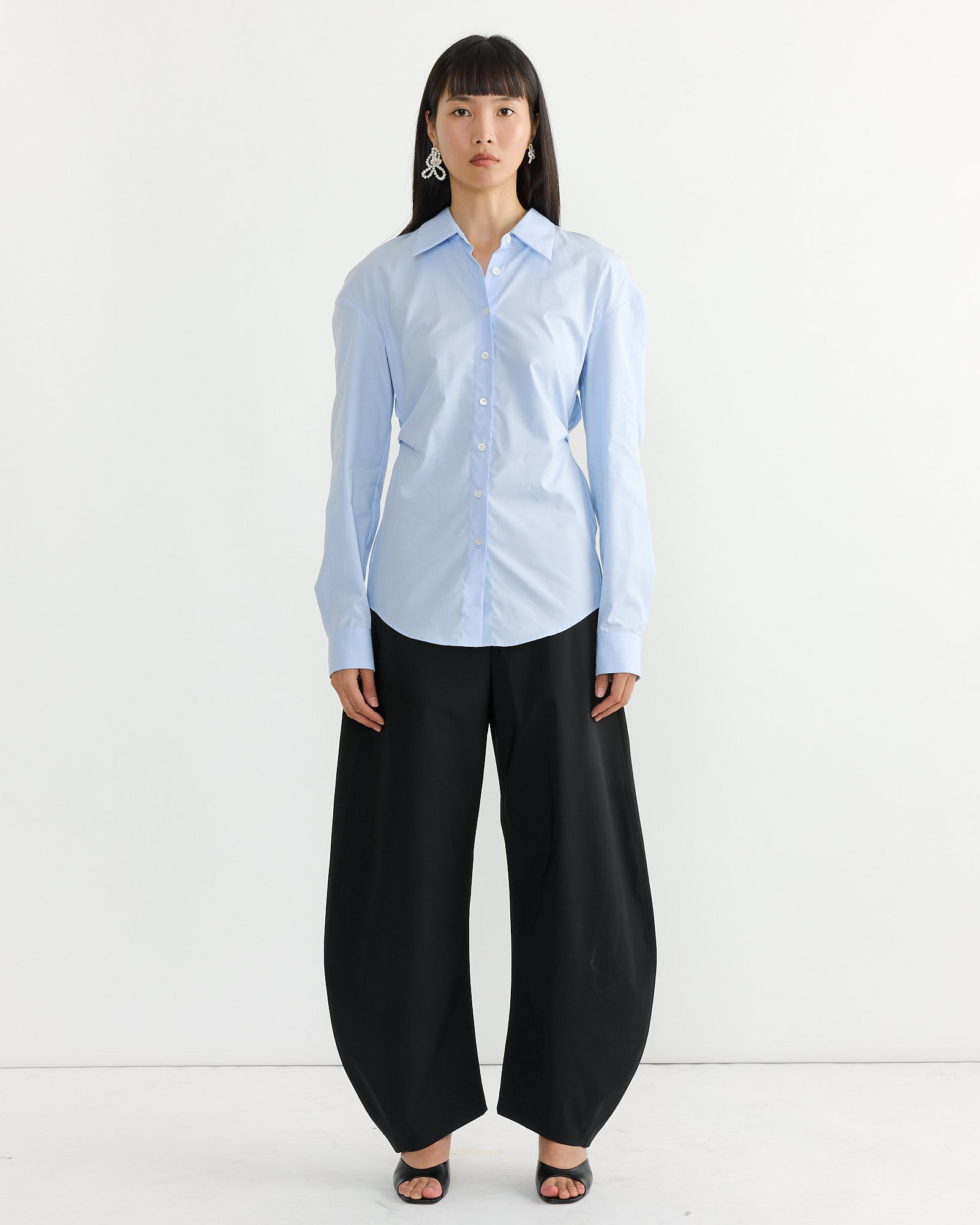 The Dries Van Noten Tailored Belted Shirt is made from cotton poplin and features an adjustable belt at the back for a customizable fit. Designed with puffed sleeves, buttoned cuffs, and a front button closure, it can be worn fully buttoned or styled halfway for a more relaxed look.