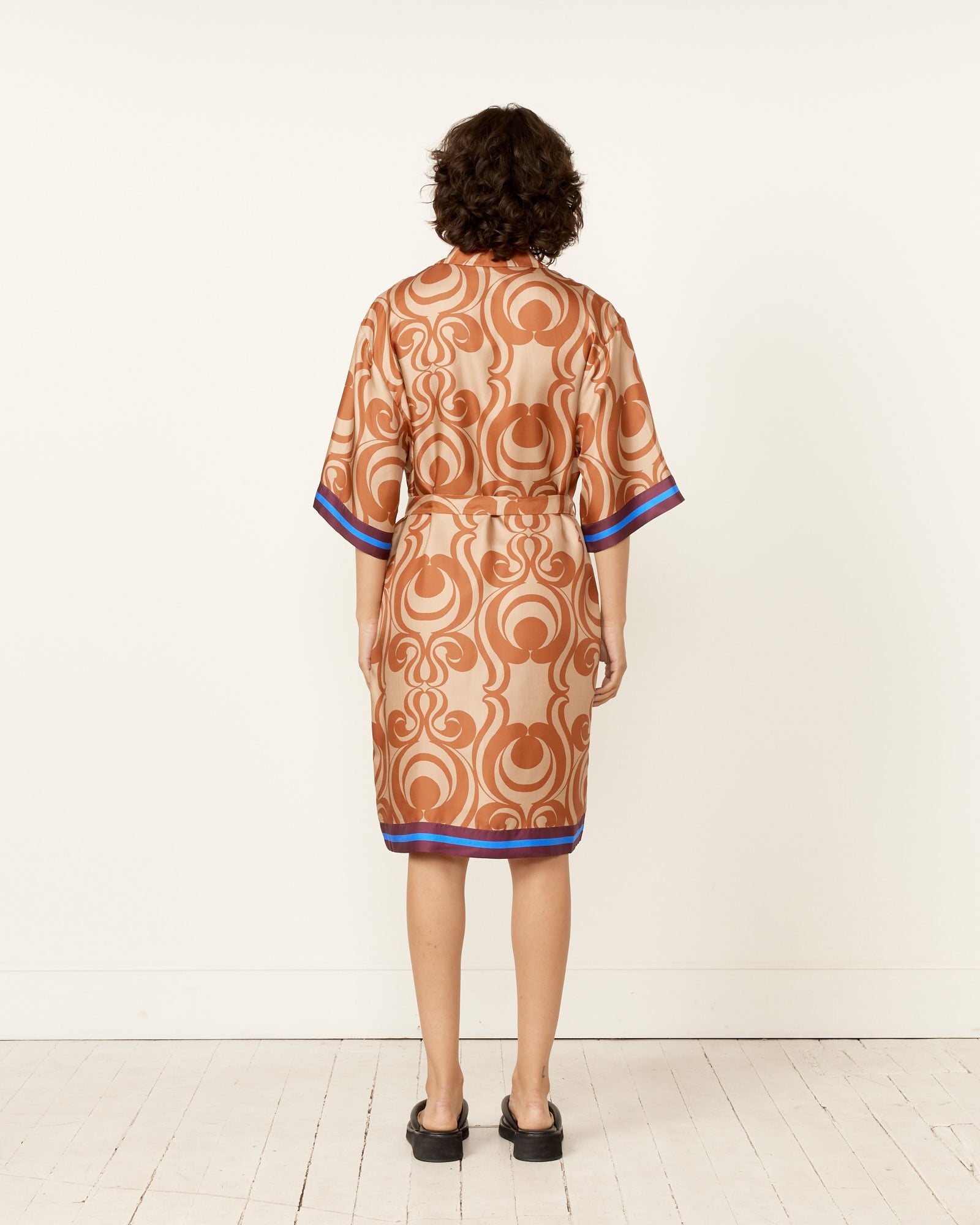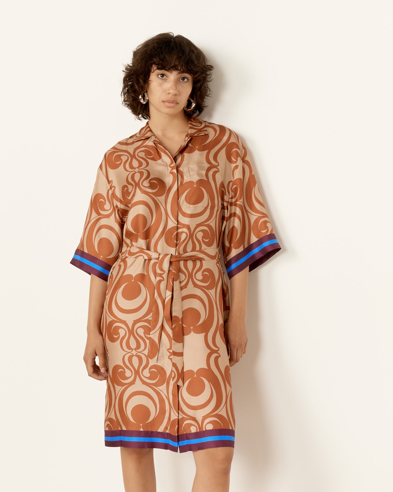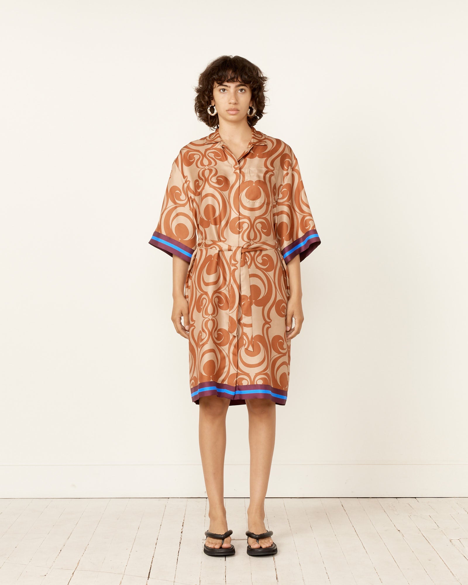 The Silk Dress Shirt is done in the ornate motif print found across many pieces and accessories from Dries Van Noten's collection for spring/summer, bordered by contrast tape stripes at the elbow-length cuffs and knee-length hem, and done in a loose silhouette with an adjustable self-belt at the waist.