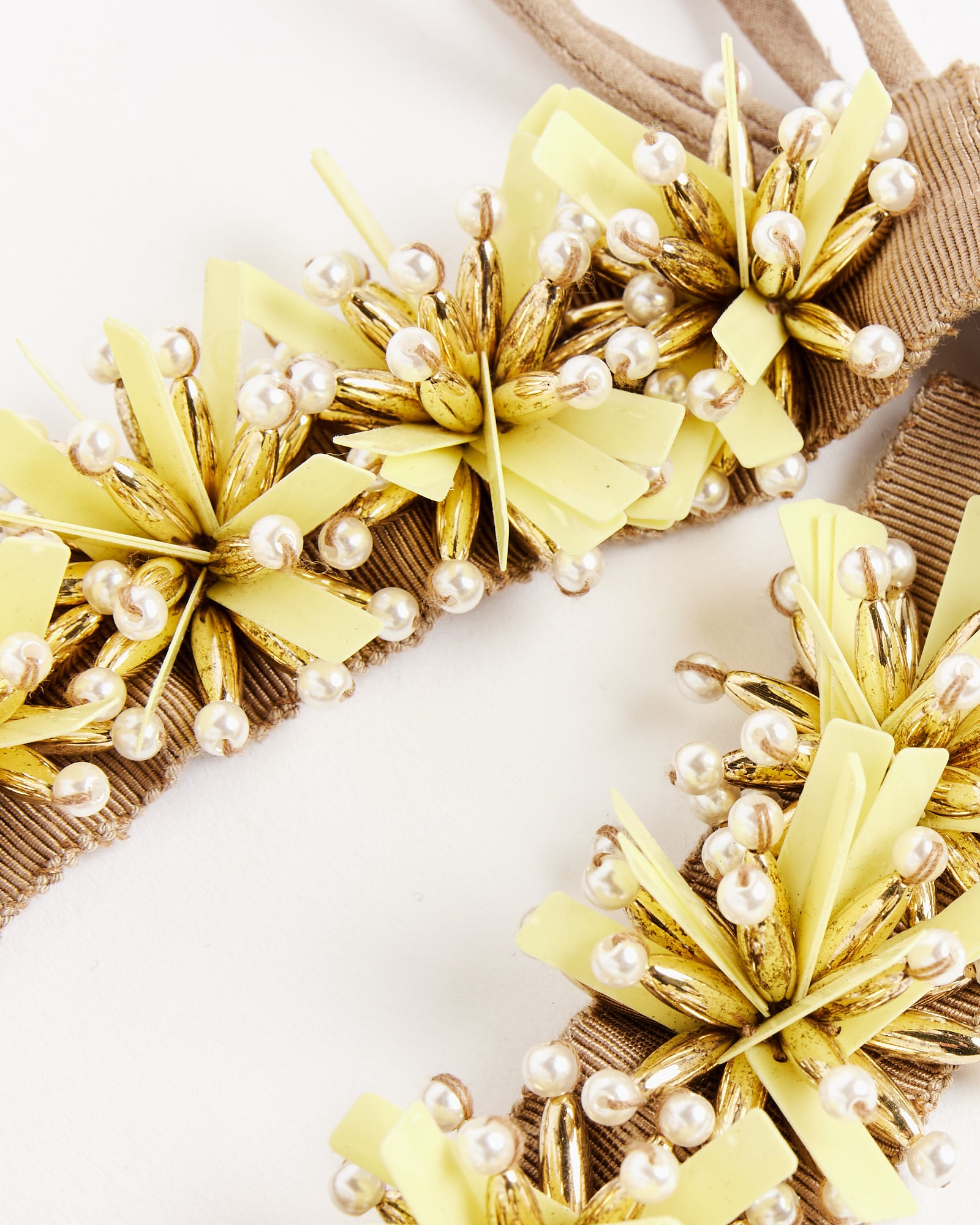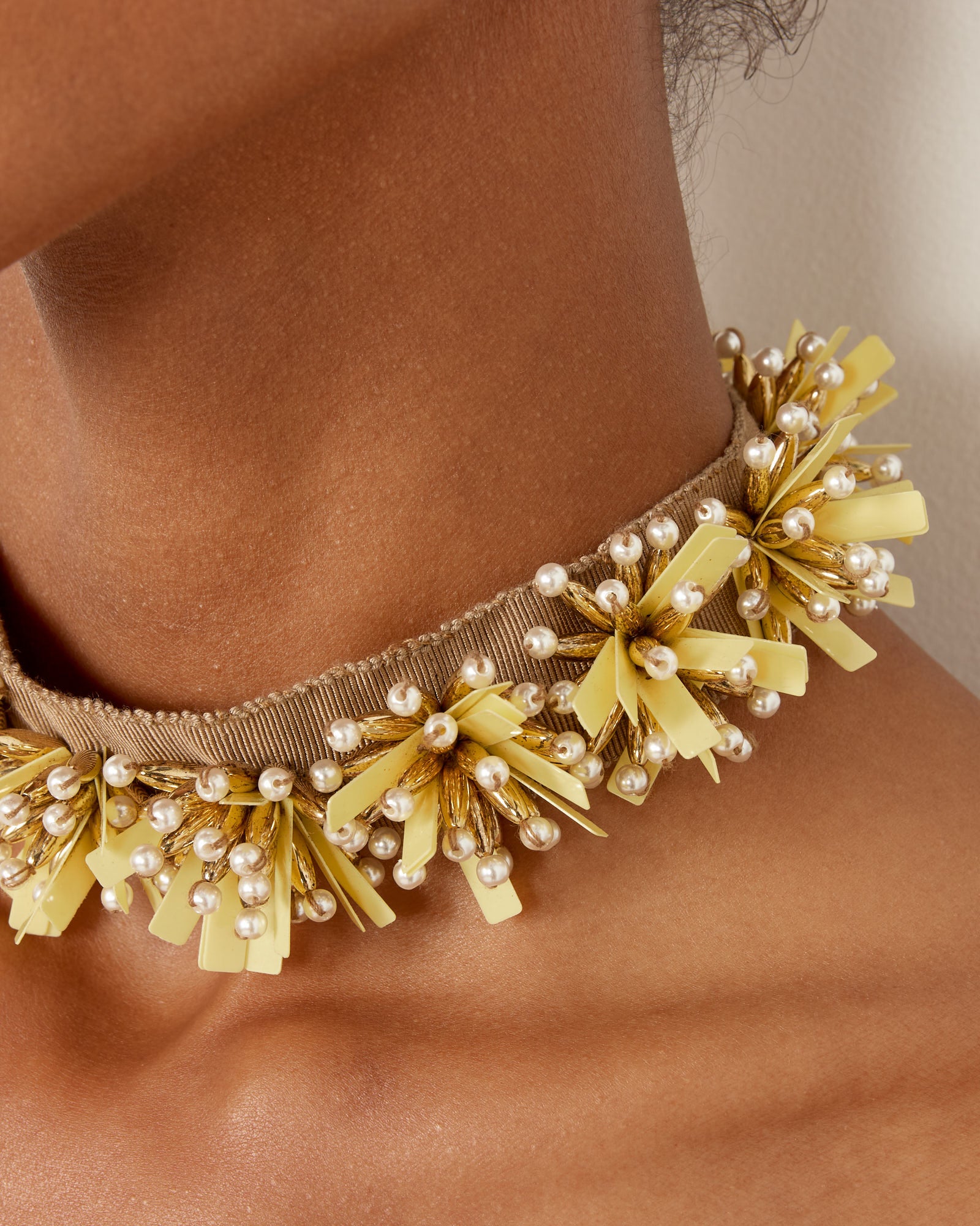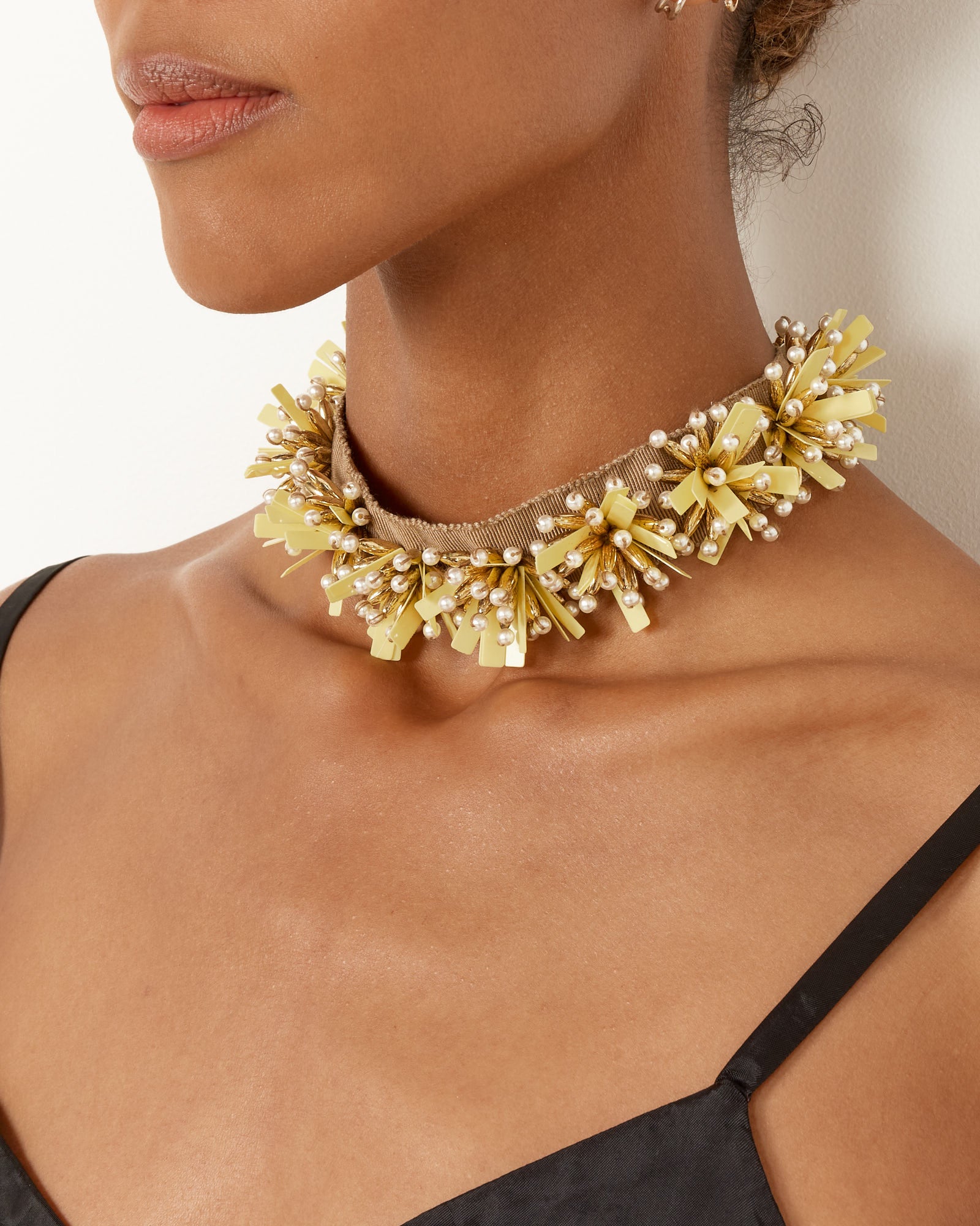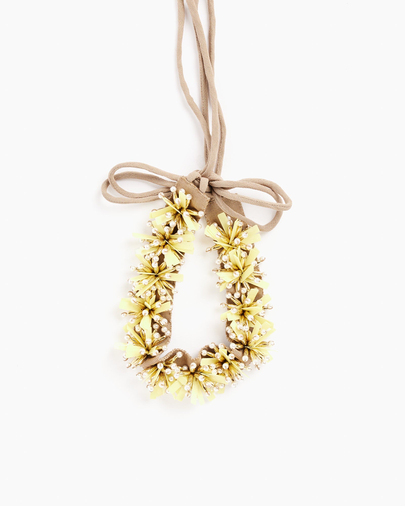 Dries Van Noten's Glitch Necklace in Yellow features beads embroidered across a grosgrain viscose collar with adjustable lace ties.