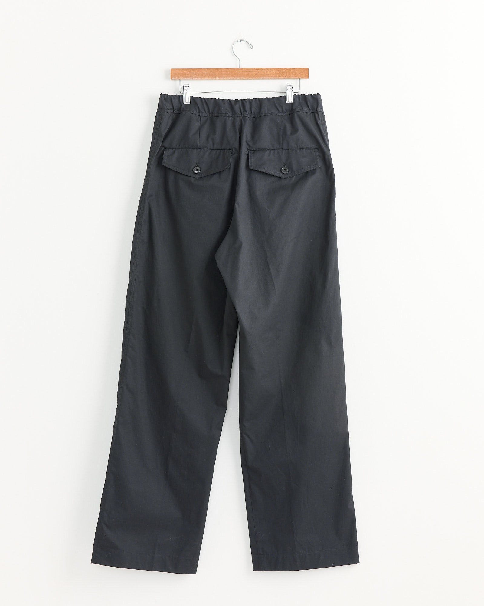 The Dries Van Noten Parachute Pants in Navy are regular-fit, wide-leg pants crafted from garment-dyed cotton. Designed with side slit pockets, back jetted pockets, an elasticated hem and waistband, and a front button closure.