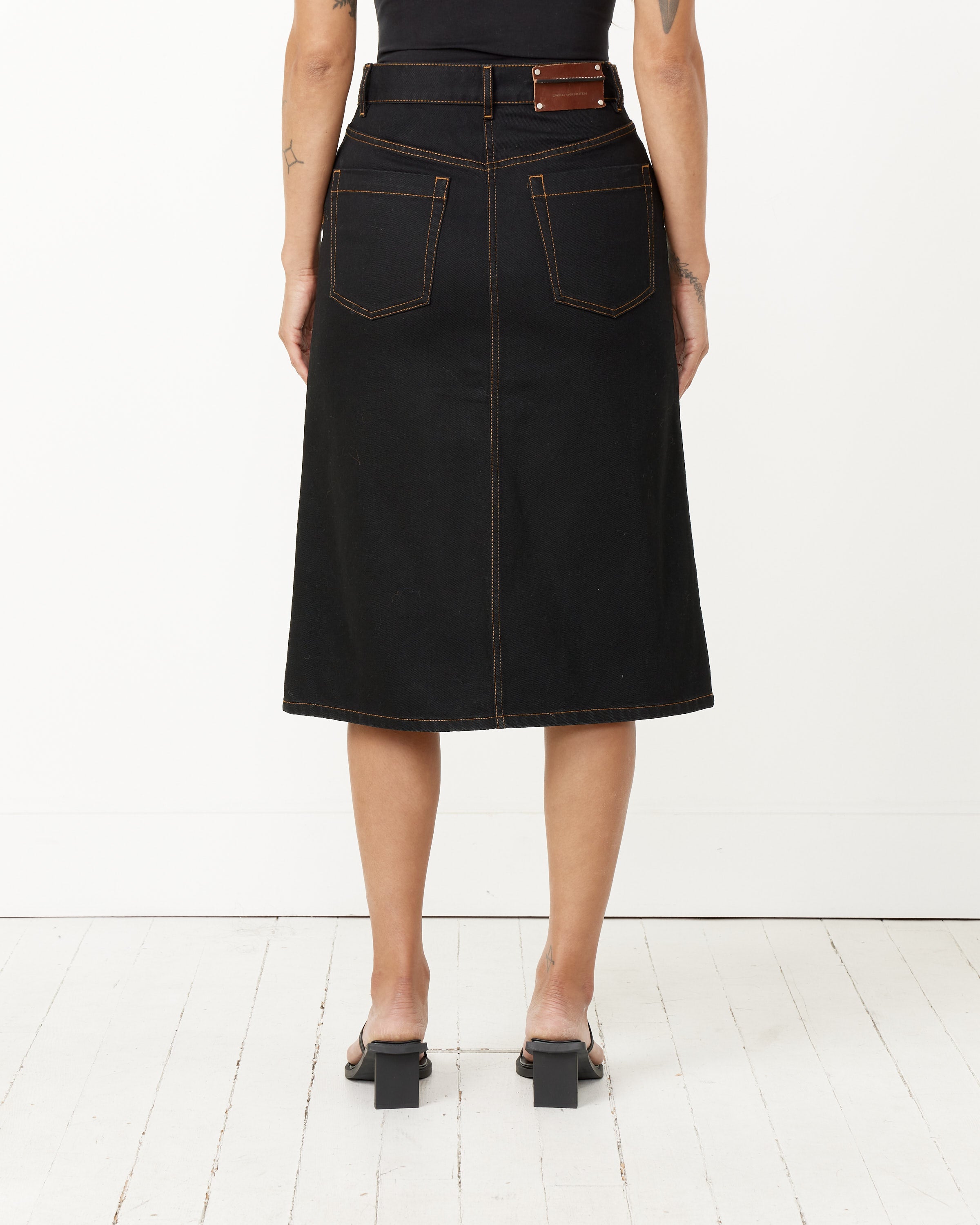 Dries Van Noten's Black Denim Skirt merges aspects of the timeless jean, such as 5-pocket styling in hardy denim with contrast stitching, with a knee-length A-line skirt silhouette vented by a slit at the front hem.