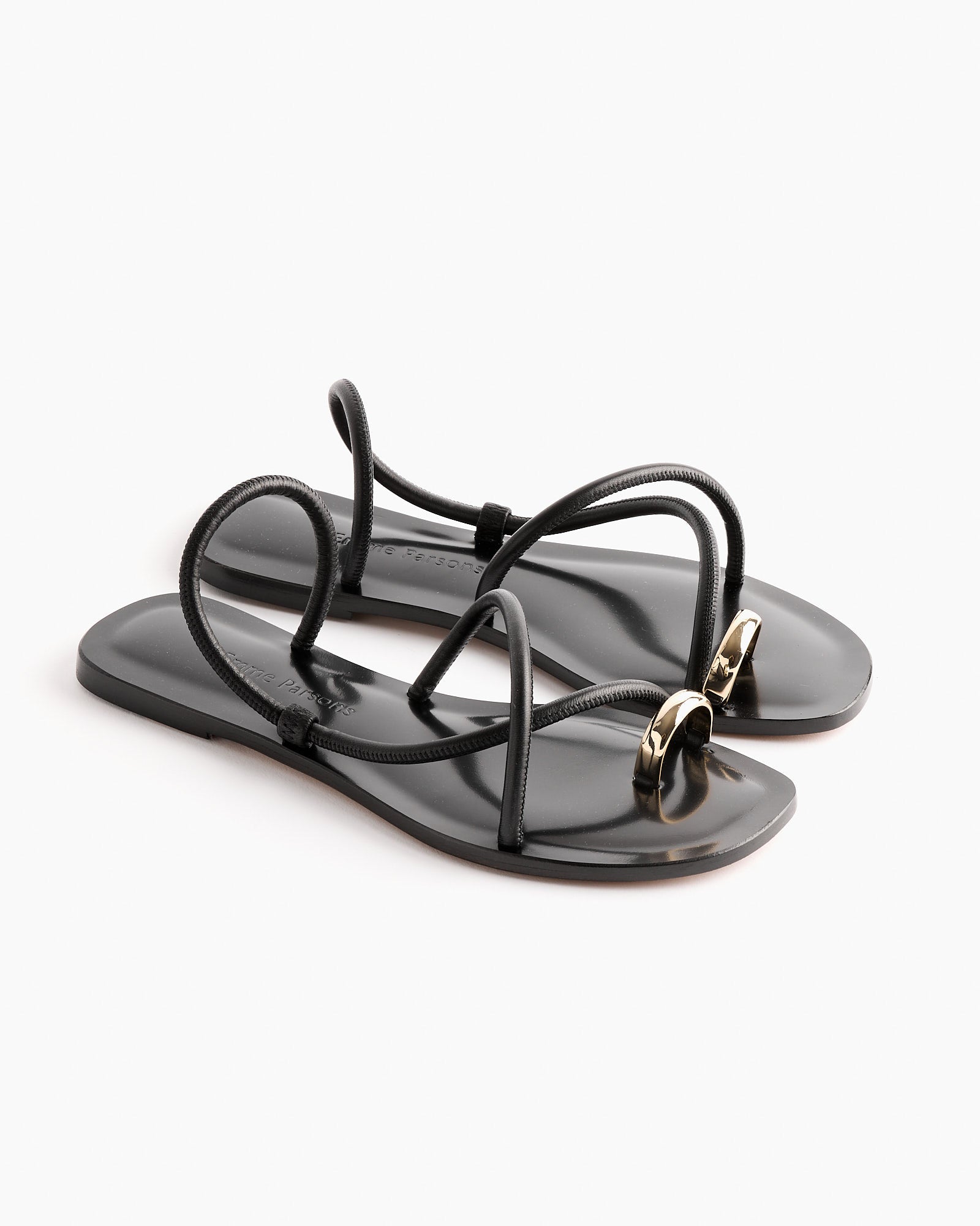 The Emme Parsons Laurie Sandal in Black is a minimal silhouette accented by a sculptural gold toe ring. Soft nappa cording wraps over the vamp, creating a secure and refined fit. Designed to sit across the top of the foot, the strap offers an elegant alternative to a traditional ankle style.
