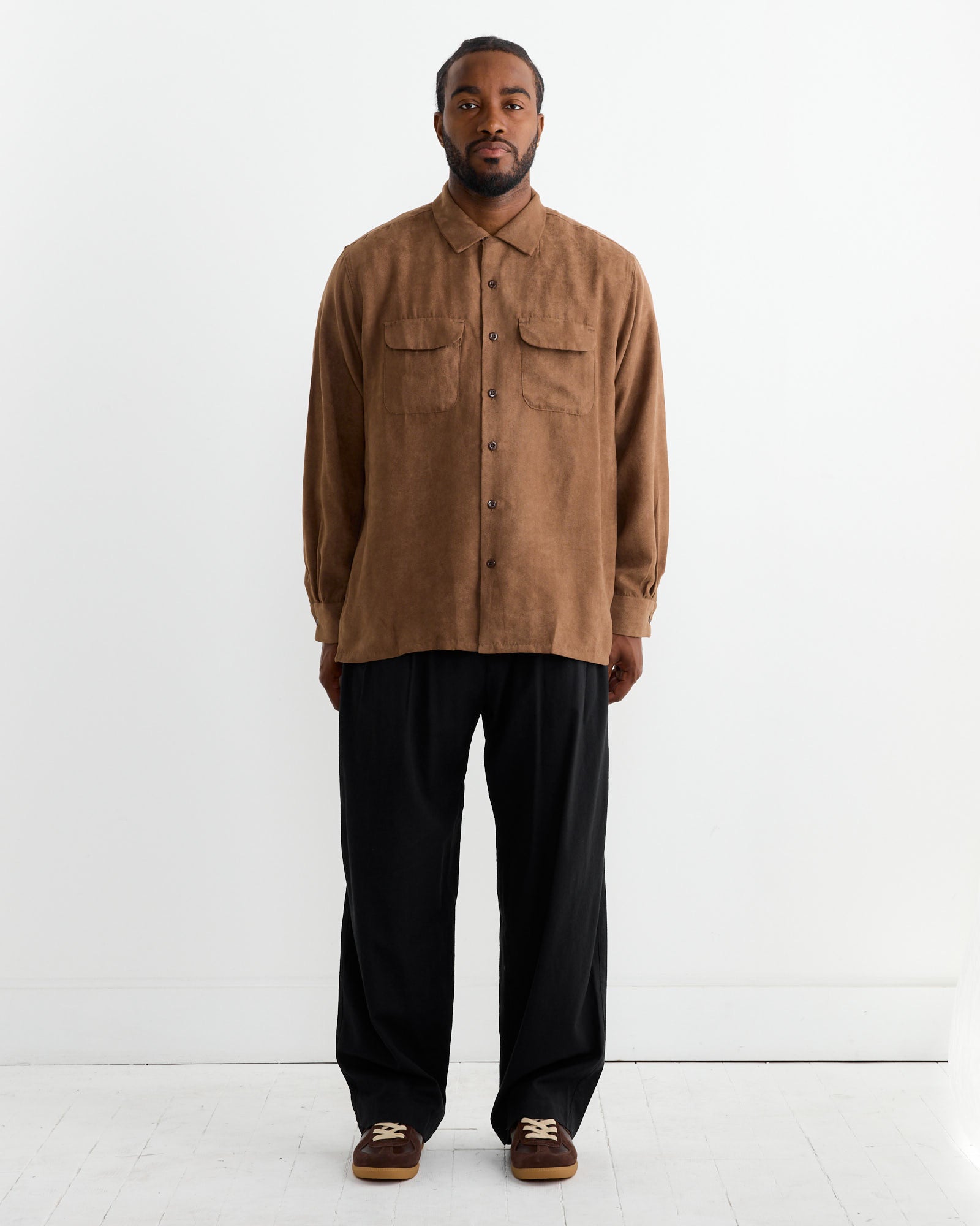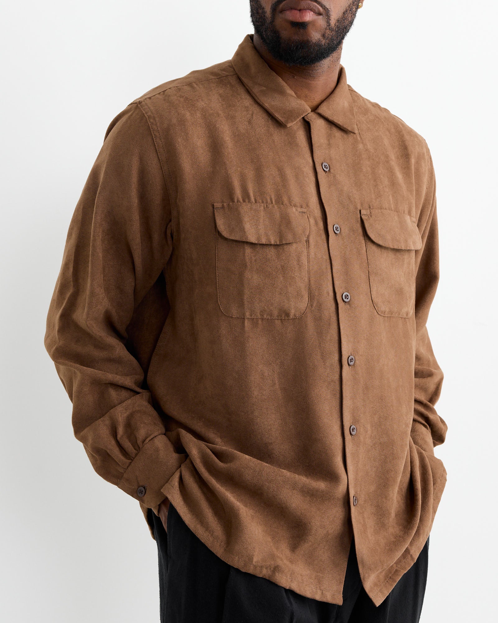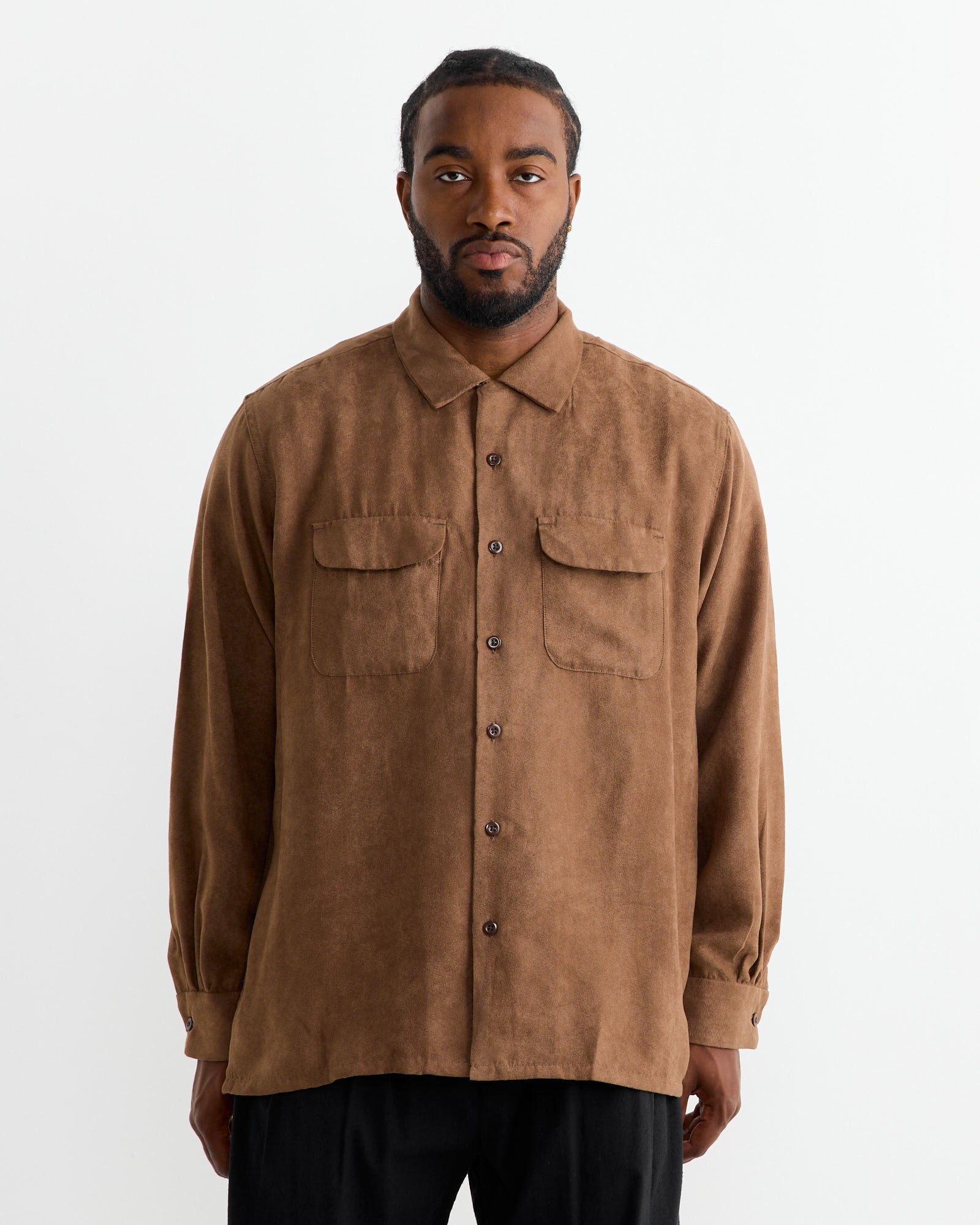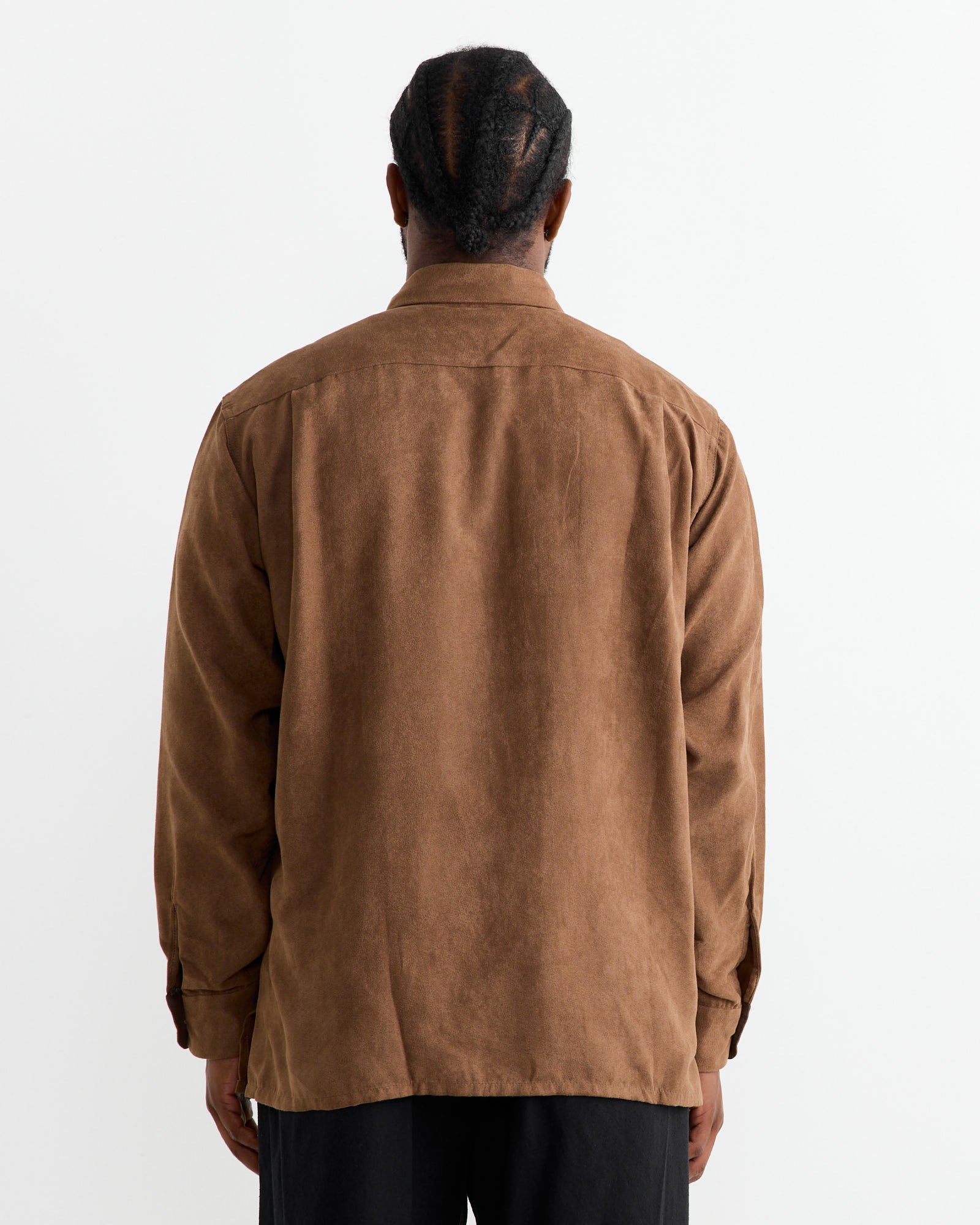 Engineered Garments' Classic Shirt returns this season in a polyester faux suede fabric with a nuanced texture and features a convertible spread collar, flap pockets, vented outseams, and twin pleats at the back yoke.