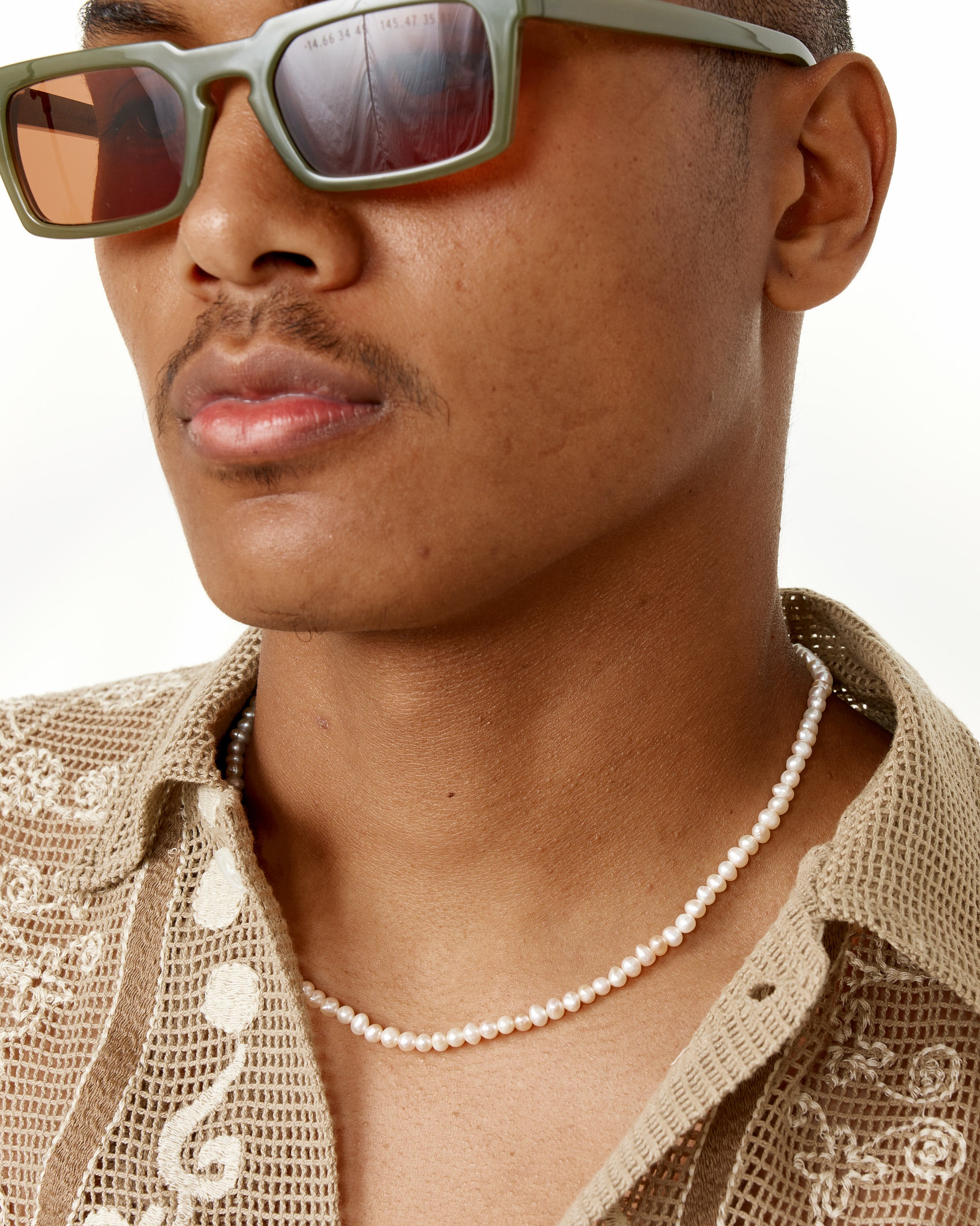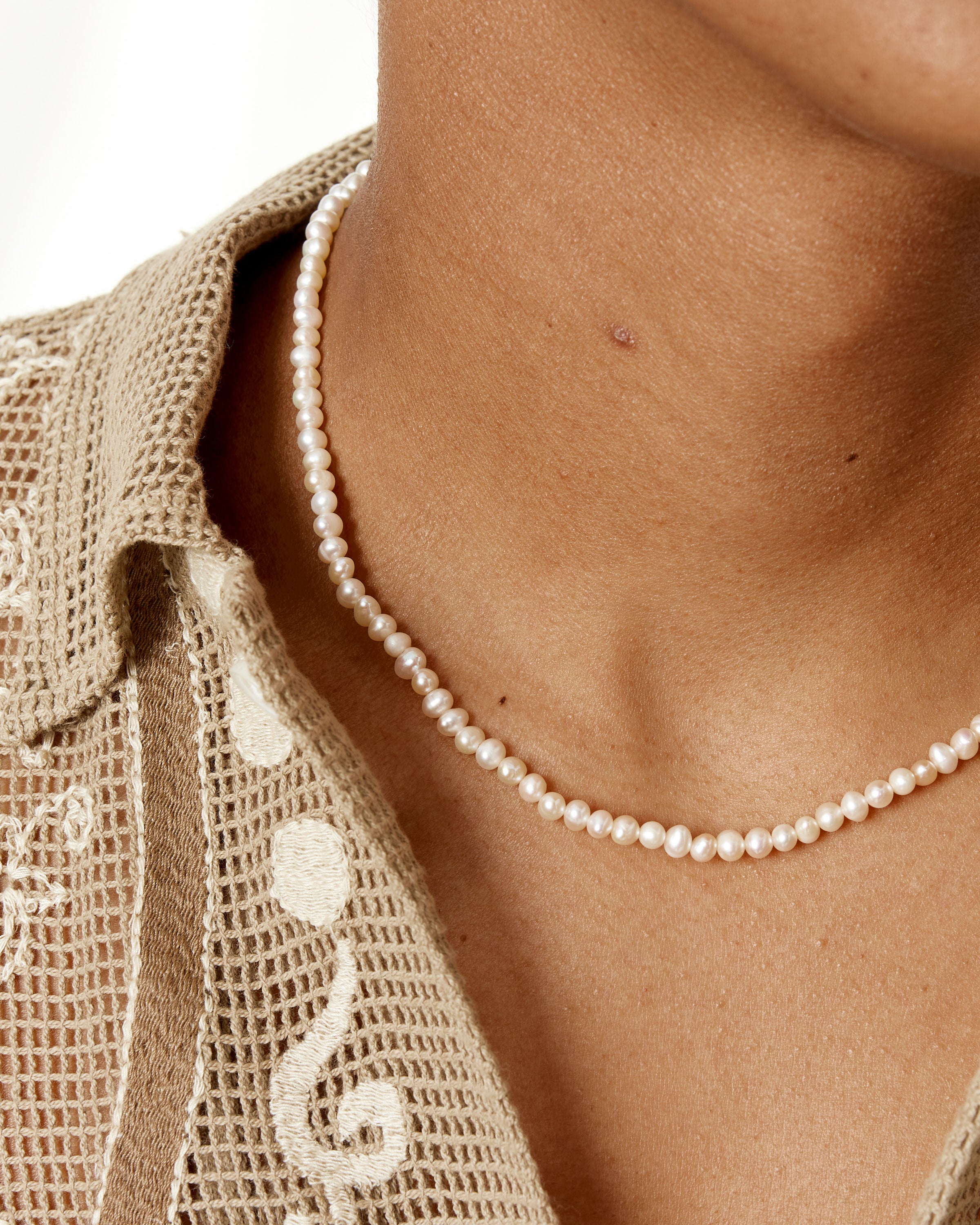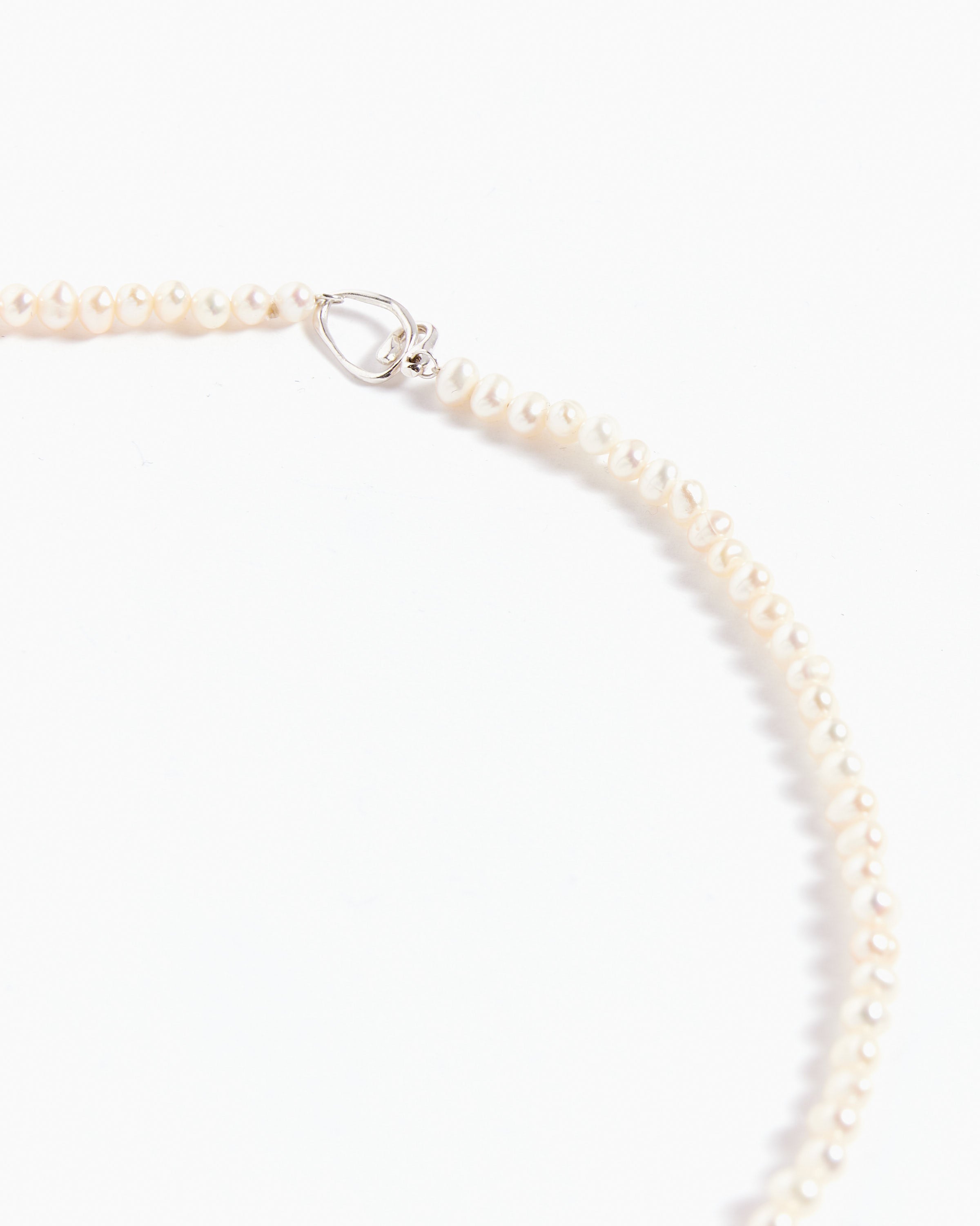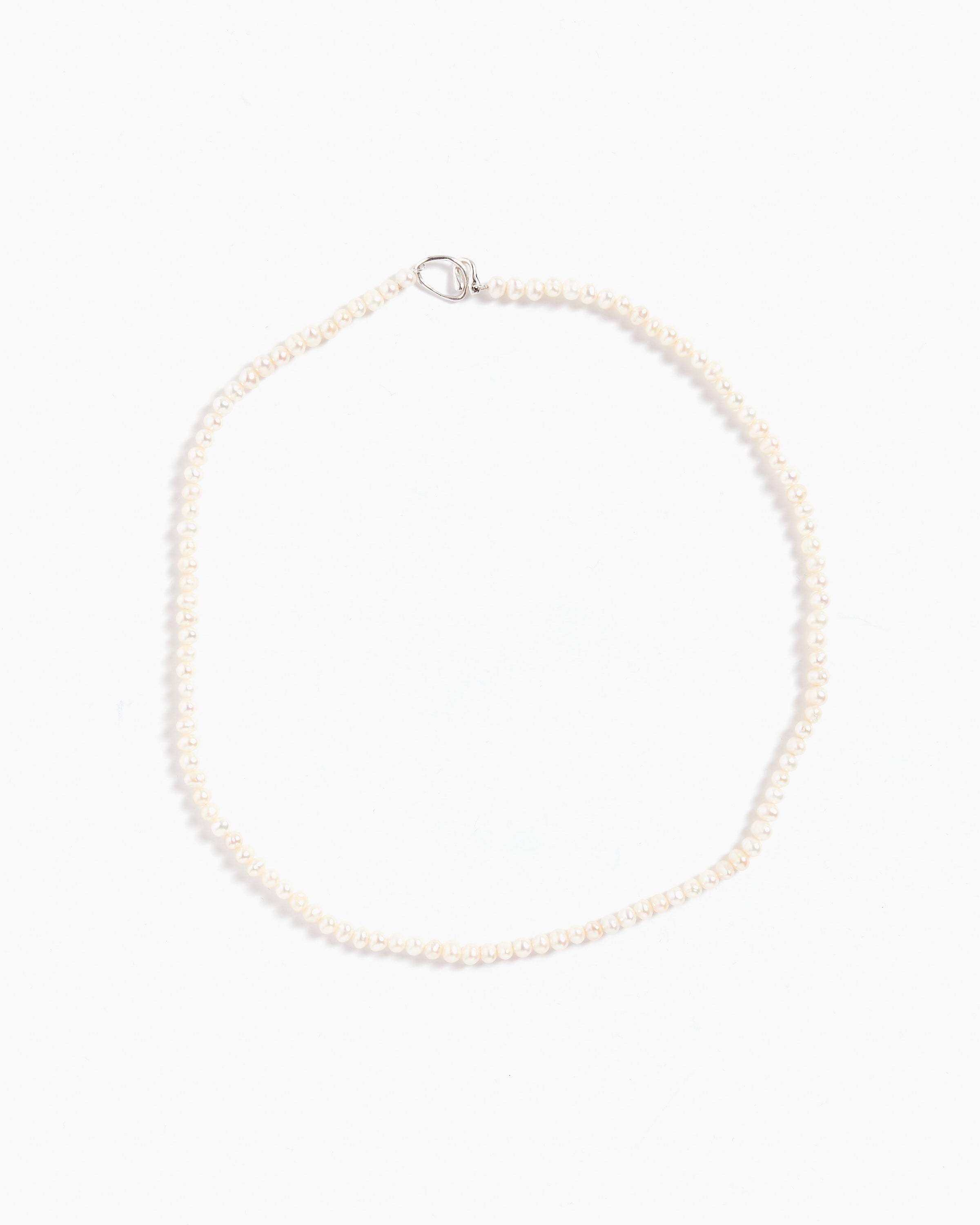 Faris's Seed Necklace in Sterling Silver is a delicate, everyday strand of seed pearls with a hand-carved clasp done in sterling silver. Wear on its own or layered with other bracelets.
