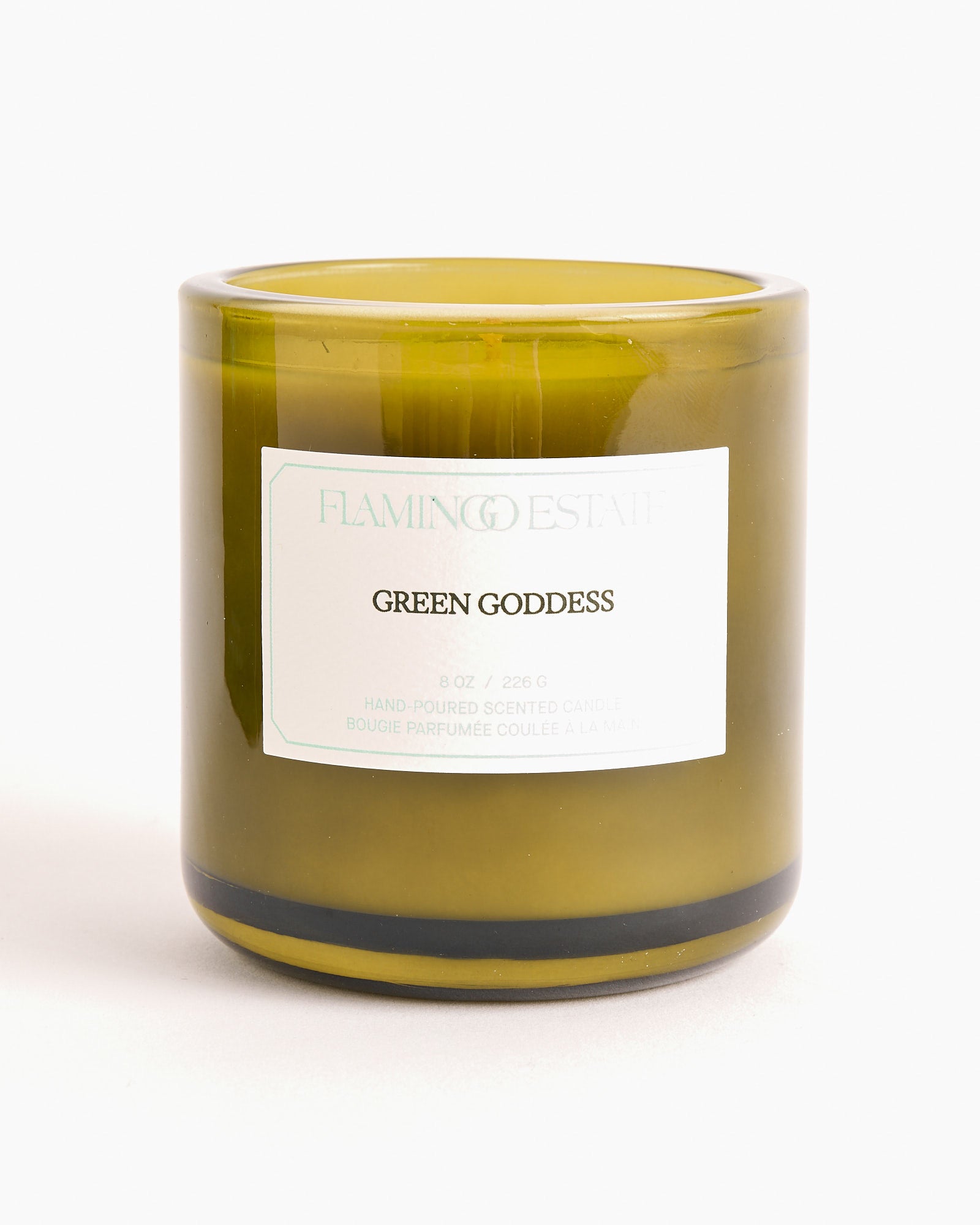 The Flamingo Estate Green Goddess Candle is a lush blend of freshly picked basil, sharp mint, bright pea tendrils, and warm golden ginger, evoking the vibrant energy of a garden at golden hour.