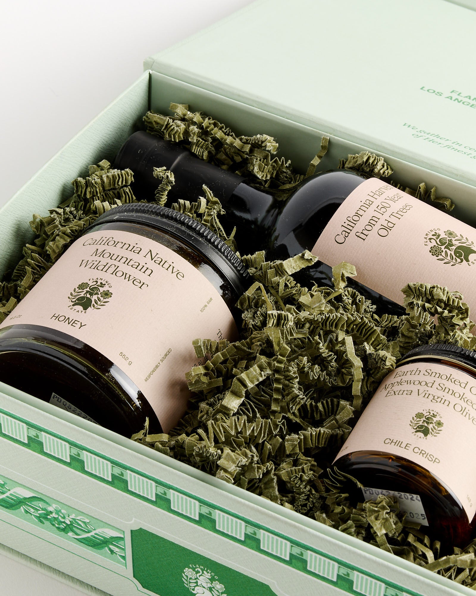 The Chef's Kiss from Flamingo Estate is a curated set of gourmet essentials designed to enhance any culinary creation. This set includes their signature Heritage Extra Virgin Olive Oil, Biointensive Native Wildflower Honey, and Mini Salsa Macha, all crafted with the finest ingredients. Thoughtfully packaged in an embossed gift box with a grosgrain bow, it’s perfect for gifting or treating yourself.
