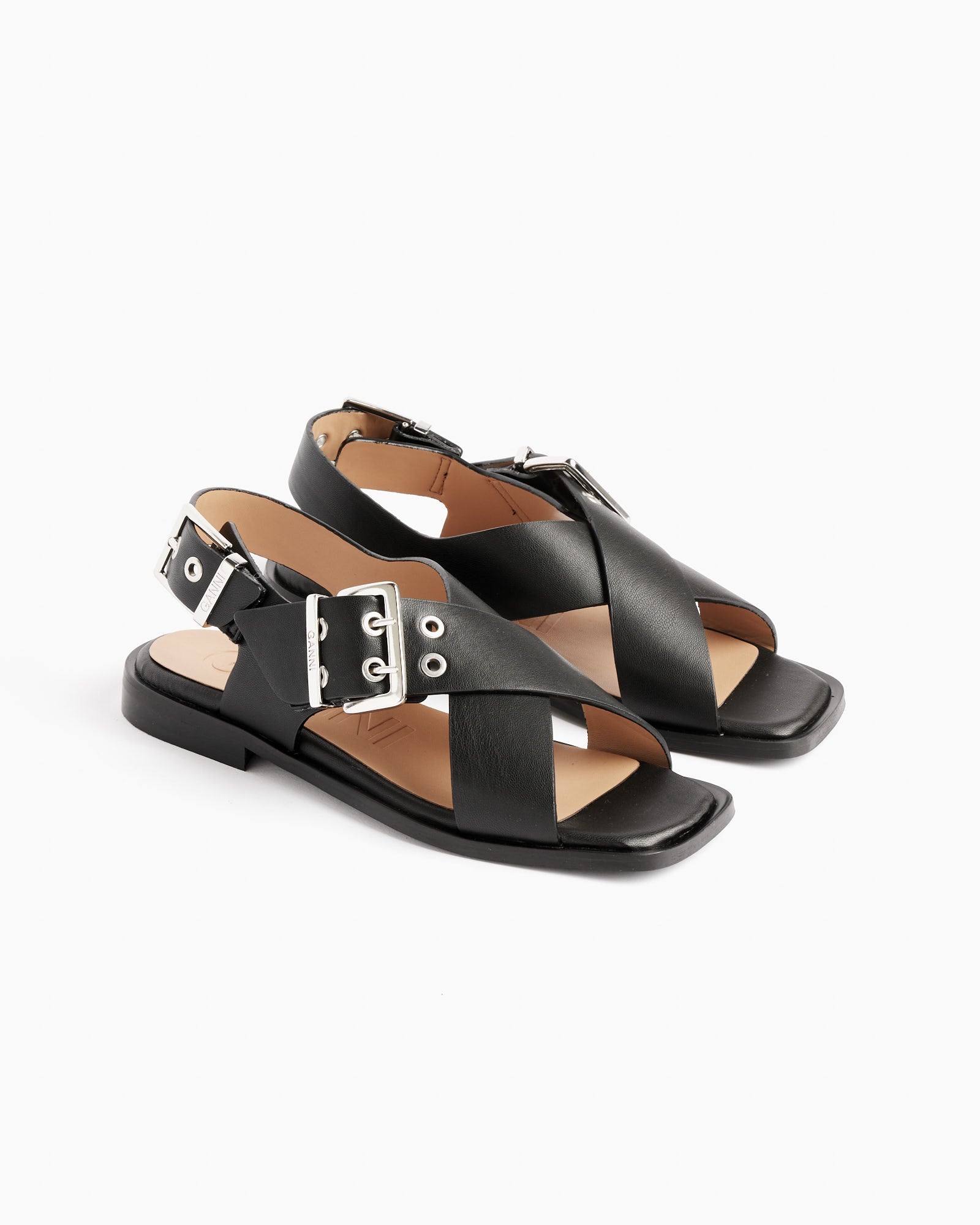Ganni's Feminine Buckle Strap Sandal features a faux-leather cross-strap upper with buckle fastening, an open square toe, and a rubber sole.
