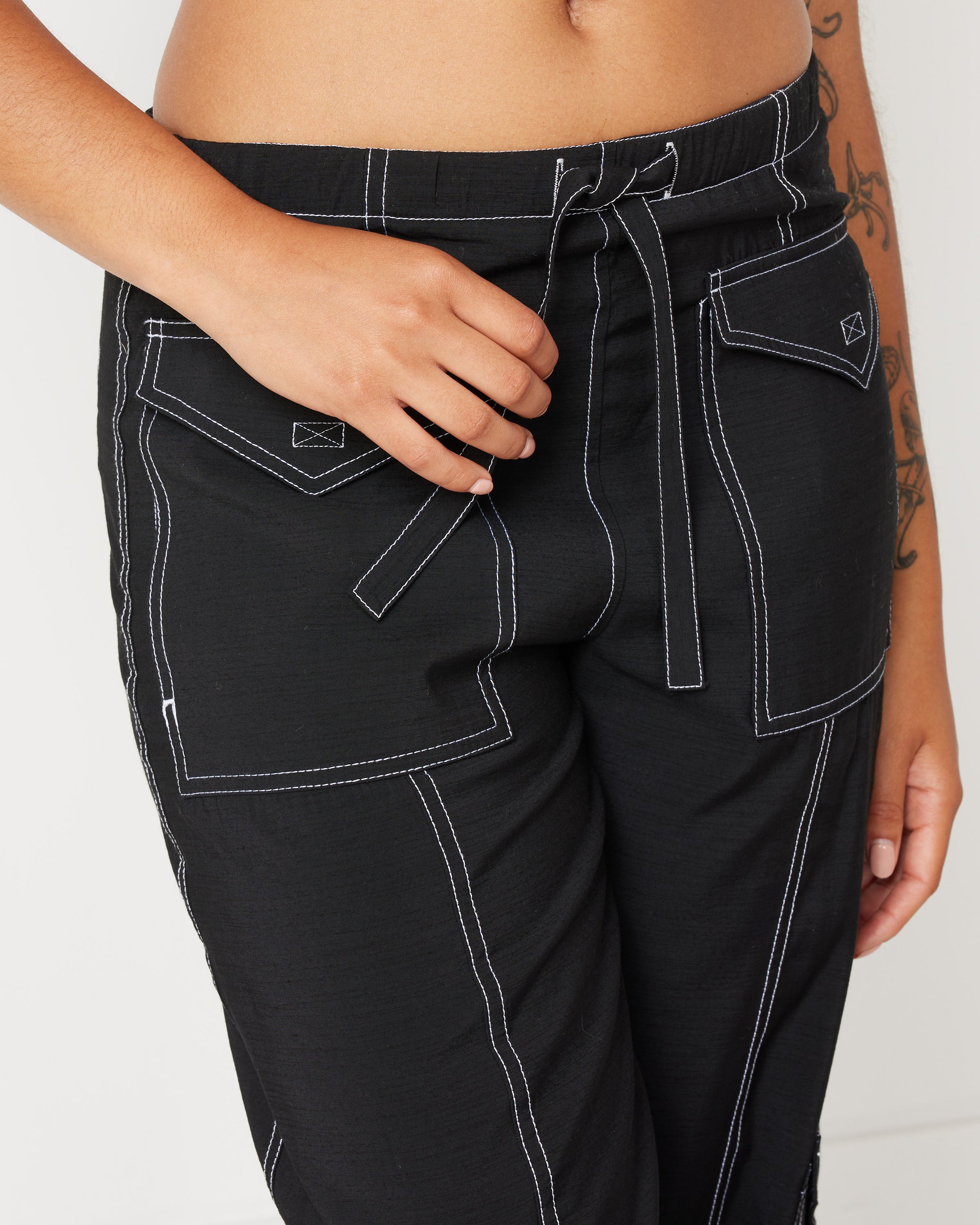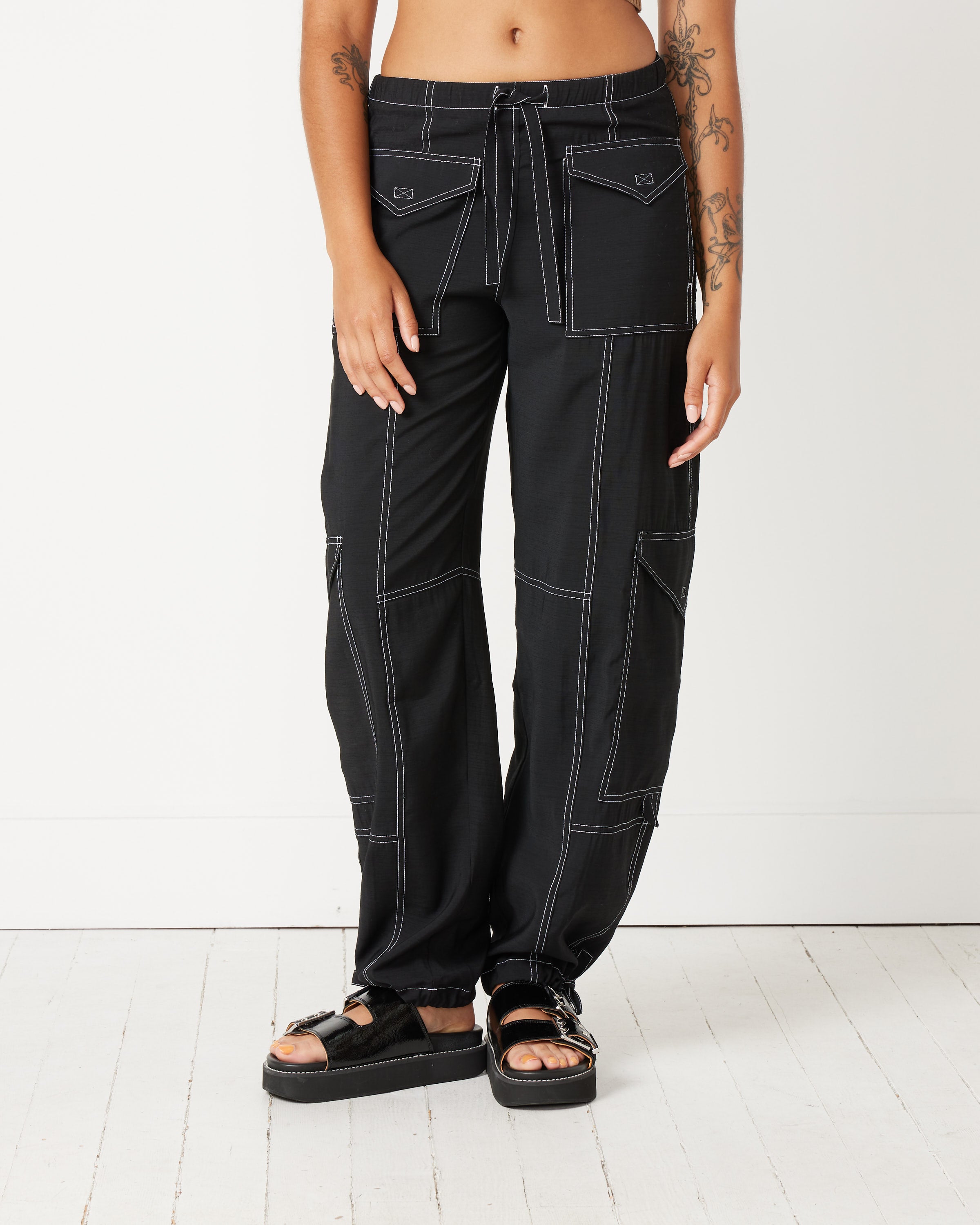 Ganni's High Waist Pocket Pant are done in a smooth, lightweight blend of viscose recycled polyester, cut with a relaxed fit, and feature contrast stitching, four large flap pockets, and a drawstring closure across the waist and ankles.