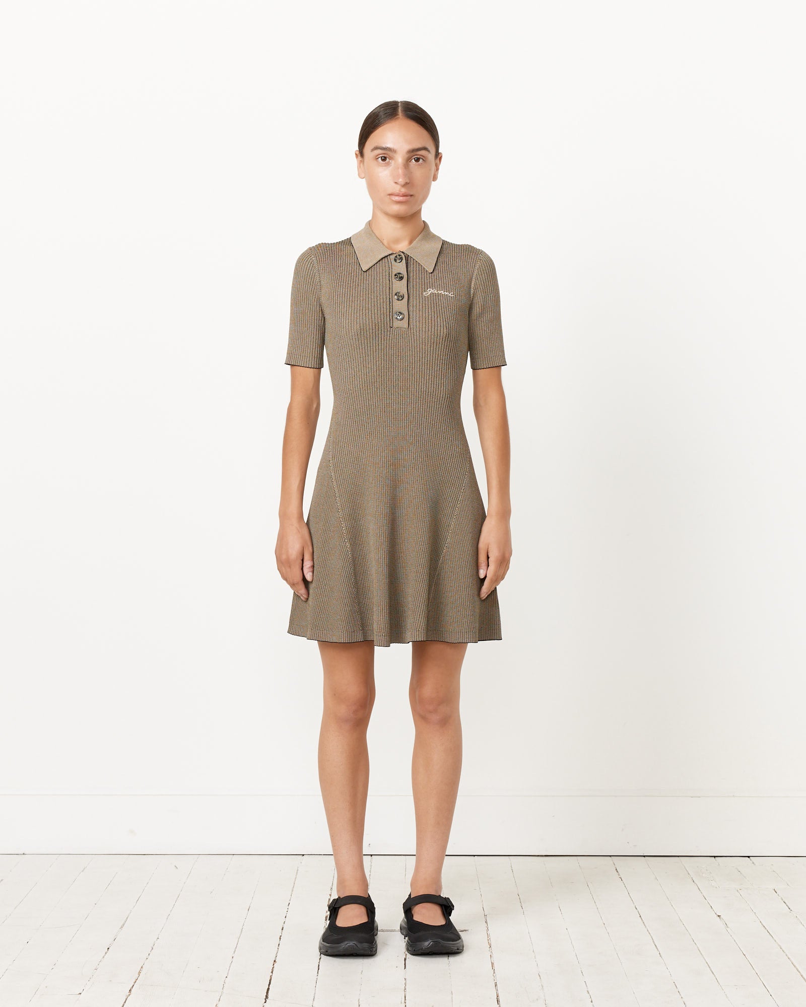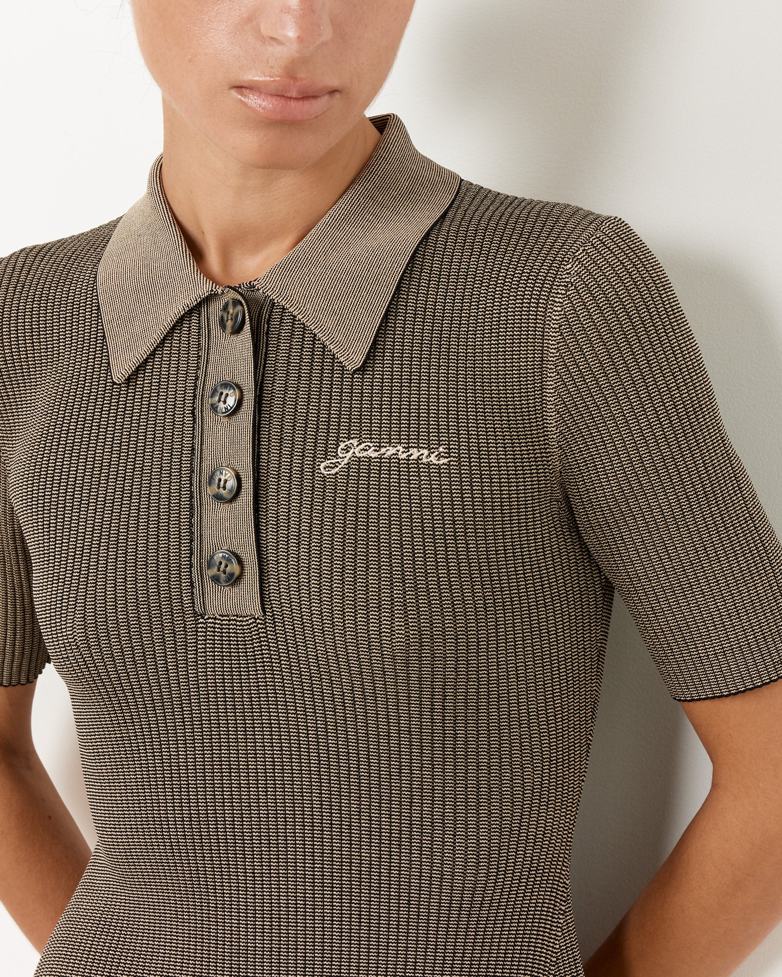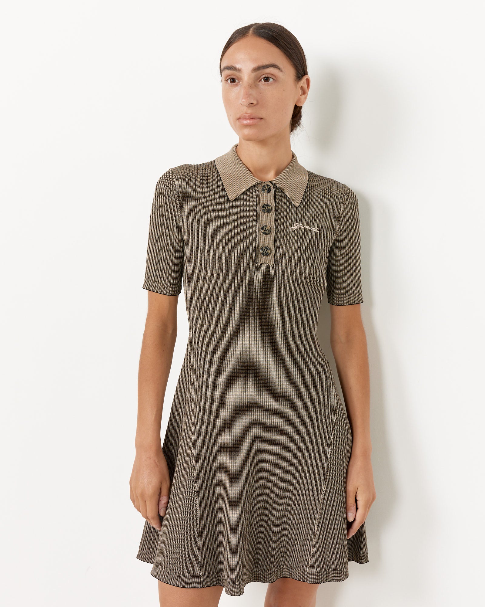 Ganni's Melange Knit Mini Dress is cut in a slim, A-line silhouette with a contrast-knit polo collar and placket, short sleeves, and an embroidered Ganni logo.