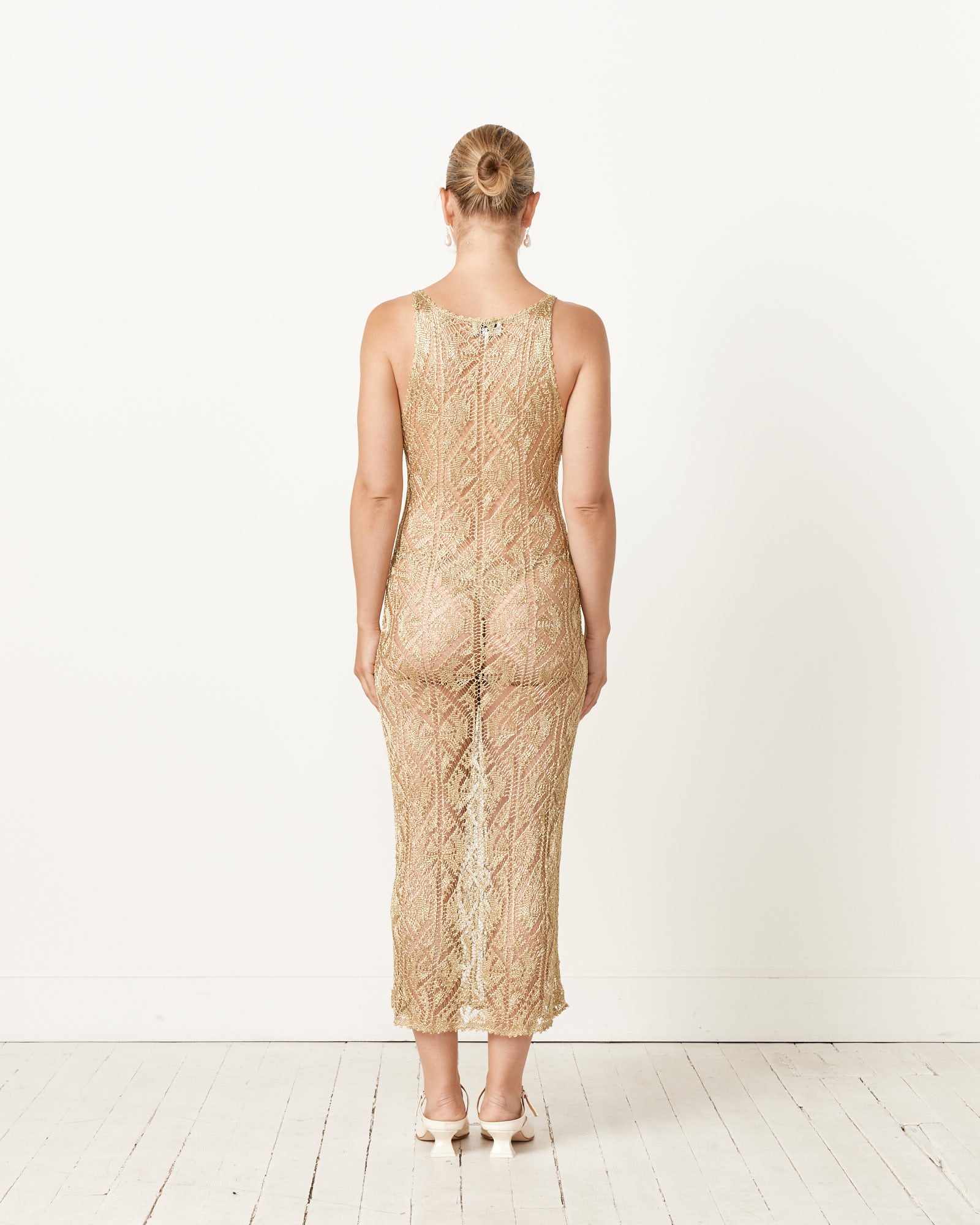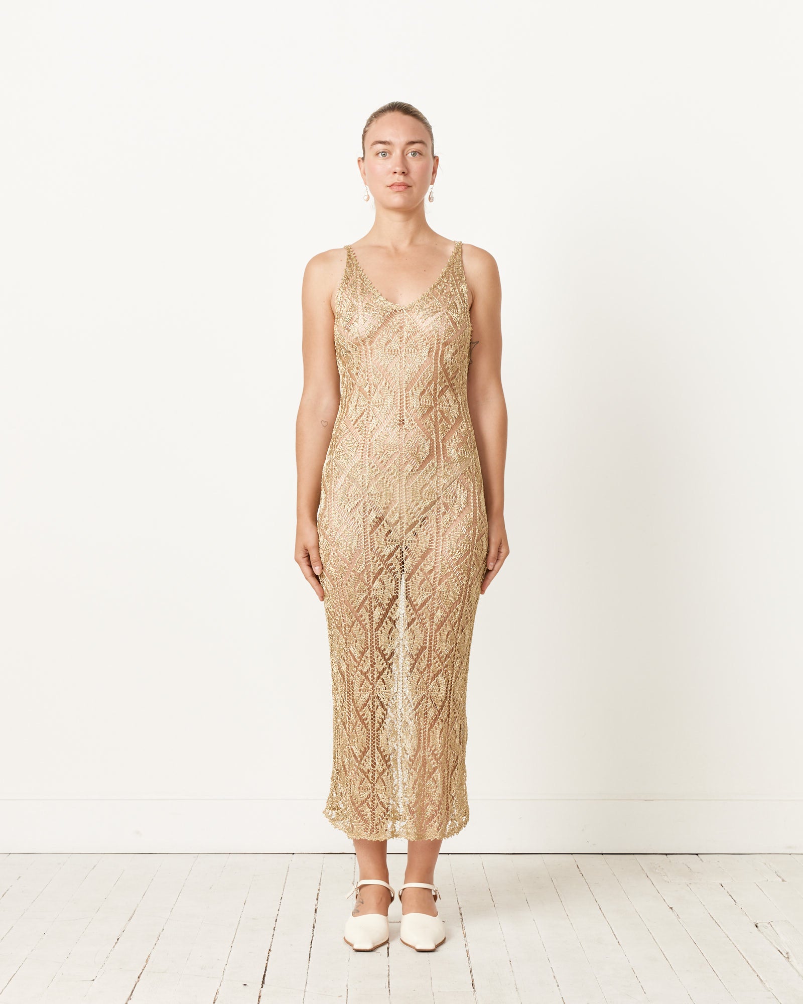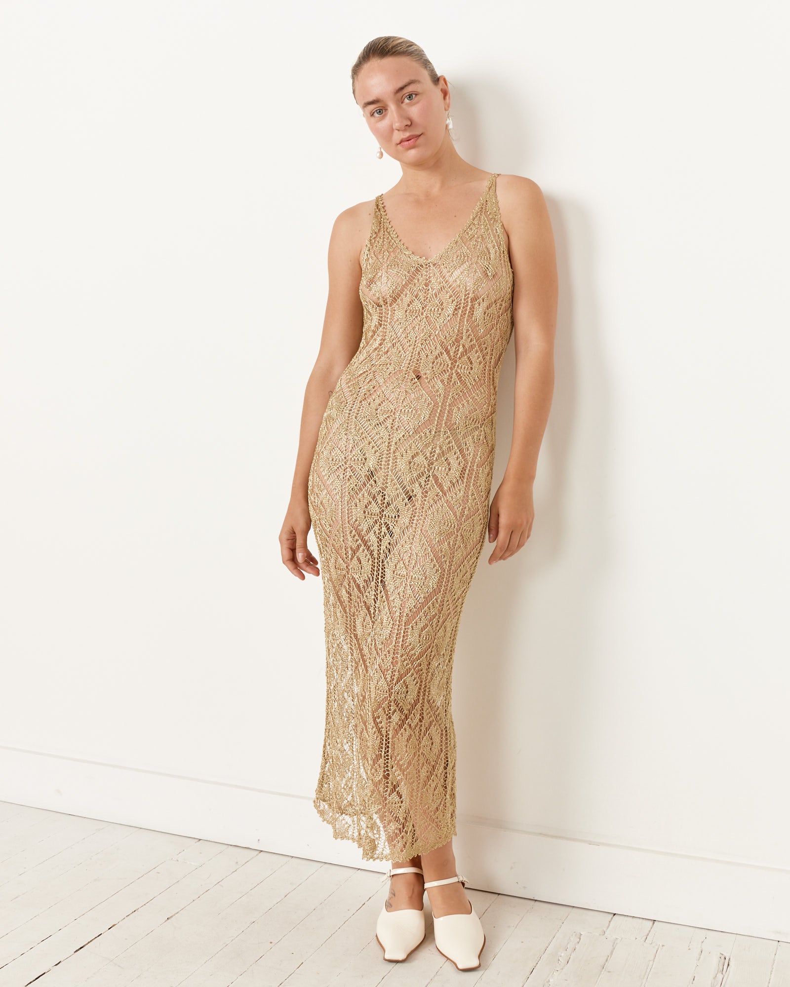 Ganni's sheer Metallic Strap Dress is designed for a close fit over the shoulders, cut straight from the chest, and features a v-necklline.