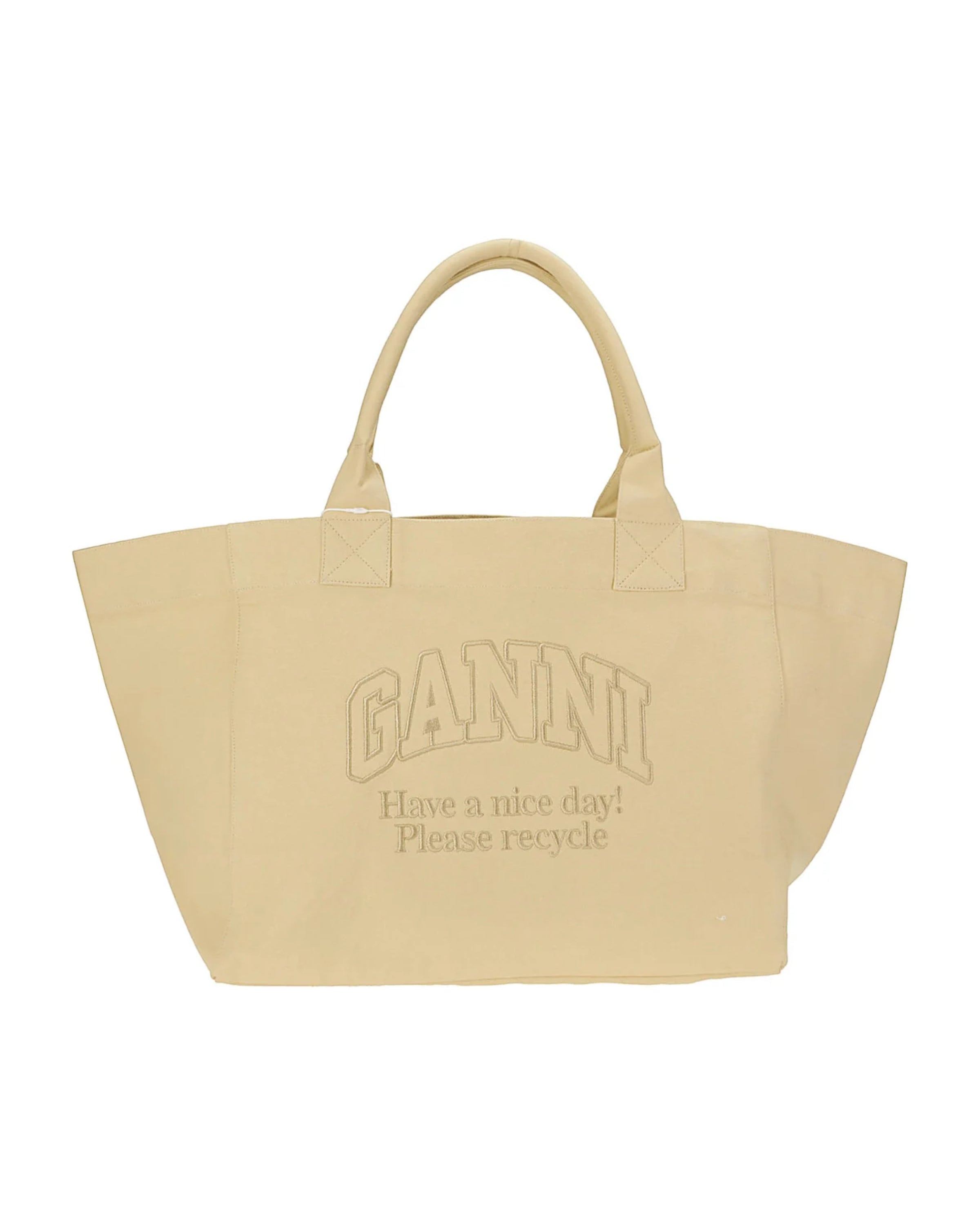 Ganni's Shopper is an eco-friendly tote made from unlined recycled cotton canvas with generous proportions and features drop handles and a logo with the phrases "Have A Nice Day! Please recycle." at one side.