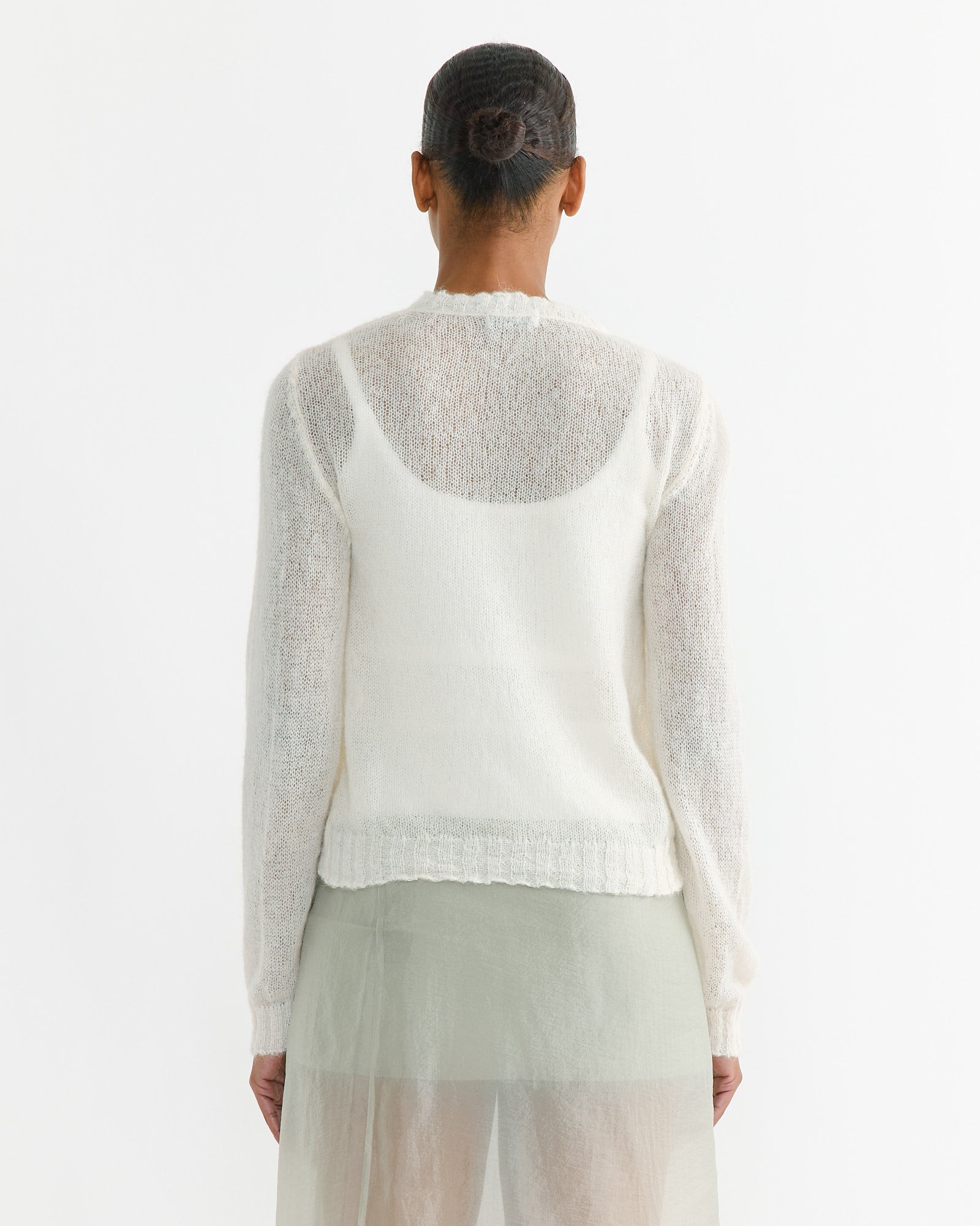 White women's mohair knit cardigan with a soft texture, featuring a round neckline, long sleeves, and tonal button fastening down the front. Finished with ribbed trims at the hem, neckline, and cuffs.