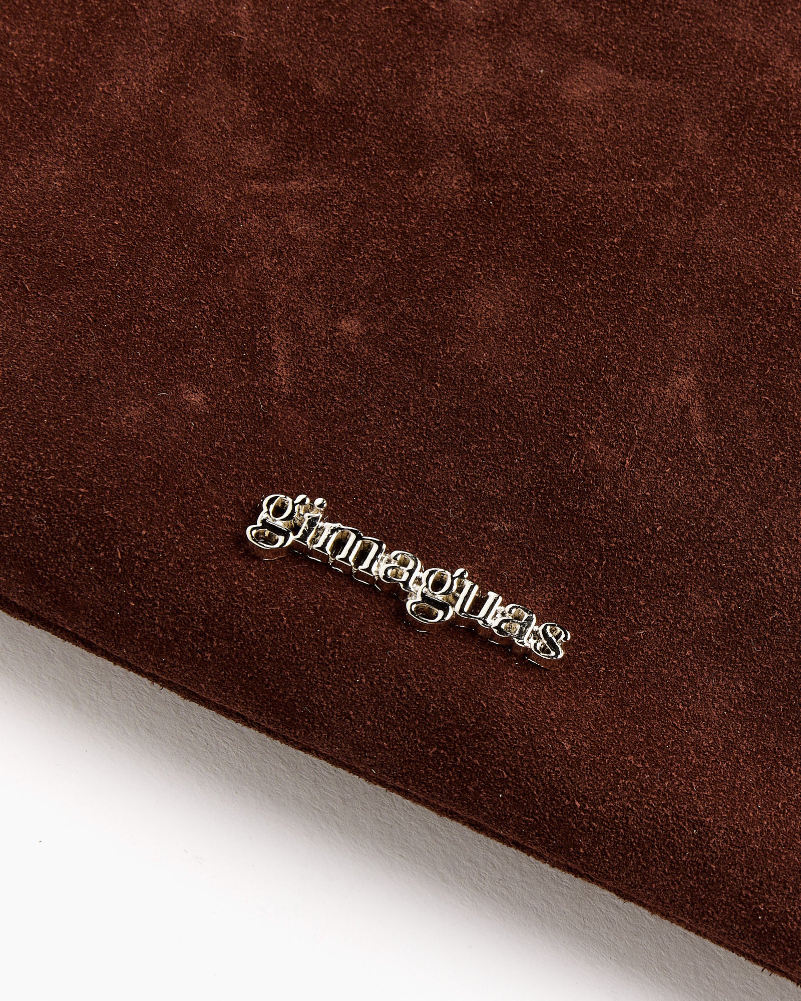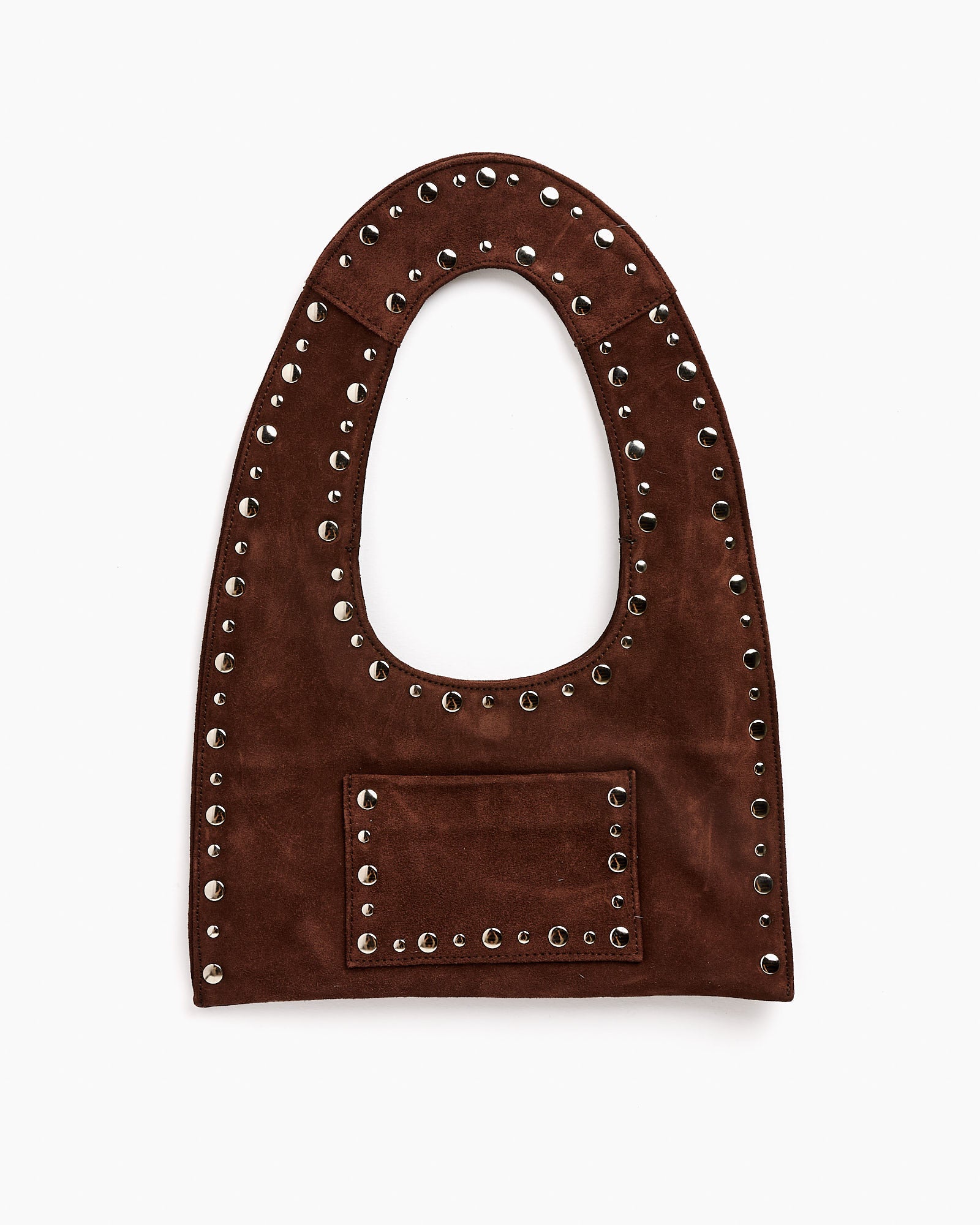 The Gimaguas Mini Franca Bag in brown is a stylish and compact shoulder bag made from 100% suede leather. This bag, embellished with metal studs for a unique design, offers both fashion and function with an outer pocket for added convenience.
