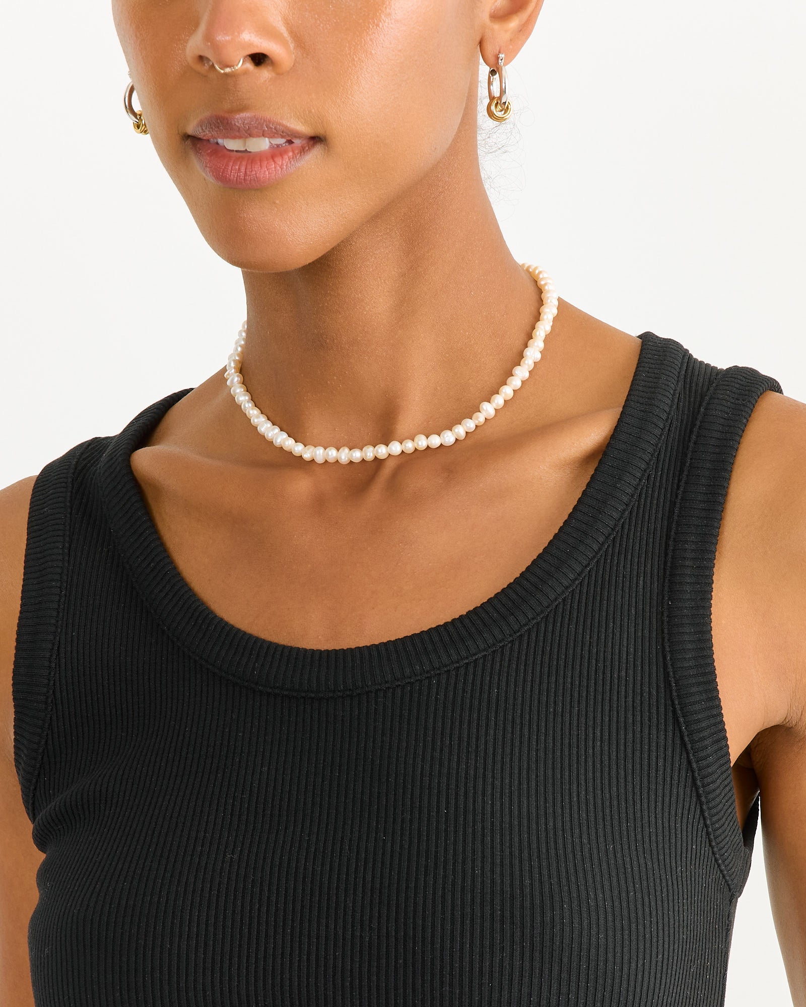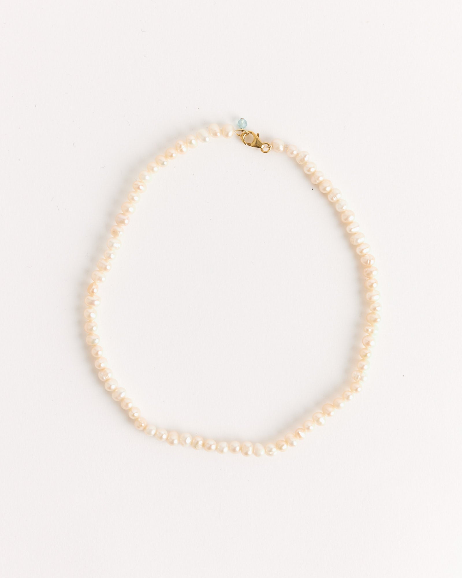 Hai's Betty Necklace is a timeless piece featuring mismatched organic freshwater pearls with an 18ct gold-plated silver clasp and a dropped Chalcedony stone.