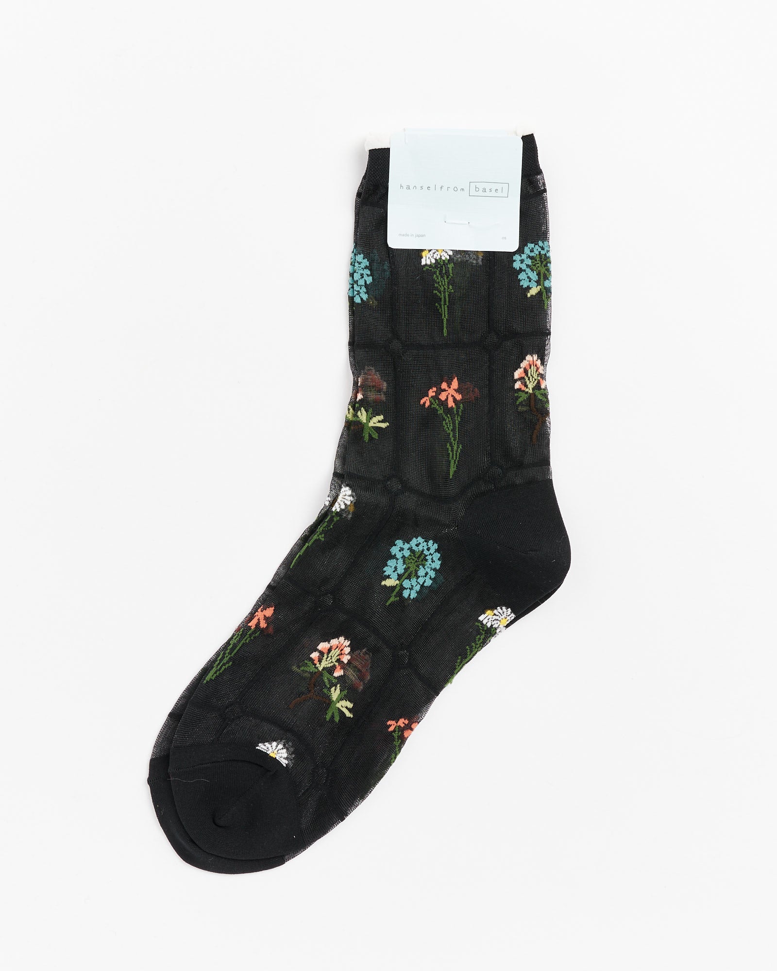 The Hansel From Basel Horticulture Sheer Crew is a black semi-sheer women’s sock with a colorful floral pattern, shown flat on a white background and topped with a light blue "Made in Japan" label.