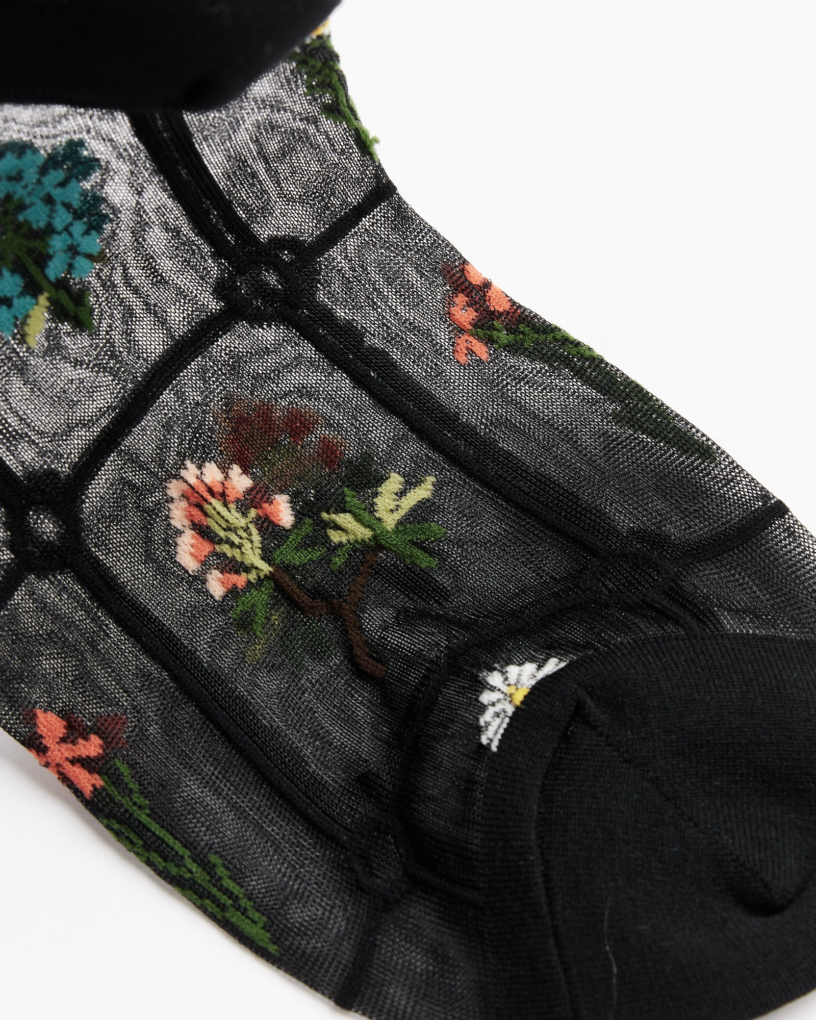 A close-up of Hansel From Basel’s Horticulture Sheer Crew socks, featuring sheer black fabric, colorful floral embroidery, a solid black toe, and made in Japan. Stylish women’s crew socks perfect for botanical flair.