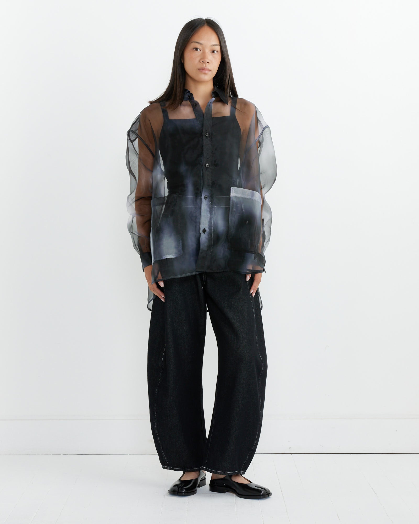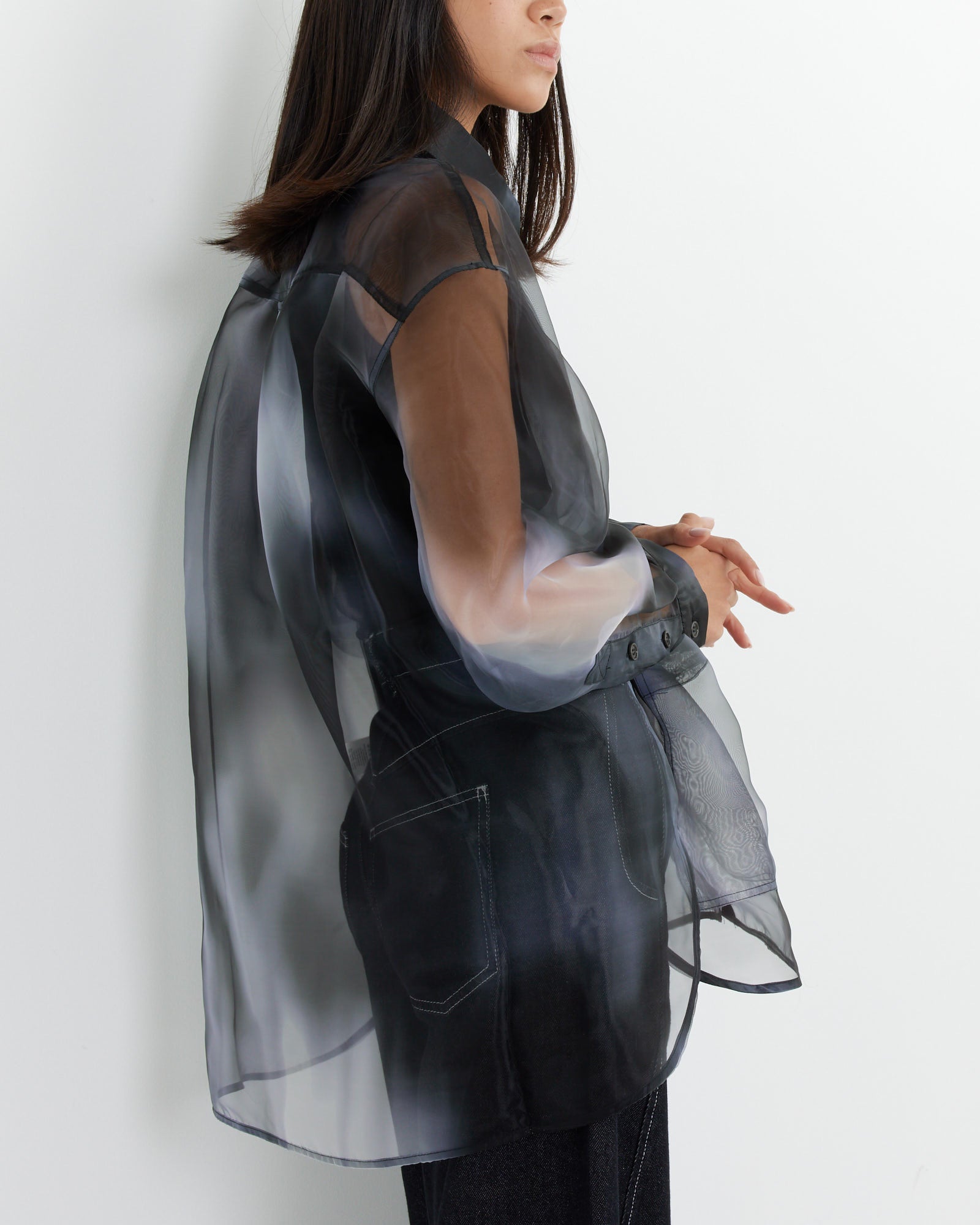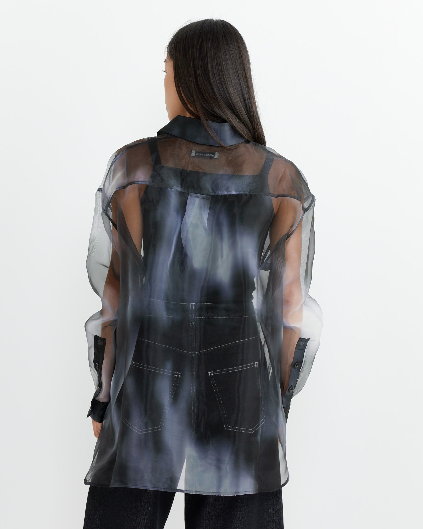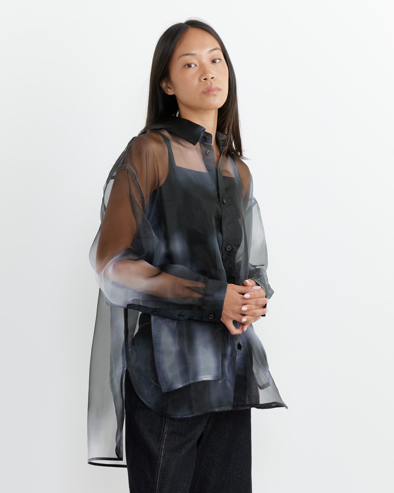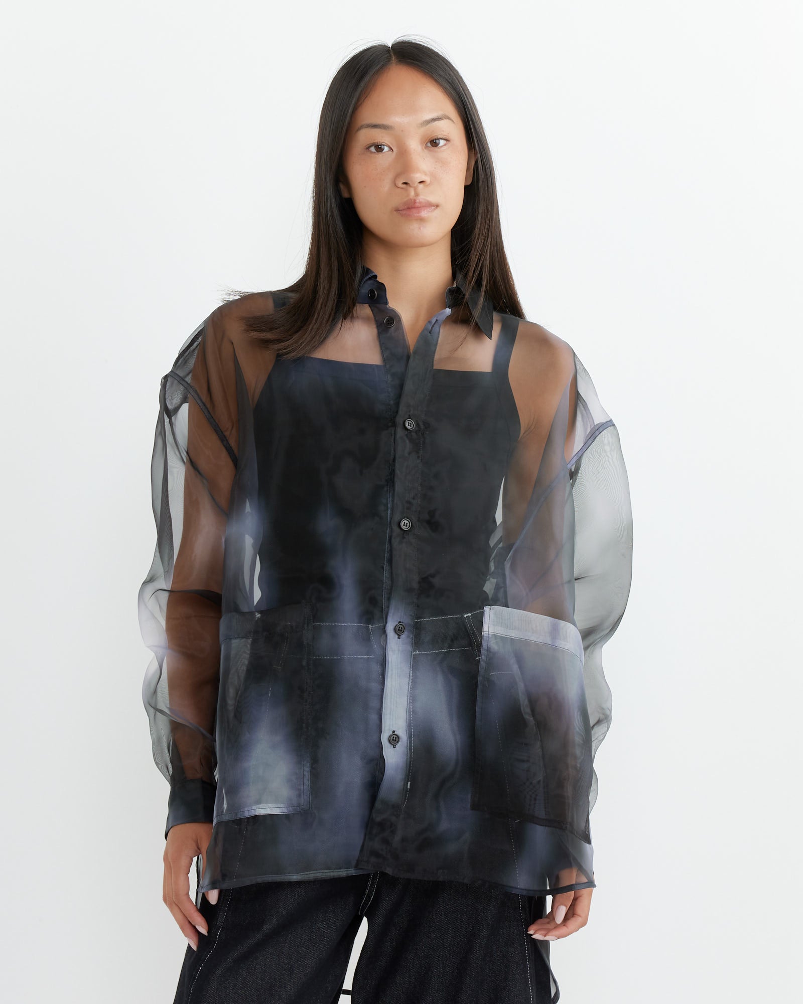 Henrik Vibskov's Big Shirt is crafted in a see-through polyester cut in a relaxed silhouette with a classic collar, two flap pockets at the front, and a curved hemline.