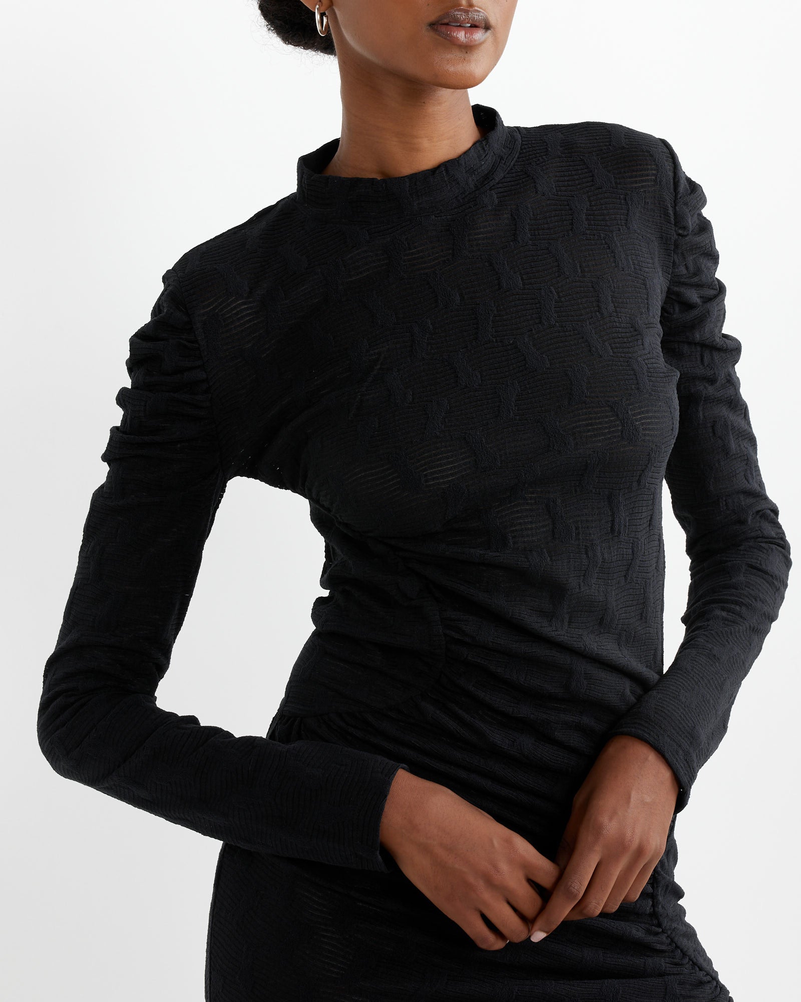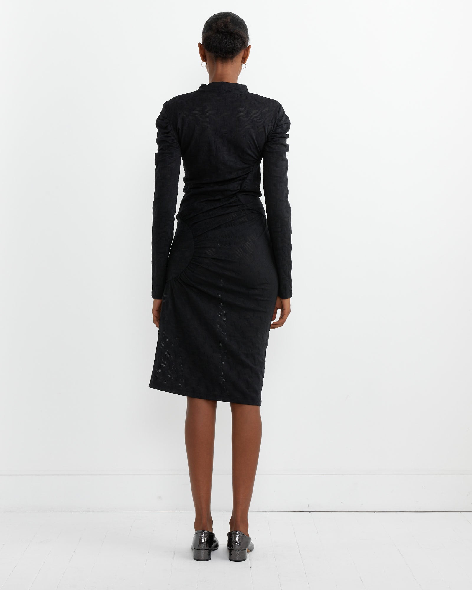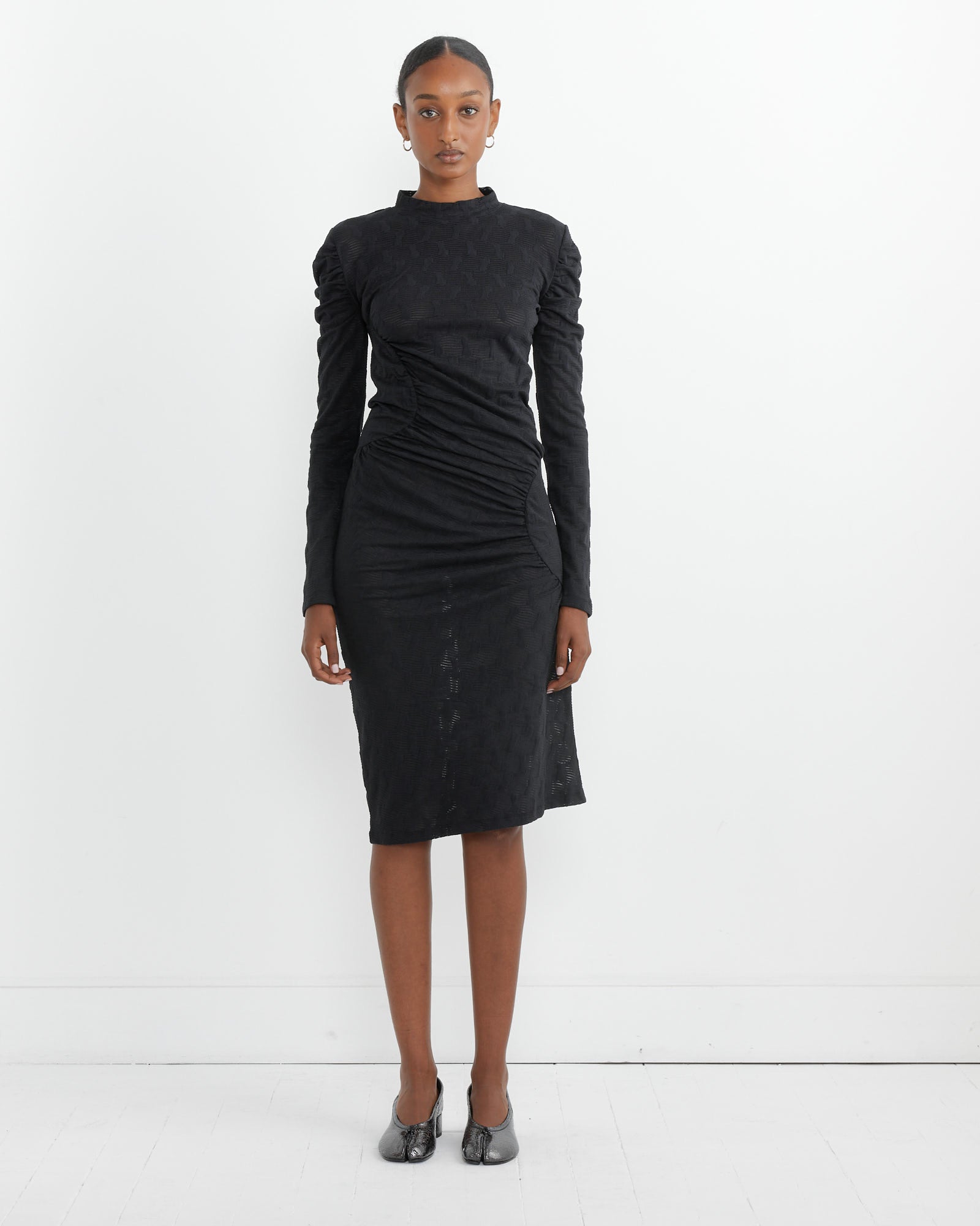 Henrik Vibskov's Sun Dress is cut from a semi-sheer stretch polyester fabric with dot detailing throughout, a high neckline flanked by long sleeves, and an asymmetrical hip design.