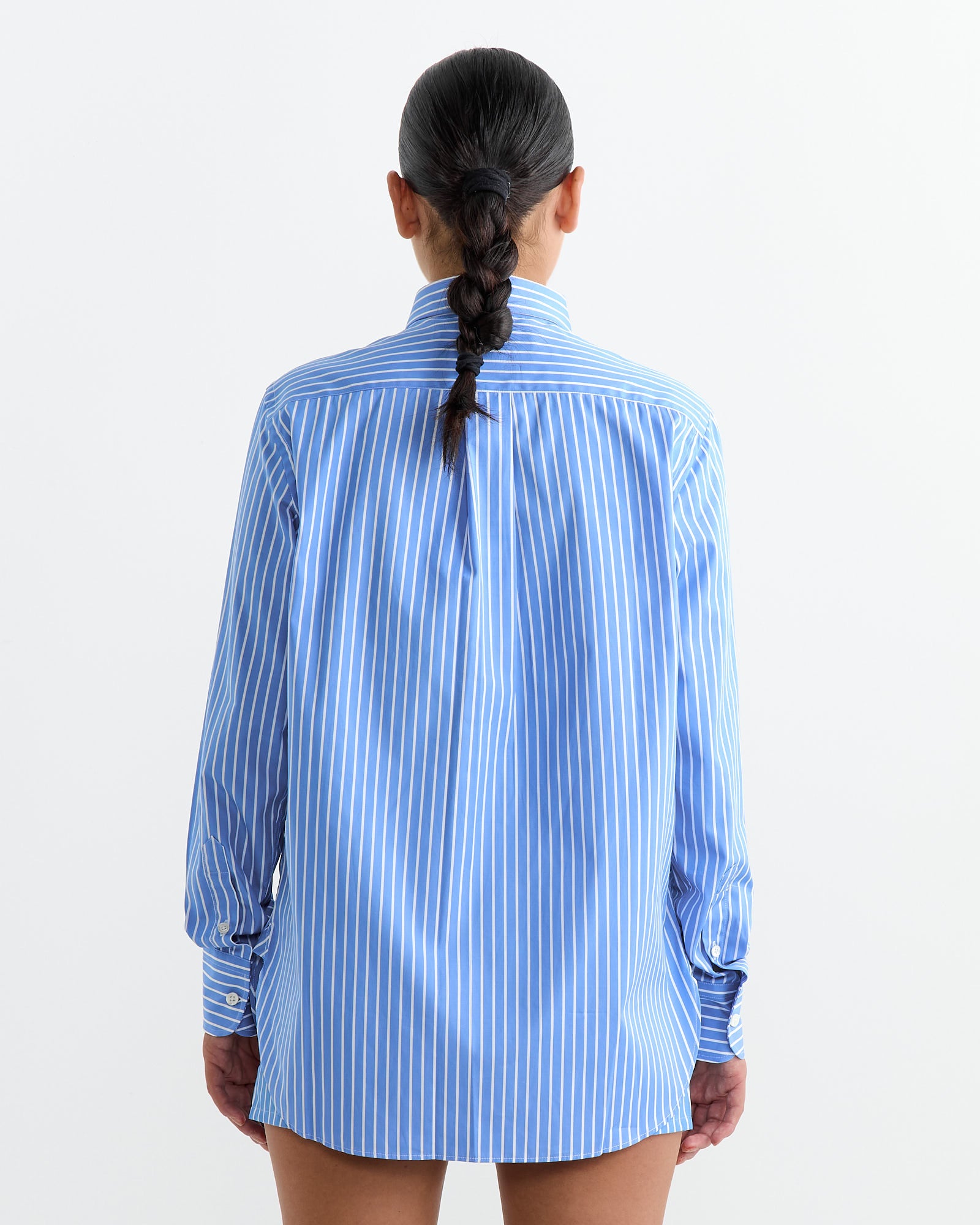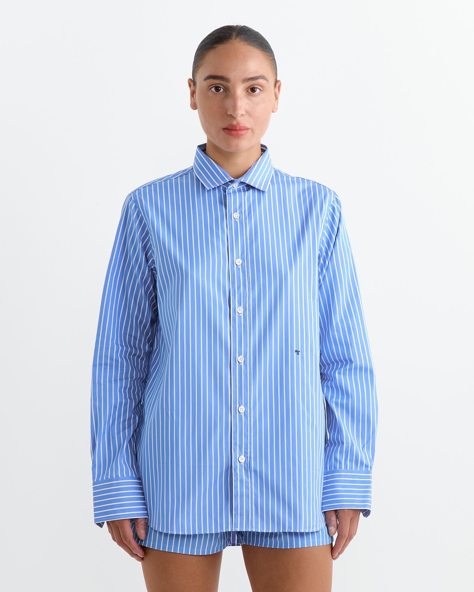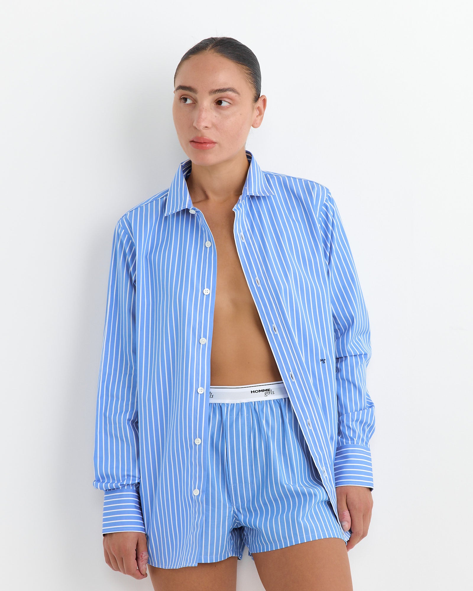 Hommegirls' Classic Shirt checks all the boxes with a classic menswear fit and classic shirting details such as a spread collar, a curved hemline with side slits that looks great open or tucked in, an embroidered 'Hg' mark at the front, and buttoned cuffs.