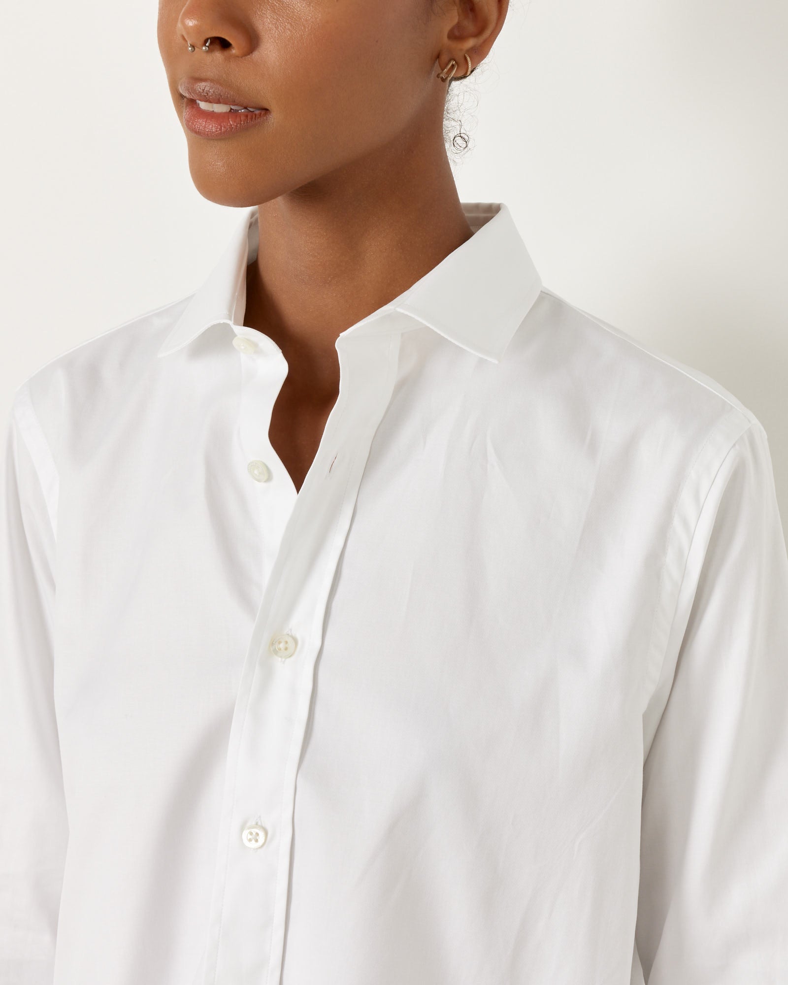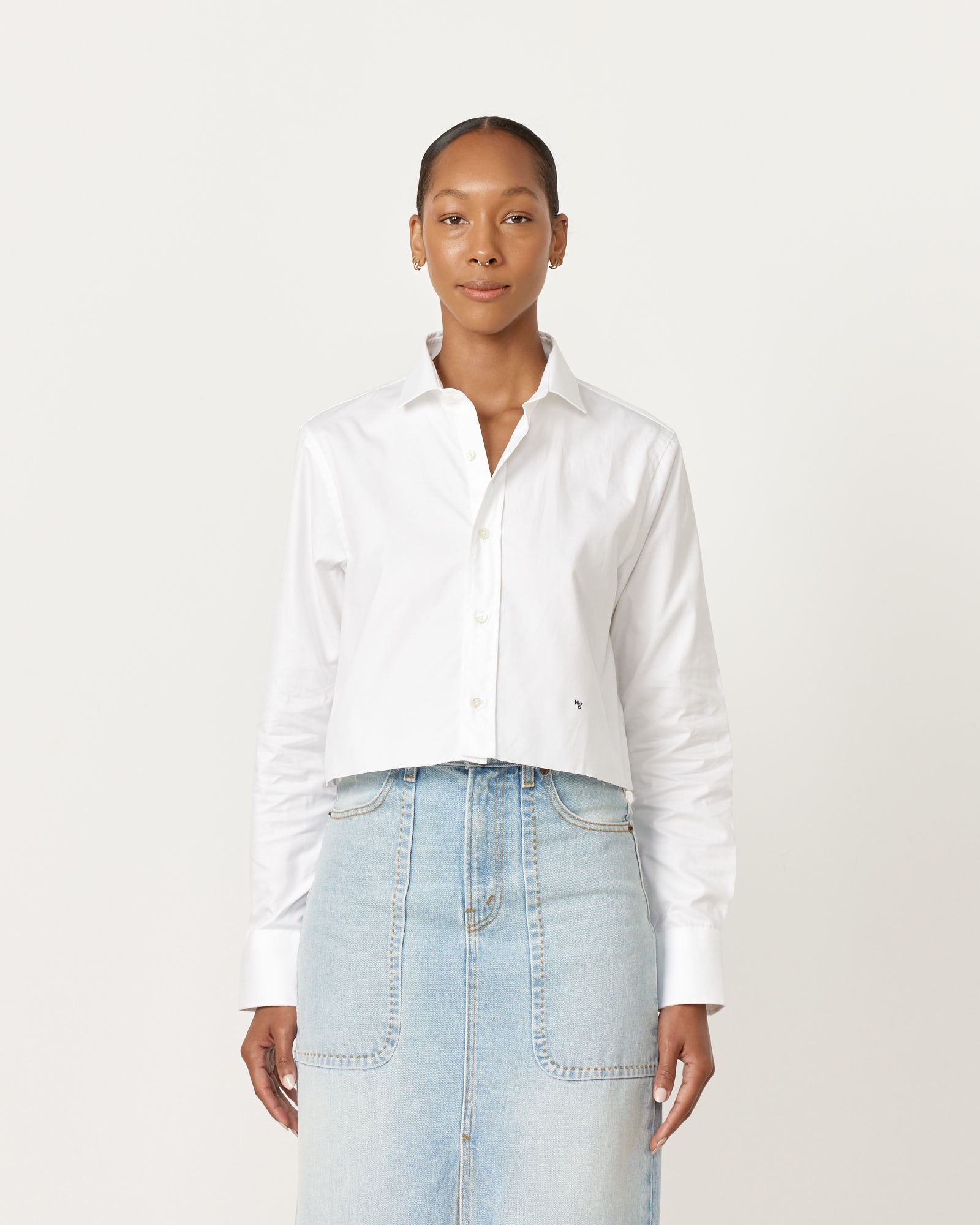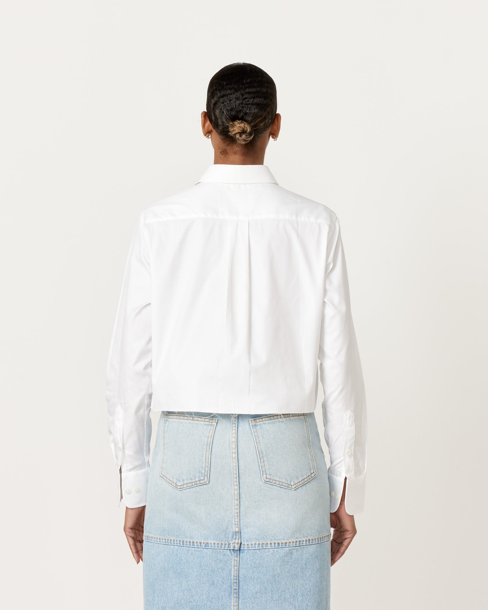 Hommegirls' Cropped Shirt checks all the boxes with a classic menswear fit updated with a striking crop, a point collar, a center back box pleat, an embroidered 'Hg' mark at the front, and buttoned cuffs.
