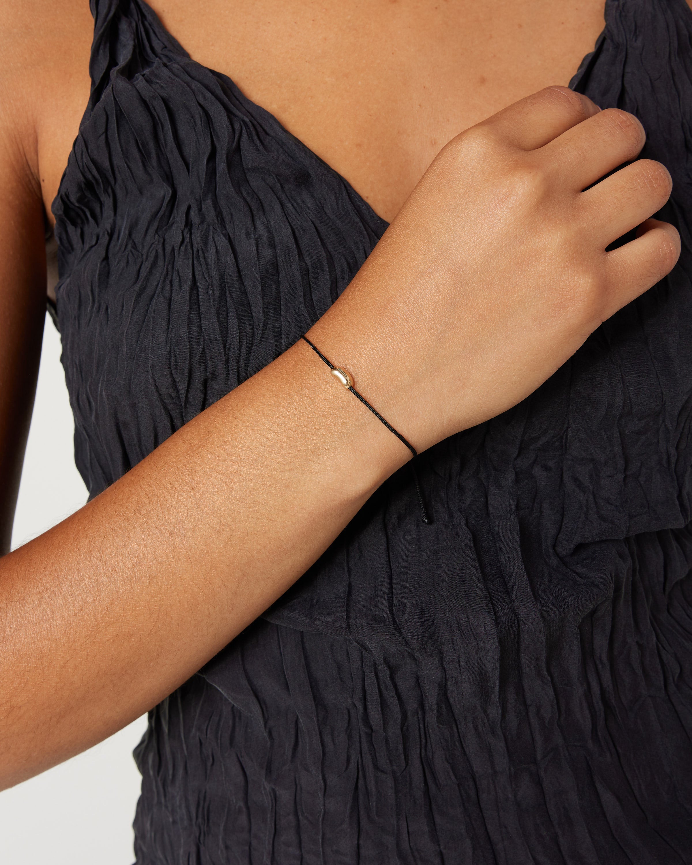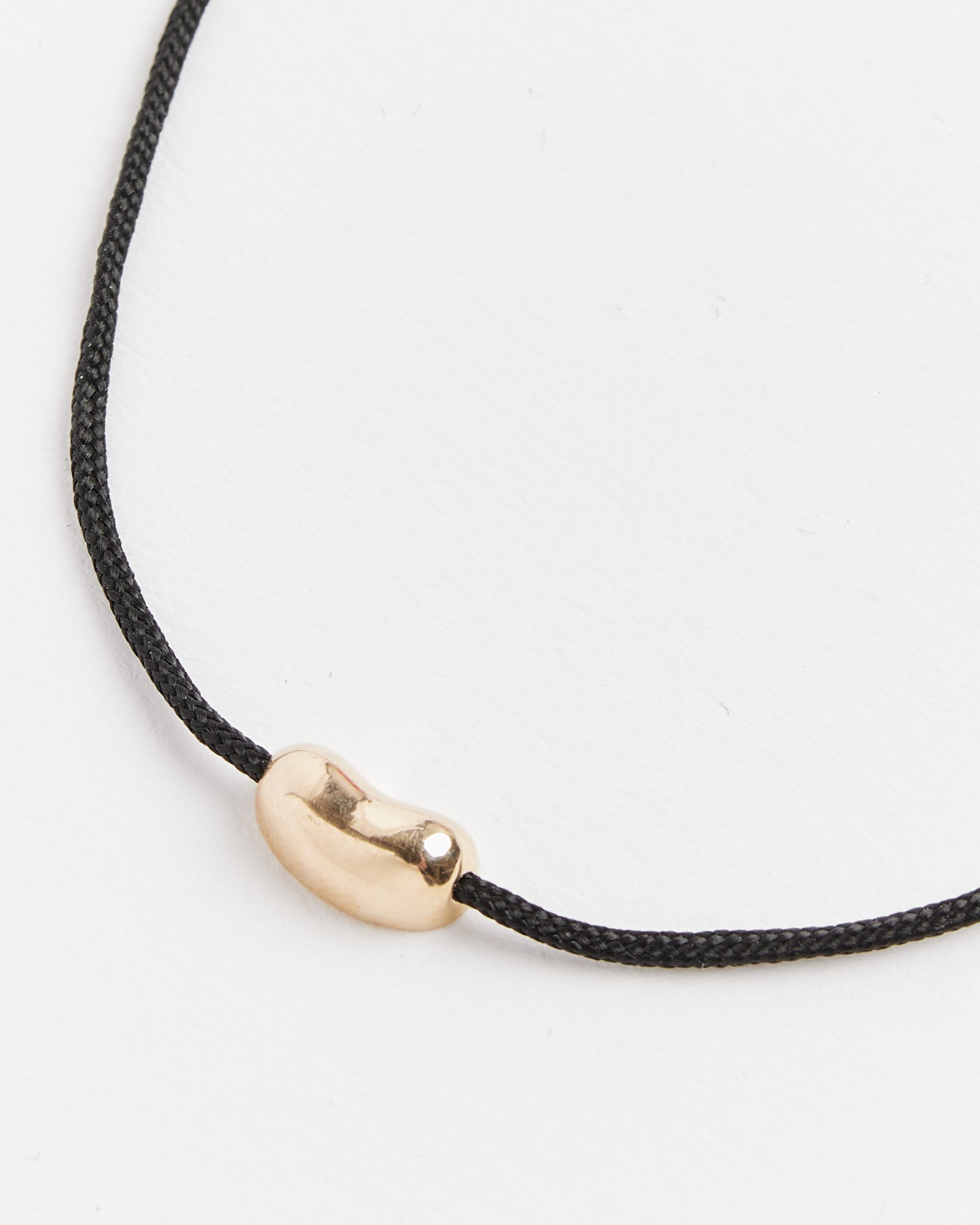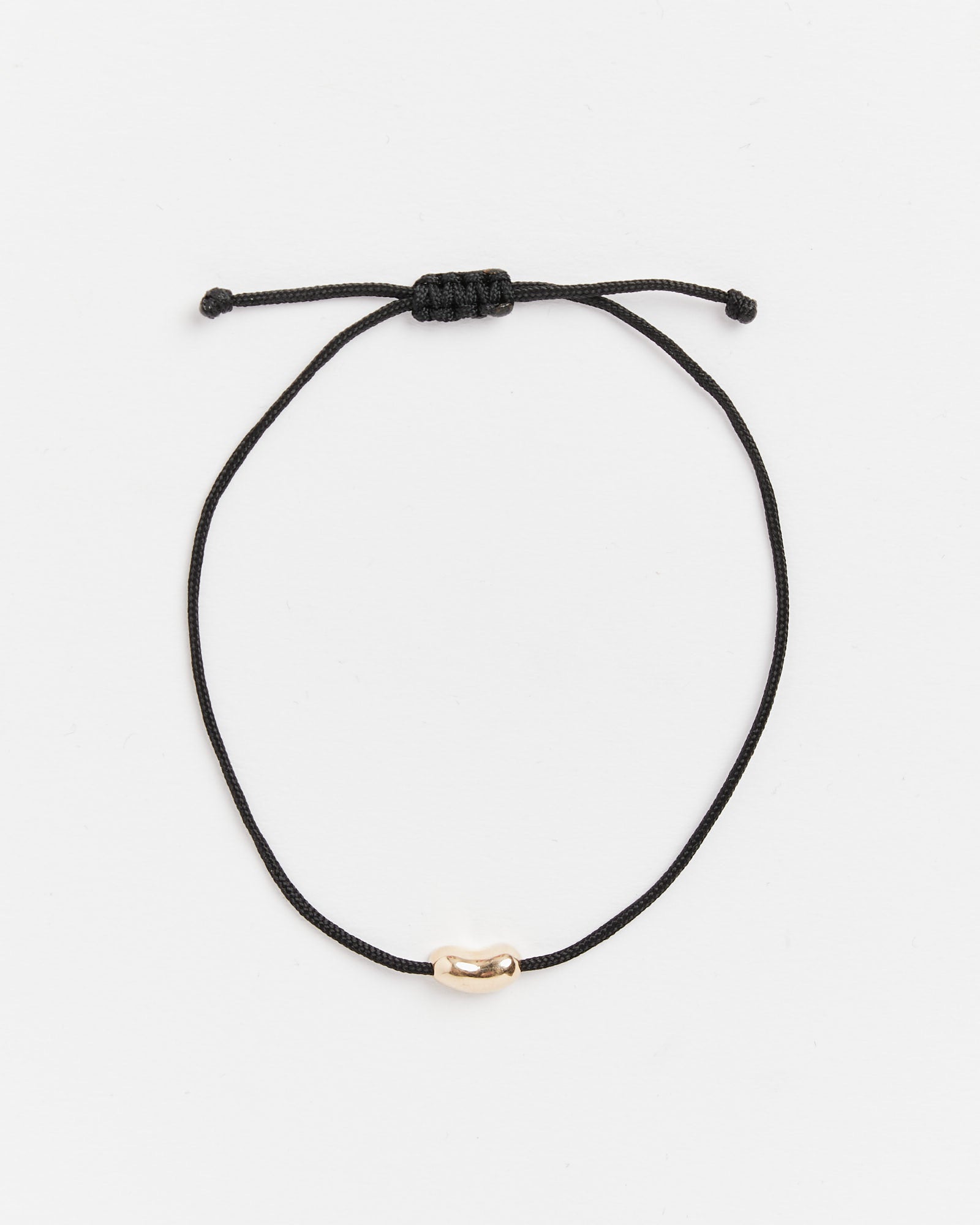A delicate, elegant accesory for the wrist, Hortense's Bean Cord Bracelet features an engravable 14k yellow gold bean strung on a contrasting black nylon cord.