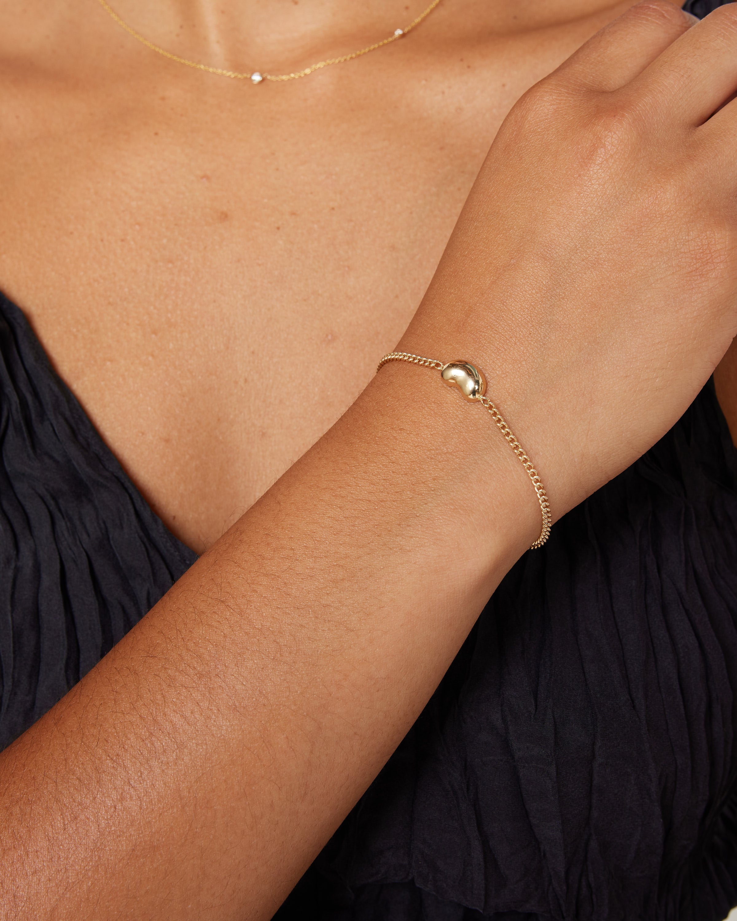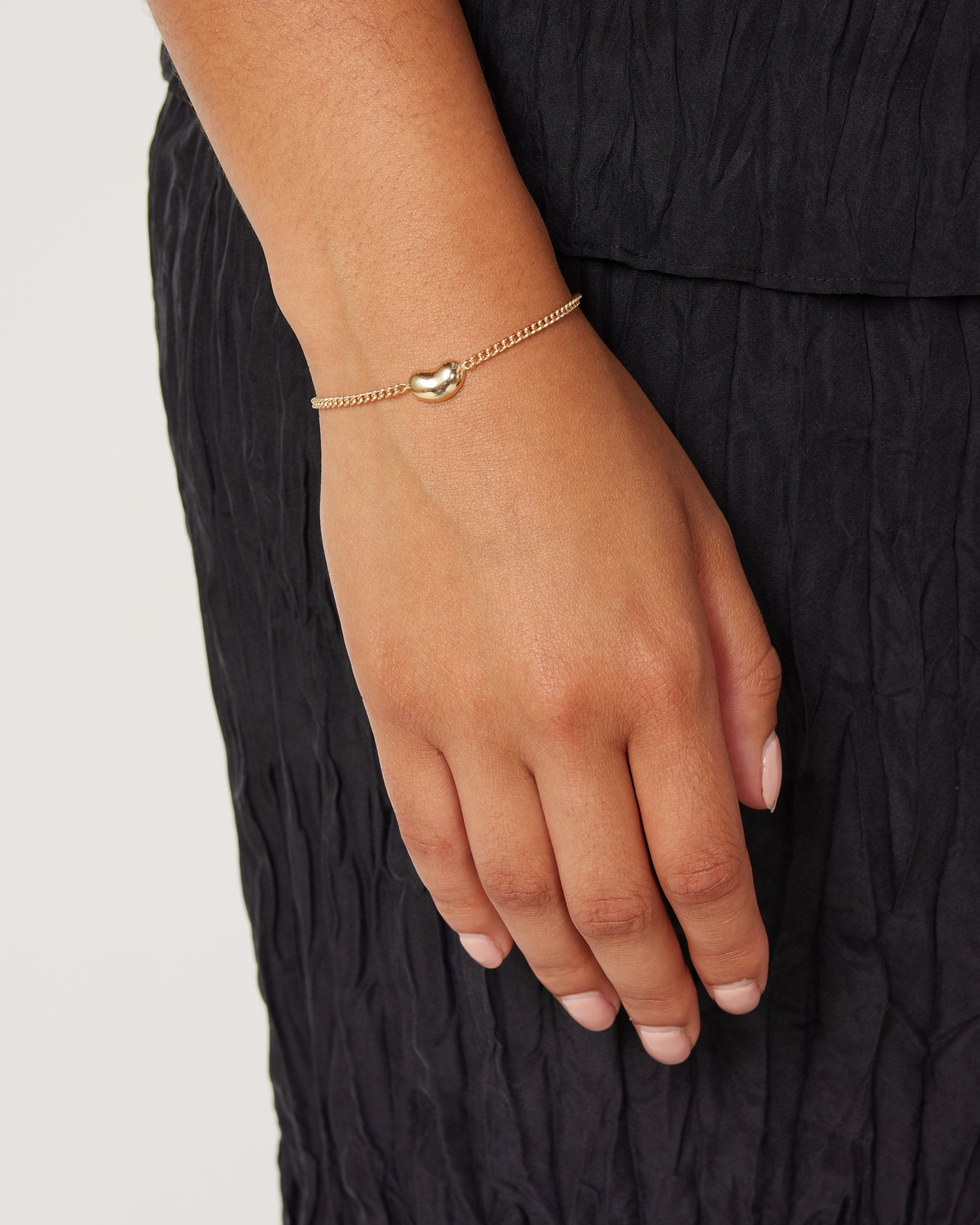 Hortense's 14k yellow gold Large Bean Cuban Chain Bracelet features an engravable bean charm on a beautiful Cuban link chain.