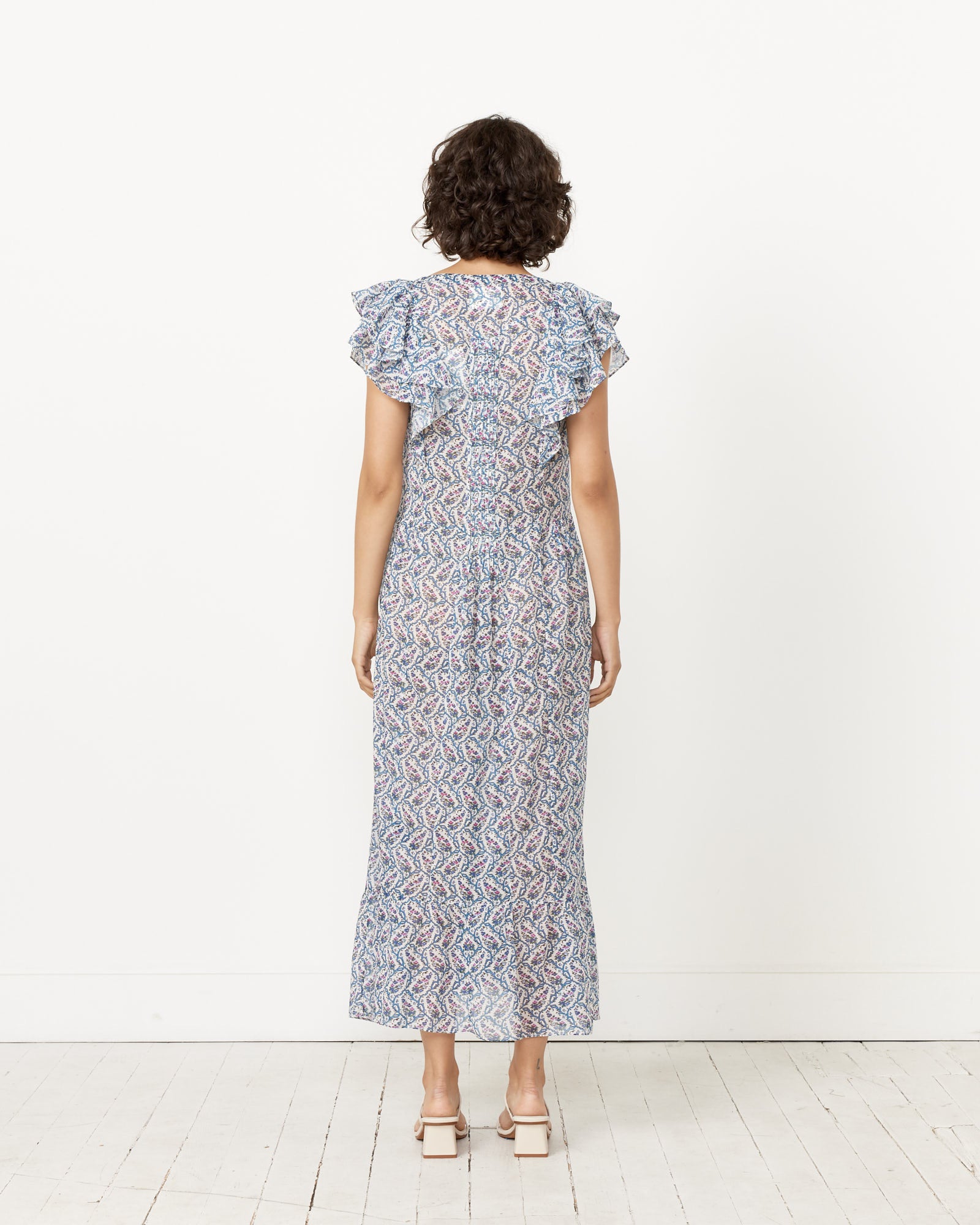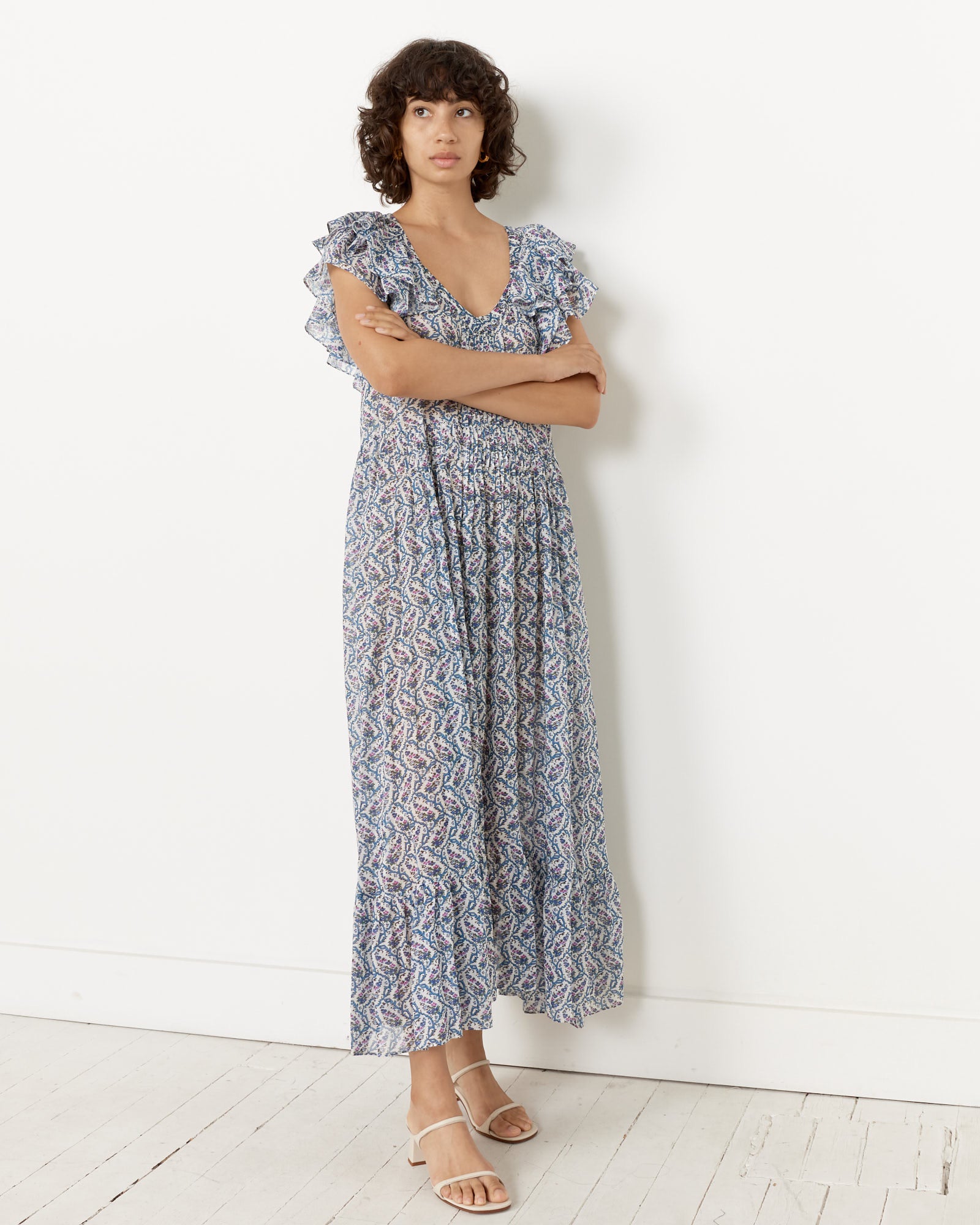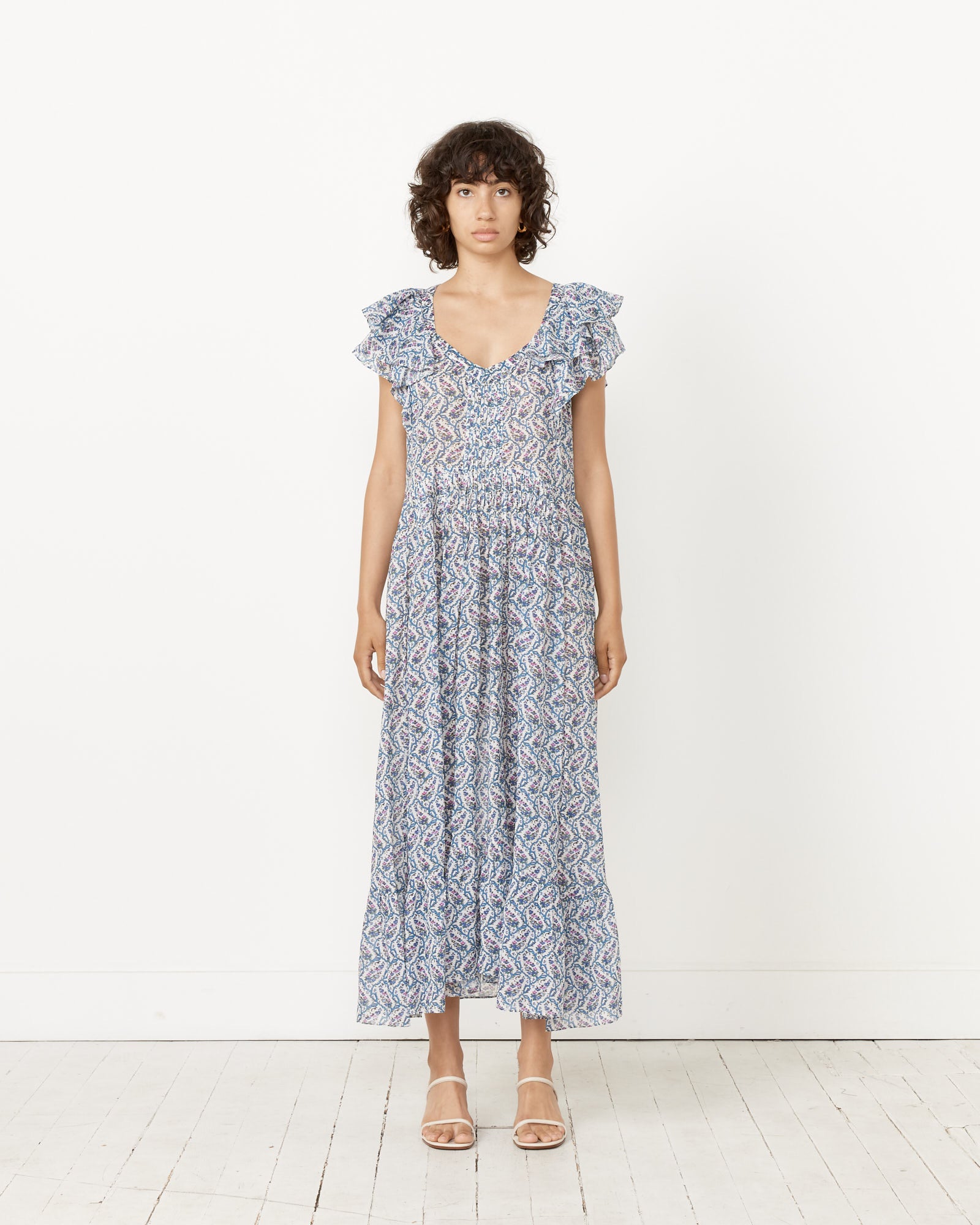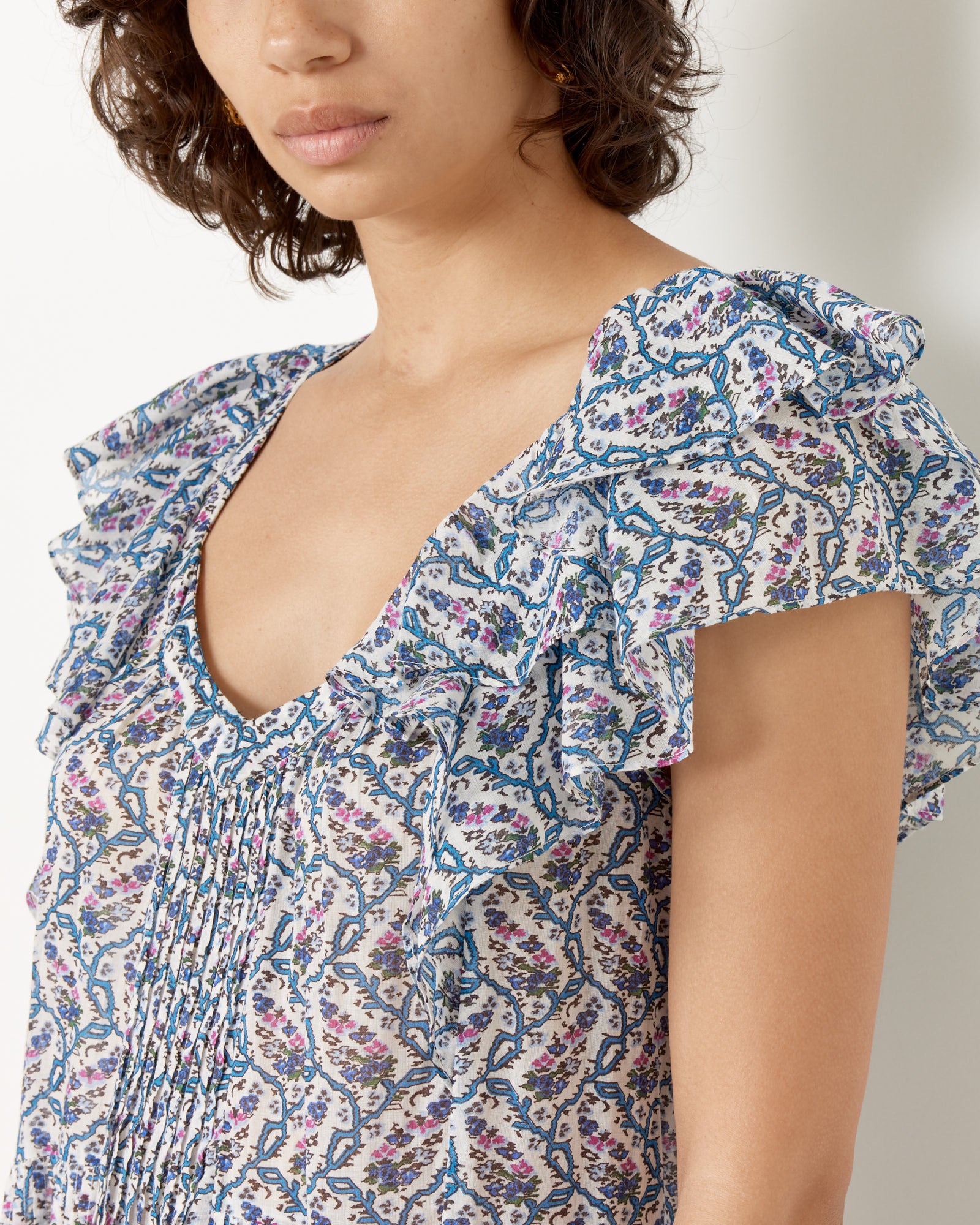 Isabel Marant Etoile's Godralia Dress features a zig-zag floral print across a semi-sheer cotton fabric cut in an A-line silhouette with a scoop neckline and ruffled sleeves.