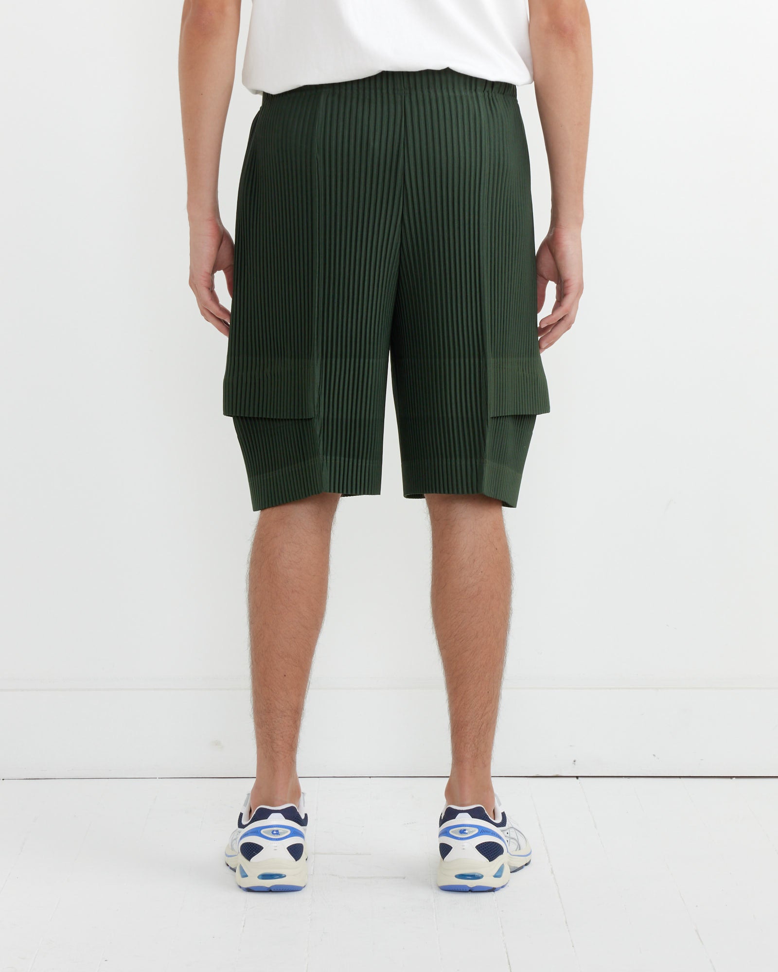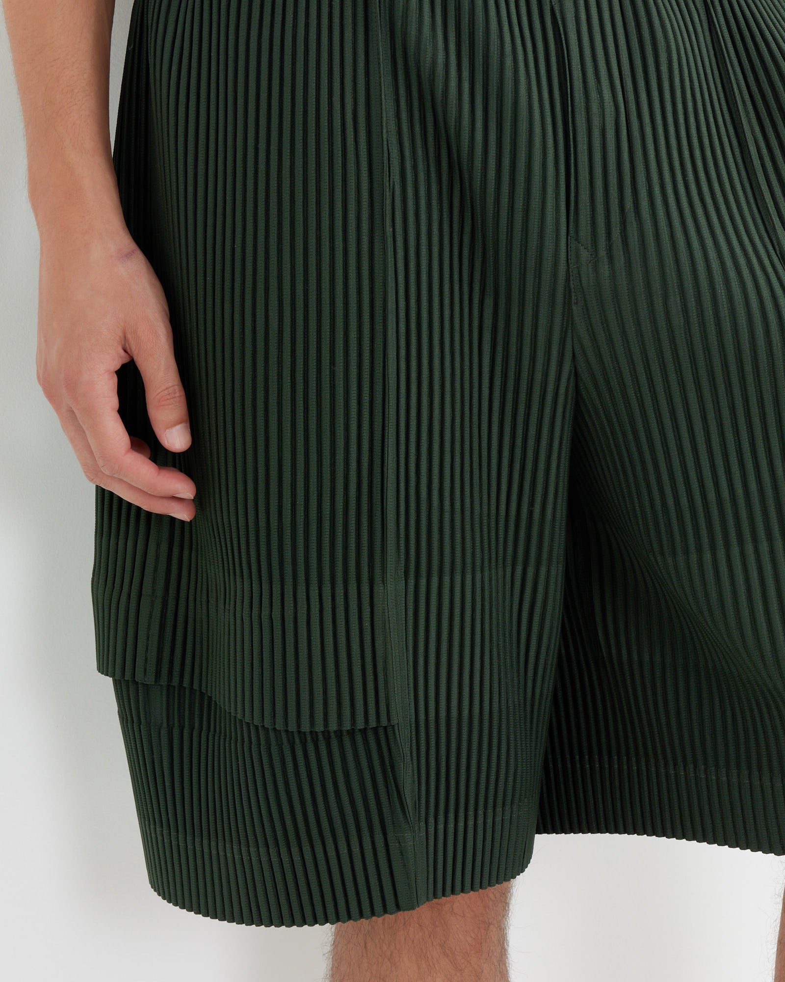Issey Miyake Homme Plisse's Cargo Shorts feature the brand's signature, highly packable, travel-friendly wrinkle-resistant garment-pleating cut in a relaxed, wide-leg silhouette with mock flap pockets at the outseams, pinched seams at the legs, and a concealed drawstring elasticized waistband with a button-fly.