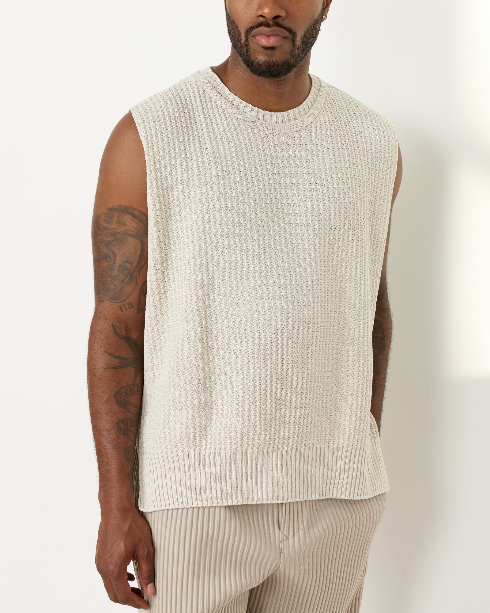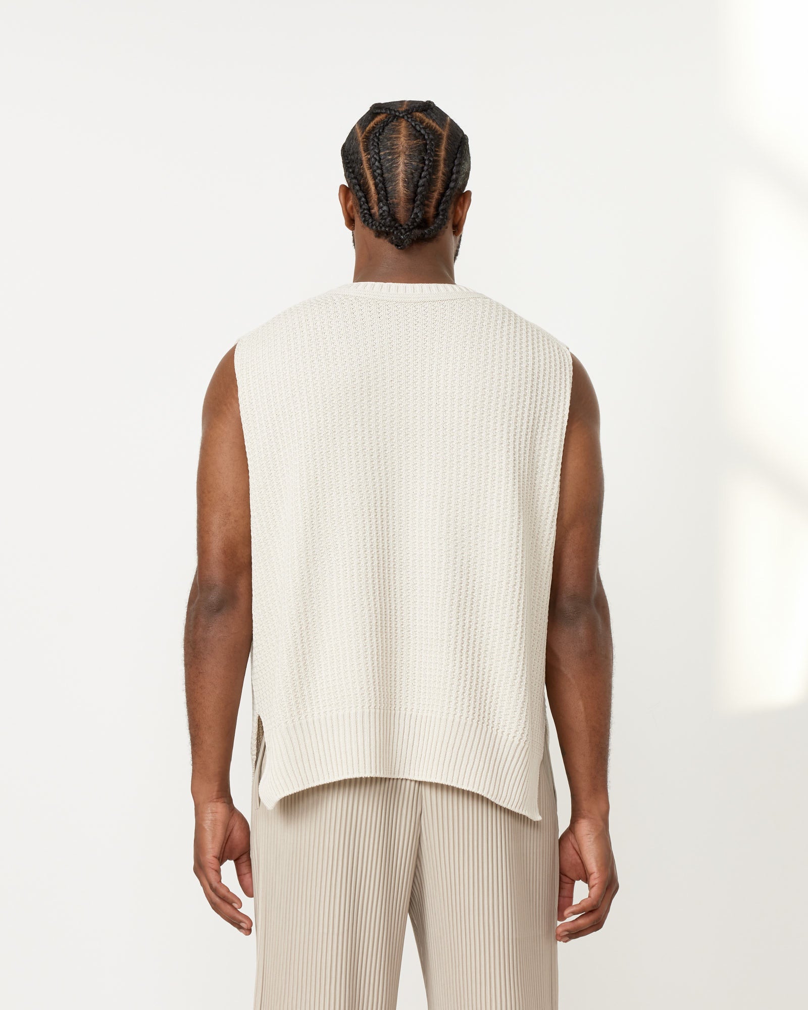 Issey Miyake Homme Plisse' Common Knit Vest is crafted from soft cotton yarn, providing a lightweight feel that's ideal for spring and summer, with the added versatility of being able to be worn reversed to reveal the parallel lines of a pleated jersey for added dimensionality.