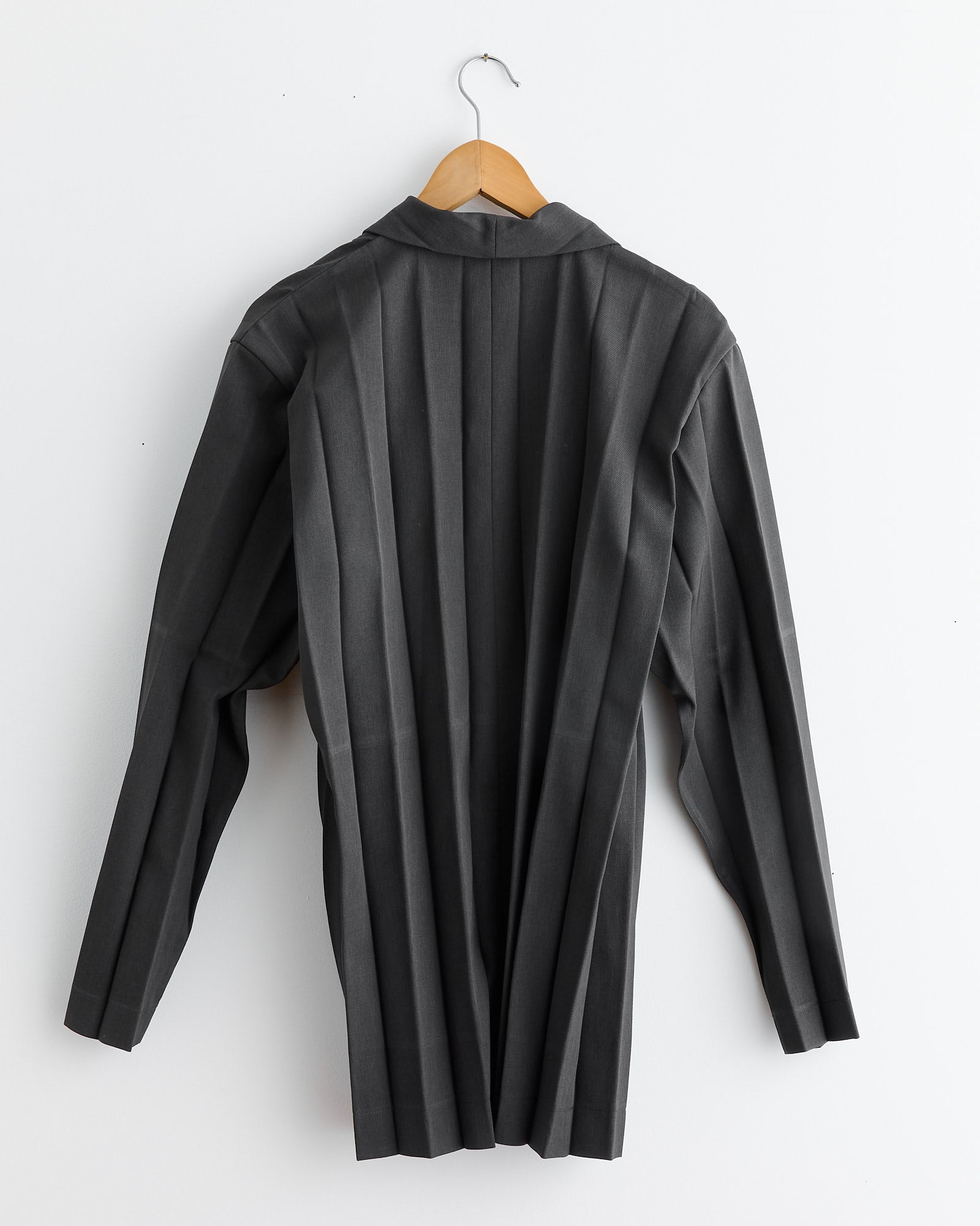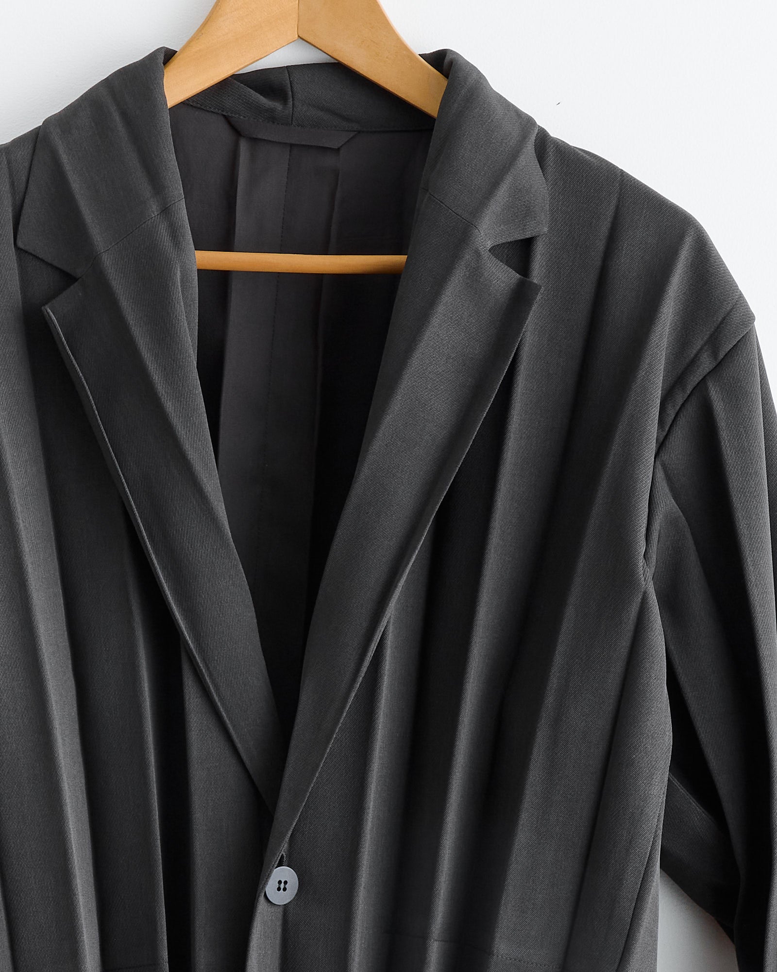 The Issey Miyake Homme Plissé Edge Ensemble Jacket in Dark Brown is a tailored piece featuring wide accordion pleats and a semi-gloss finish for a refined look. It has a classic button-front closure and is designed to offer a formal, yet dynamic silhouette. The jacket is part of the Edge Ensemble series, characterized by winter suiting styles with innovative pleating techniques.