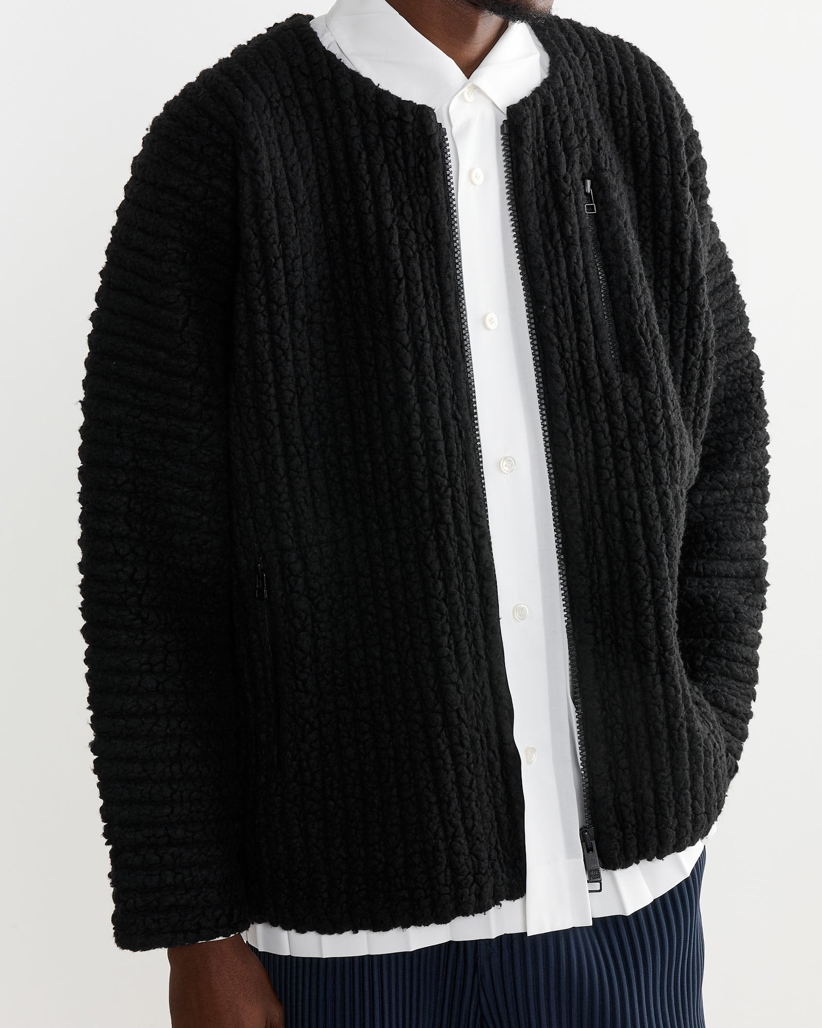 The Homme Plissé Issey Miyake Fleece Pleats Jacket in black features the brand's signature pleating technique, offering a modern and versatile design. Its lightweight construction ensures comfort and ease of movement.