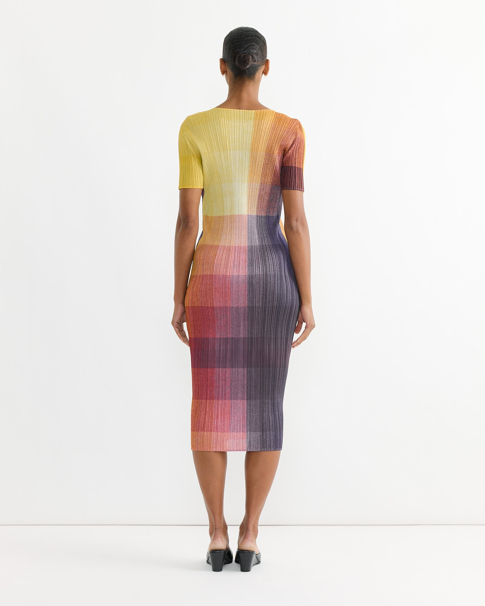 The Issey Miyake Pleats Please Photon Dress in yellow is a sleeveless dress featuring an original color chart print with beautifully overlapping colors. The pattern incorporates a stencil printing texture as-is to express the look of photons.