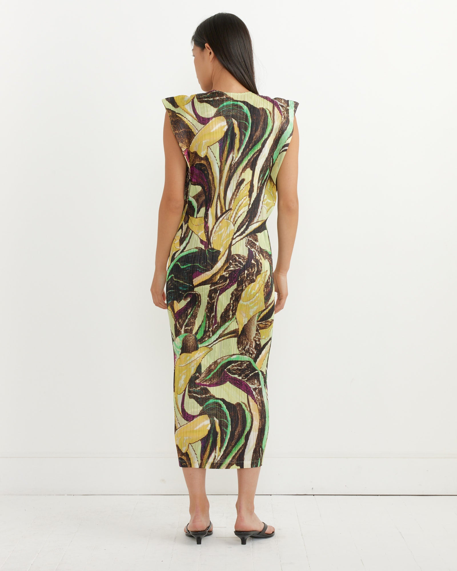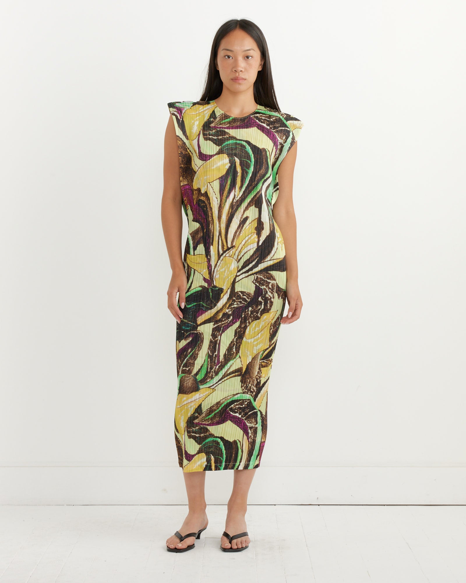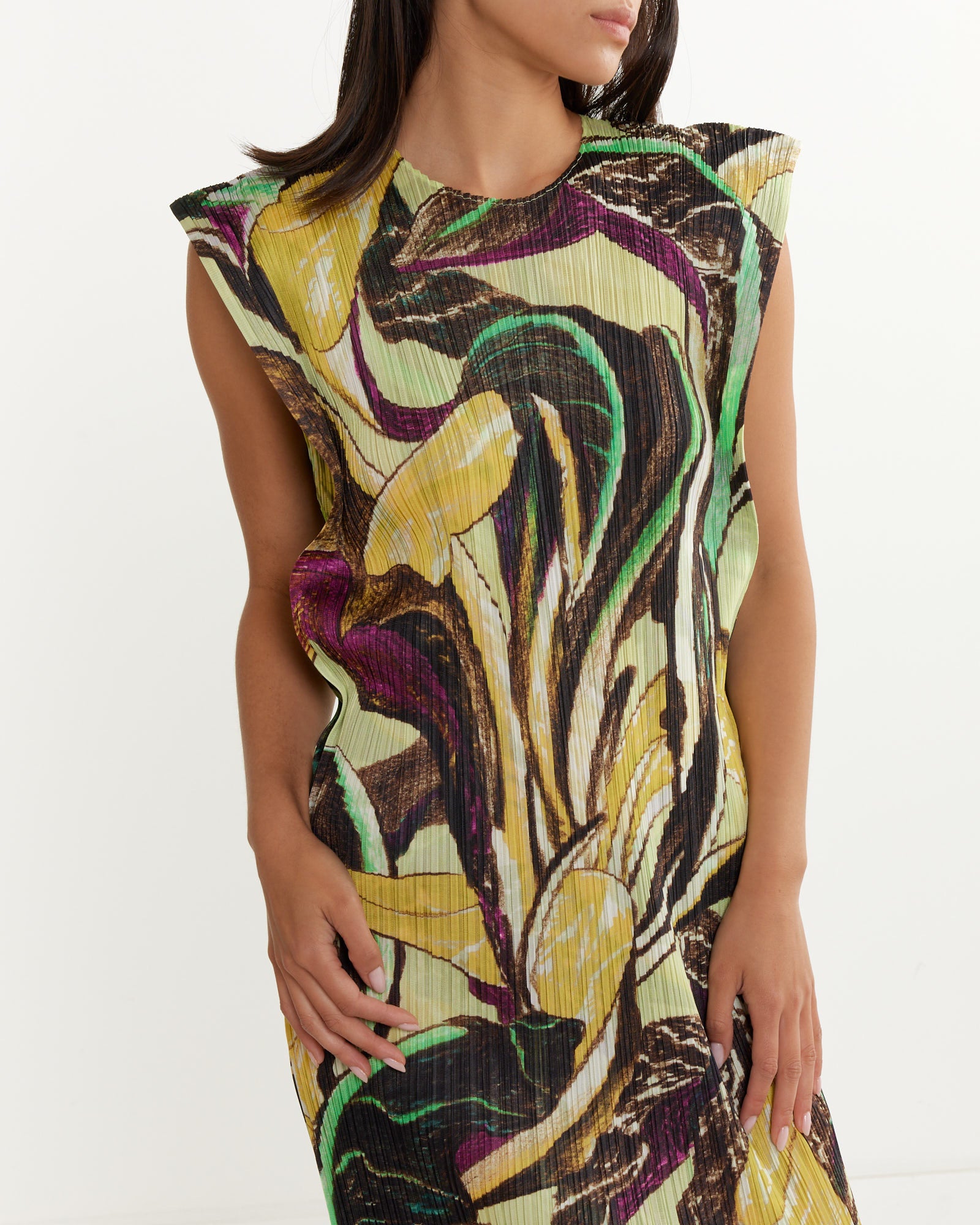 Done in a printed version of Issey Miyake's iconic all-over garment-pleated fabric that's highly comfortable and wrinkle-resistant, making it ideal for travel, the Tardivo Dress features vivid imagery inspired by its namesake vegetable, a straight silhouette, and accentuated short sleeves.
