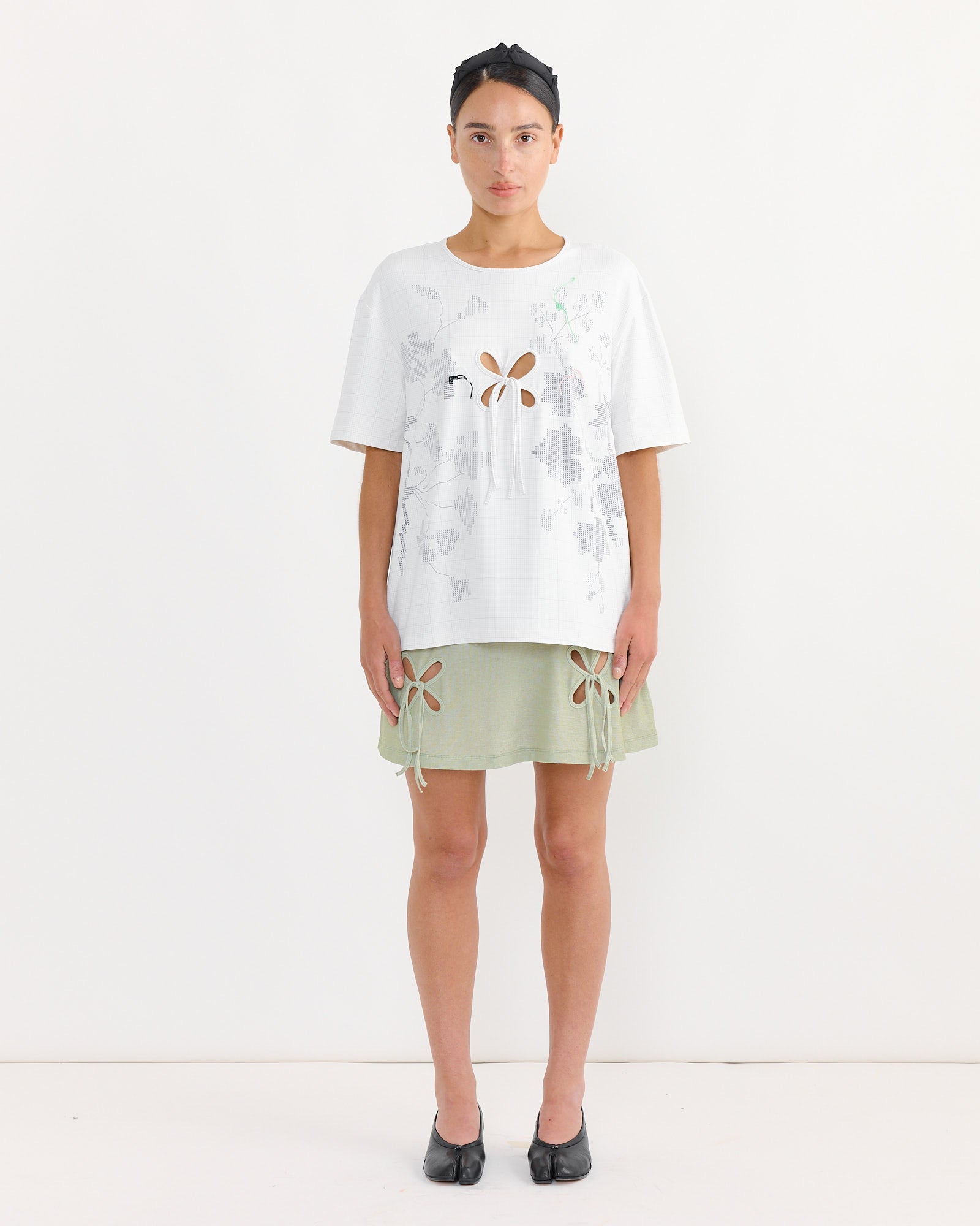 The J. Kim Embroidery Scheme Petal T-Shirt in Black/White is a relaxed-fit nylon tee featuring an allover embroidery template made up of the letters “J,” “K,” “I,” and “M,” accented with cross-stitch details. A petal-shaped self-tie cutout at the chest adds dimensional contrast. The printed scheme draws from interior imagery—floor lamps, flowers, and nostalgic household elements.